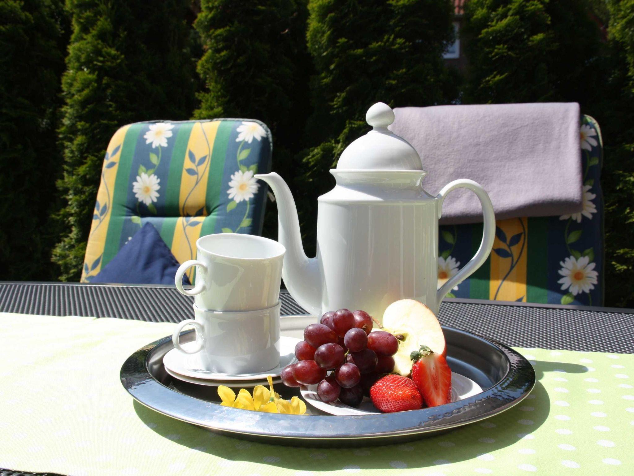 Die separate Küche ist sehr gut ausgestattet. Dazu gehört neben dem 12-teiligen Geschirr (Friesland-Porzellan) und Besteck eine moderne Küchenzeile. Die Ausstattung umfasst: - Spülmaschine - Kühlschrank mit Gefrierfach - Mikrowelle - Elektroherd mit Ceranfeld, Backofen und Dunstabzug - Kaffeemaschine, Toaster, Wasserkocher und Eierkocher - Edelstahltöpfe und Pfannen Im Hauswirtschaftsraum neben der Küche befinden sich die Heizungsanlage und - Waschmaschine, Wäsche-Trockner (Abluft) - Staubsauger - Bügeleisen, Bügelbrett - Kinderhochstuhl
