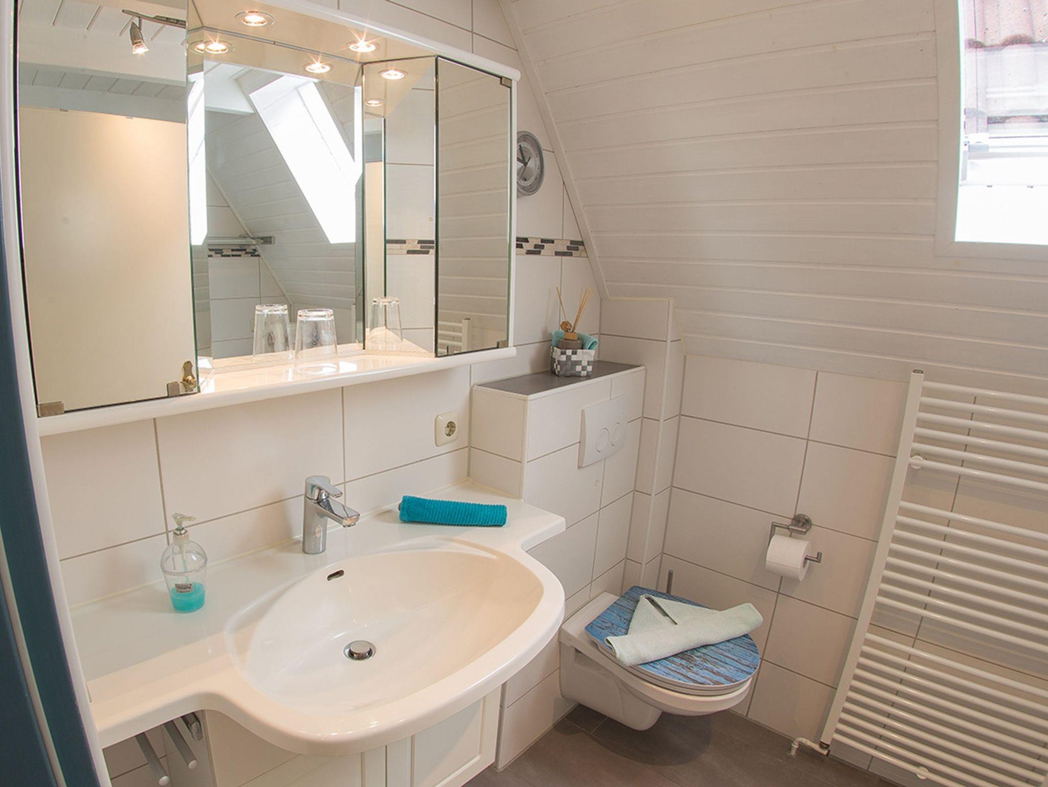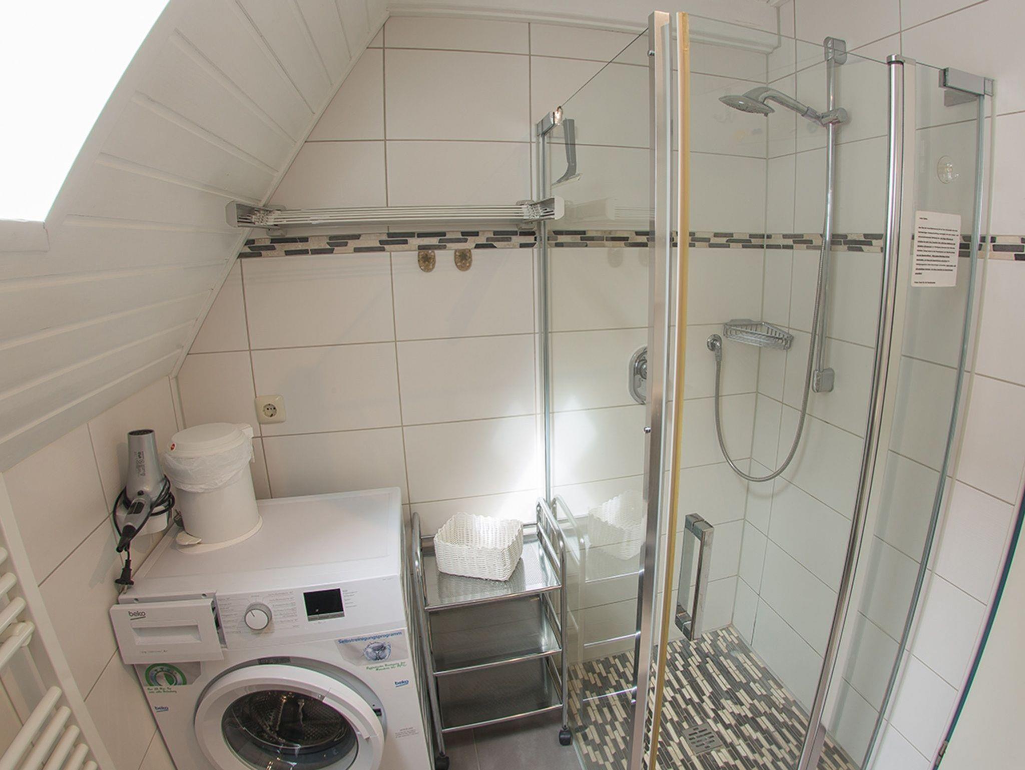 Das Duschbad hat Tageslicht und eine ebenerdige Dusche; eine Waschmaschine ist ebenfalls vorhanden.