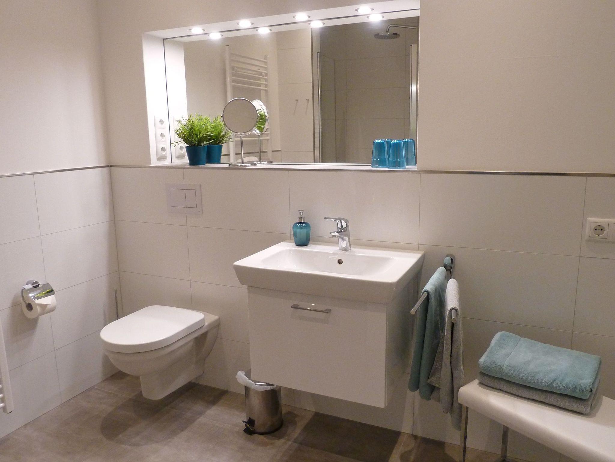 ein helles, luxuriöses Bad mit Dusche und viel Platz für Ihre Utensilien
