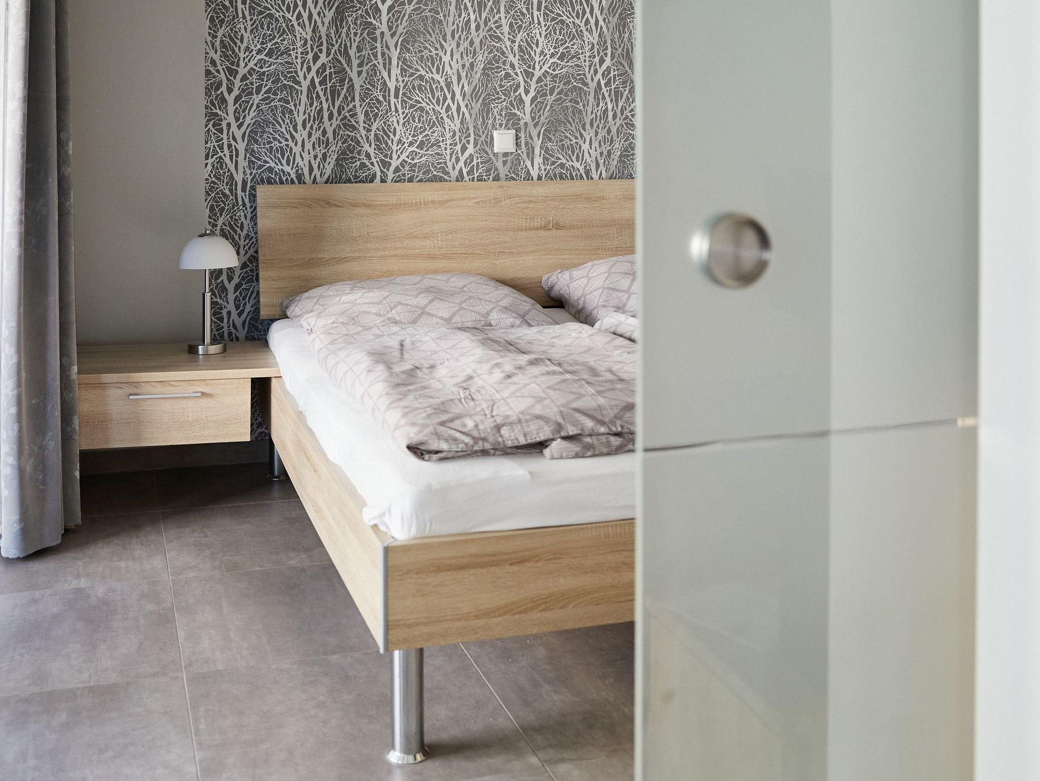 Das hochwertige Duschbad mit WC ist mit einer bodengleichen Dusche, Handtuchheizung sowie beleuchtetem Spiegel komfortabel und modern gestaltet. Auch das Schlafzimmer mit Doppelbett, einem weiteren Flachbildschirmfernseher und direktem Zugang zum Bad und zur Loggia bietet höchsten Komfort.