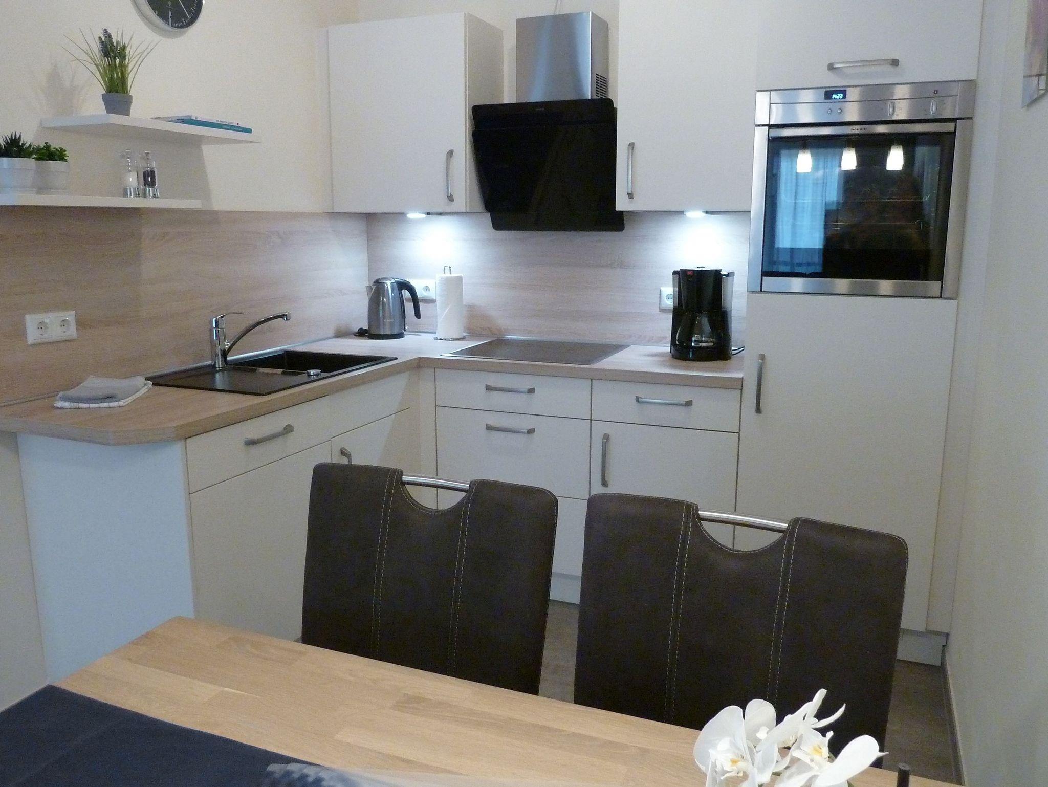 Im Apartment erreichen Sie durch den Flur den großzügig geschnittenen Wohn- und Essbereich mit direktem Zugang zur Loggia. Dieser lichtdurchfluteter Wohnbereich lädt zum Entspannen und relaxen ein. Die moderne Küche bietet Ihnen Komfort vom kleinen Frühstück bis zum Menü zu Zweit.