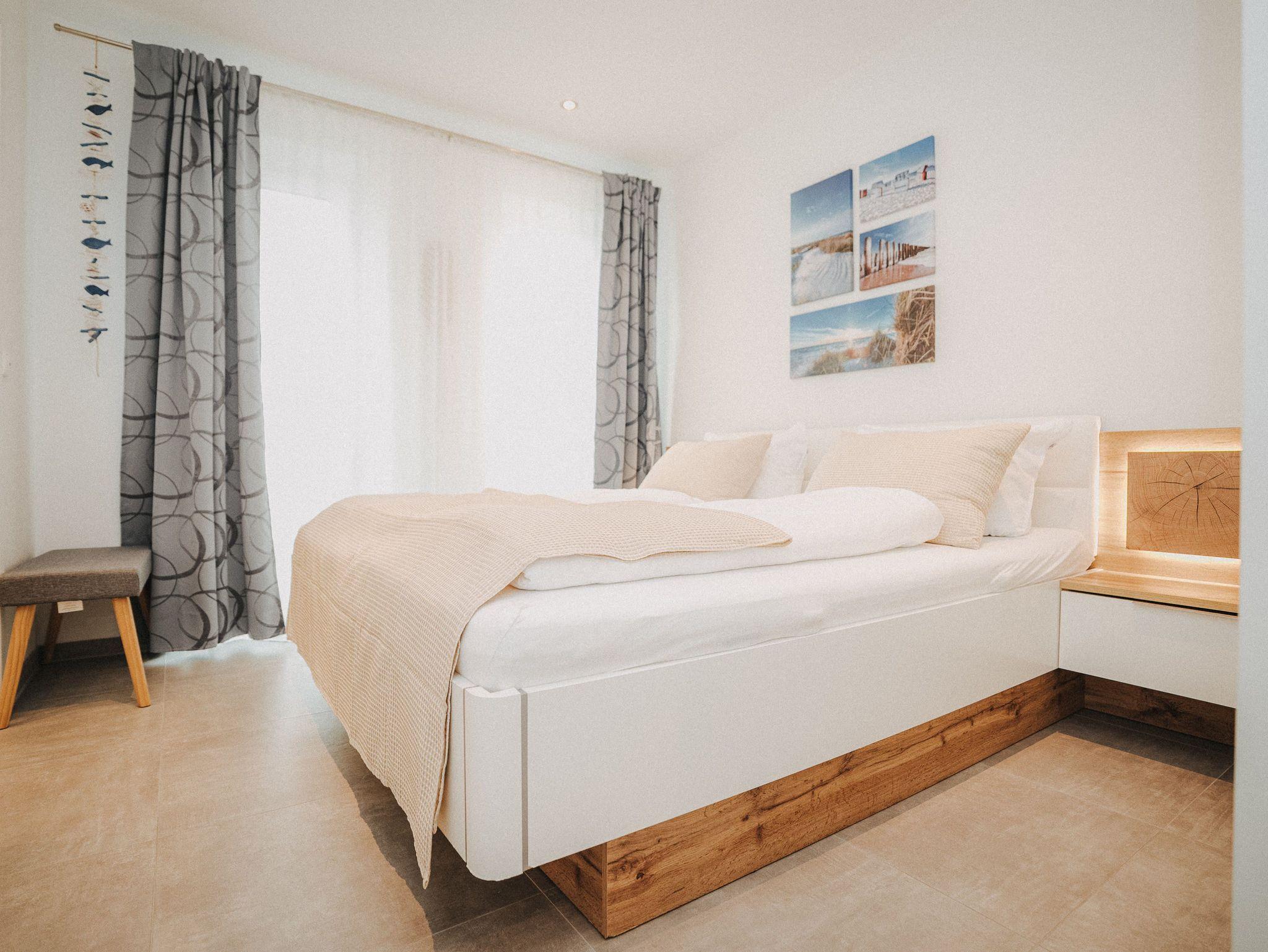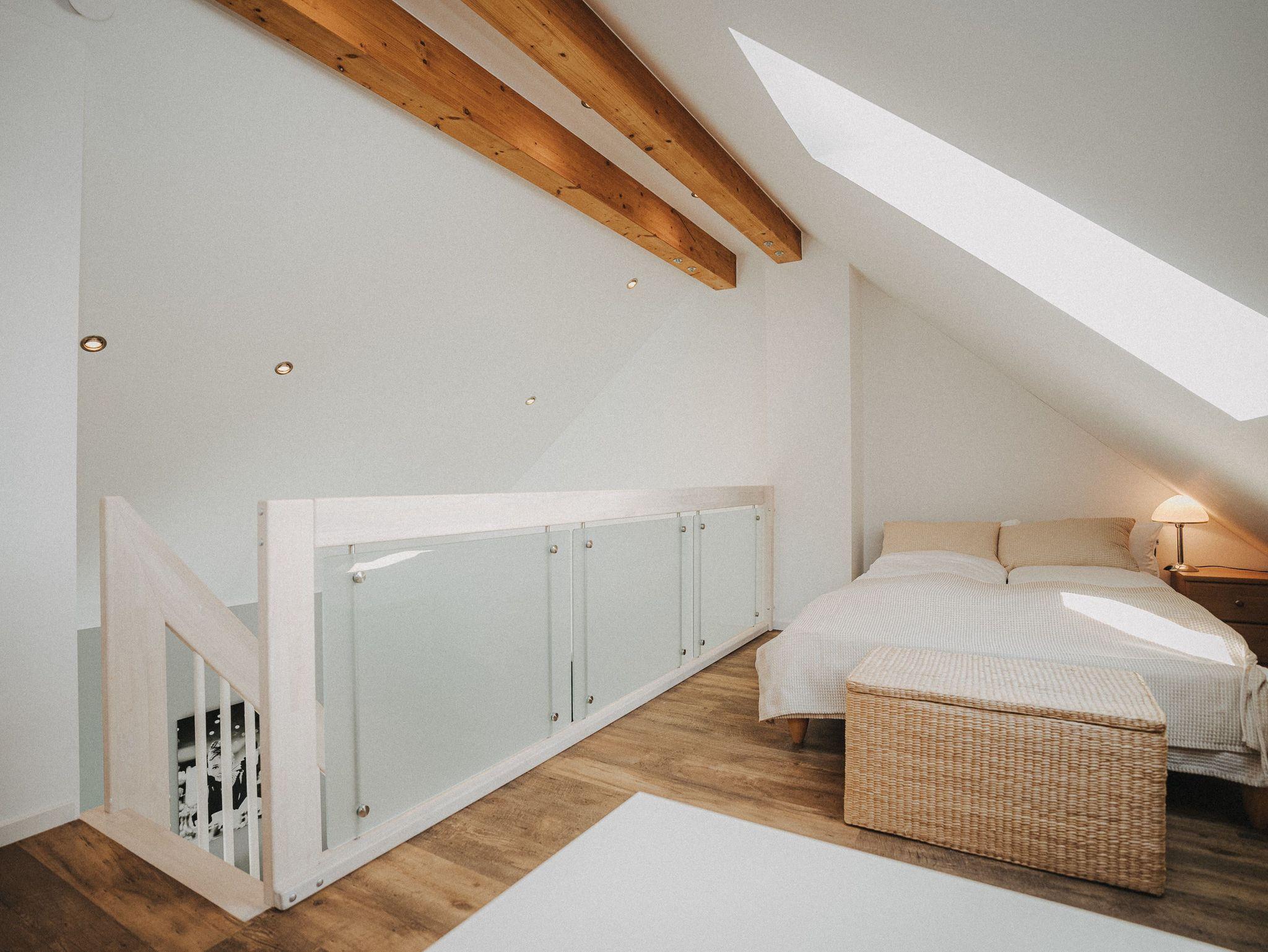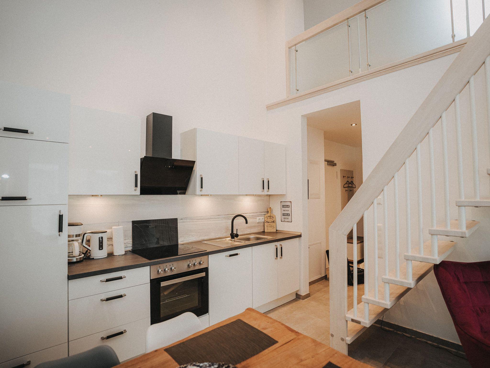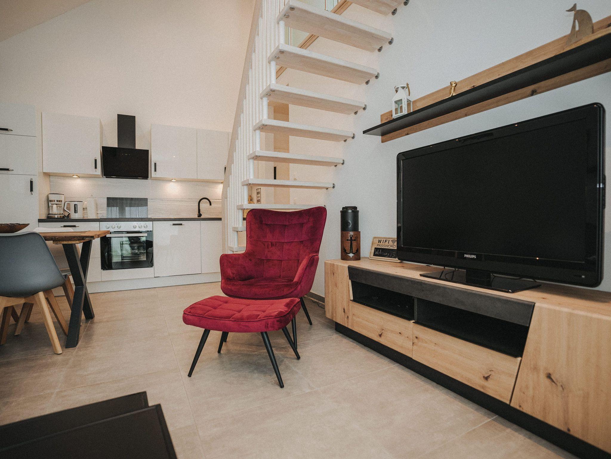 Willkommen! Es empfängt Sie ein heller Eingangsbereich mit Flur und Garderobe. Stärken Sie sich in der voll ausgestatteten Küchenzeile mit Essbereich - Entspannung finden Sie im integrierten Wohnbereich - Ziehen Sie sich zurück ins Schlafzimmer mit Doppelbett , Kleiderschrank und zusätzlichem Flat-TV. Von hier aus gelangen Sie in das komfortable Duschbad mit Flacheinstieg und Regendusche - Relaxen Sie auf dem Balkon mit Mobiliar - Es steht Ihnen ein geräumiger Abstellraum zur Verfügung. Hier befinden sich Waschmaschine und Trockner. Eine steilere Treppe führt hinauf auf die Empore mit einem weiteren Doppelbett.
