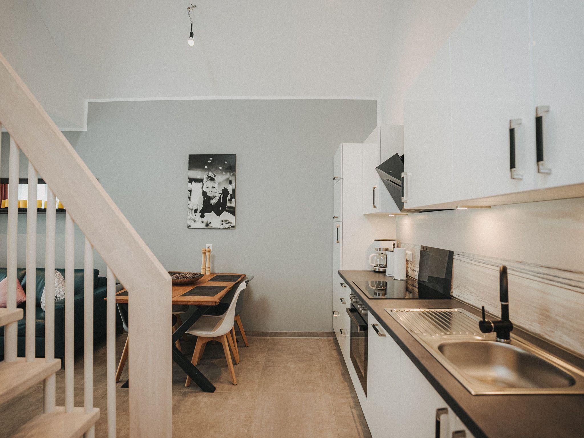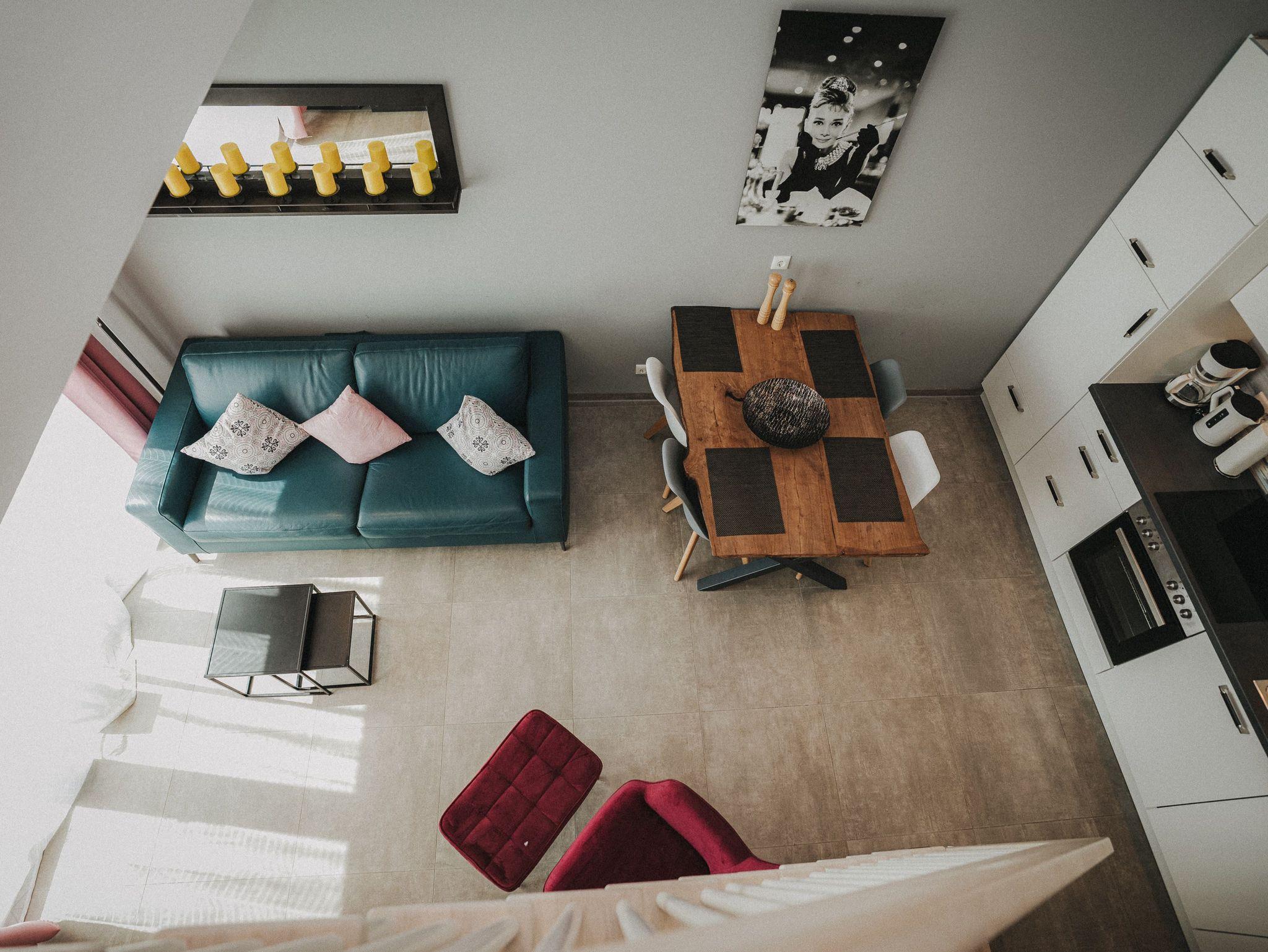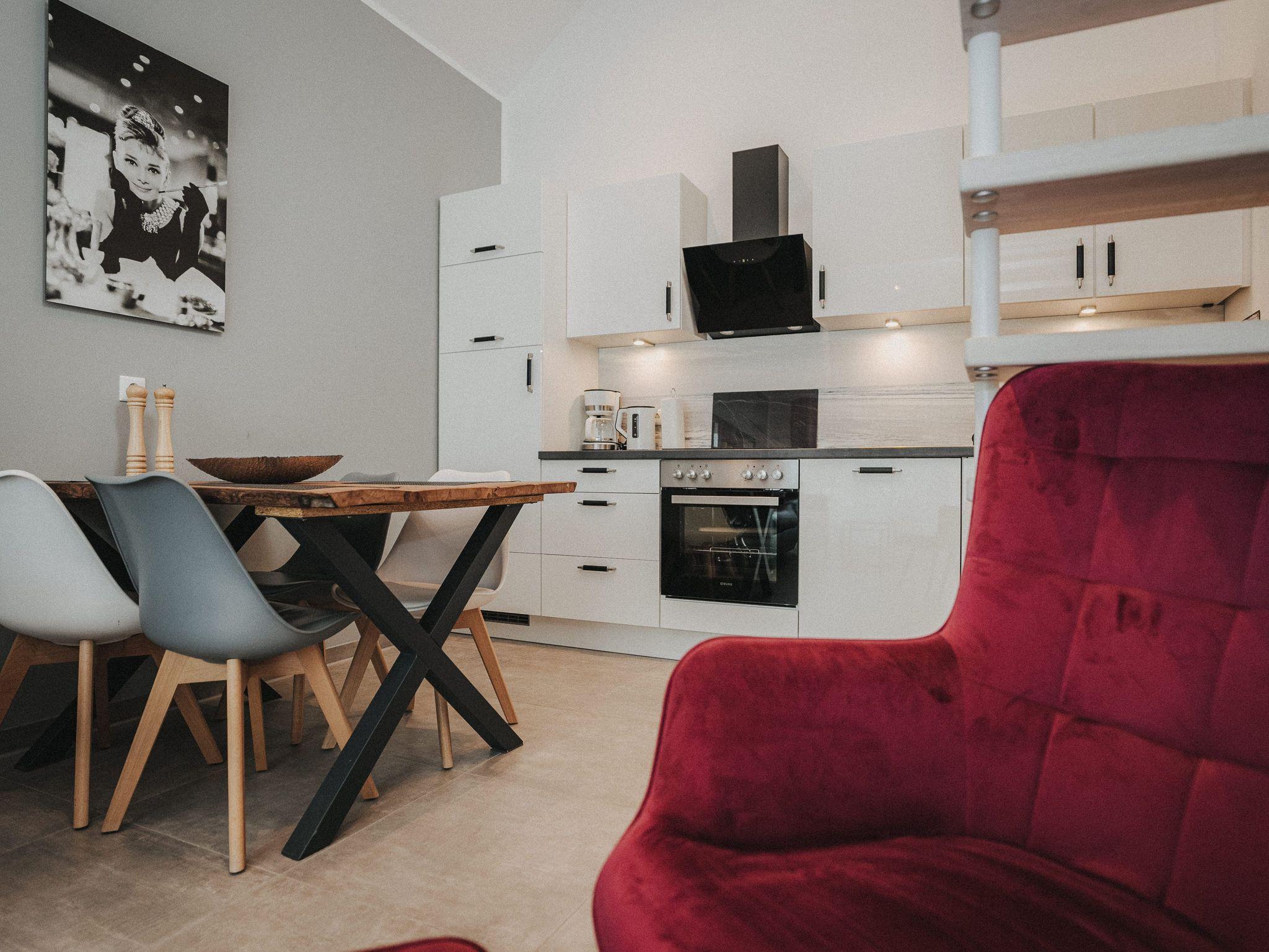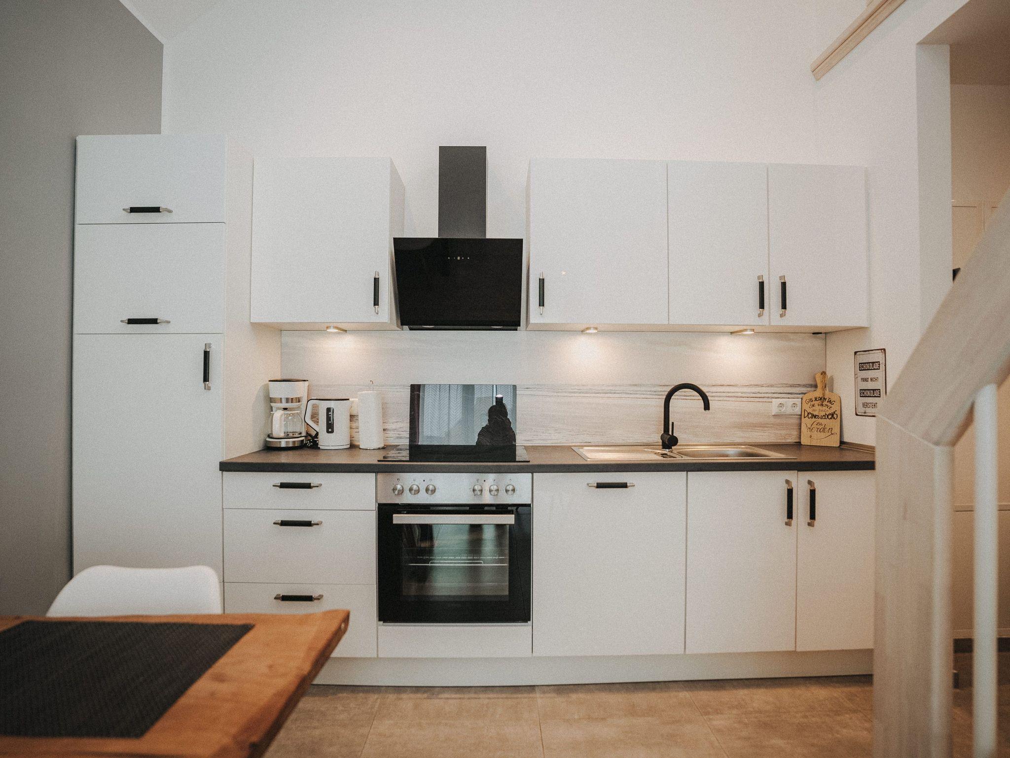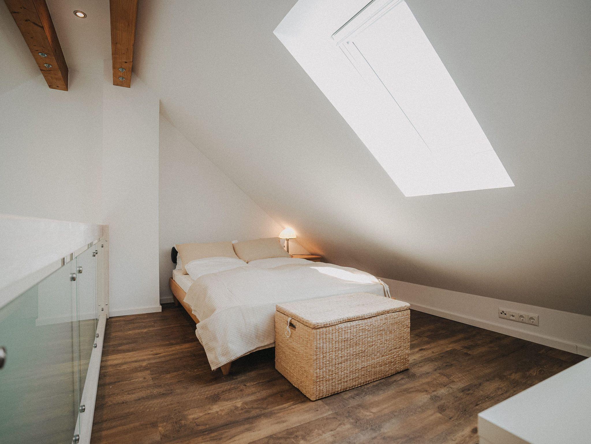 Willkommen! Es empfängt Sie ein heller Eingangsbereich mit Flur und Garderobe. Stärken Sie sich in der voll ausgestatteten Küchenzeile mit Essbereich - Entspannung finden Sie im integrierten Wohnbereich - Ziehen Sie sich zurück ins Schlafzimmer mit Doppelbett , Kleiderschrank und zusätzlichem Flat-TV. Von hier aus gelangen Sie in das komfortable Duschbad mit Flacheinstieg und Regendusche - Relaxen Sie auf dem Balkon mit Mobiliar - Es steht Ihnen ein geräumiger Abstellraum zur Verfügung. Hier befinden sich Waschmaschine und Trockner. Eine steilere Treppe führt hinauf auf die Empore mit einem weiteren Doppelbett.