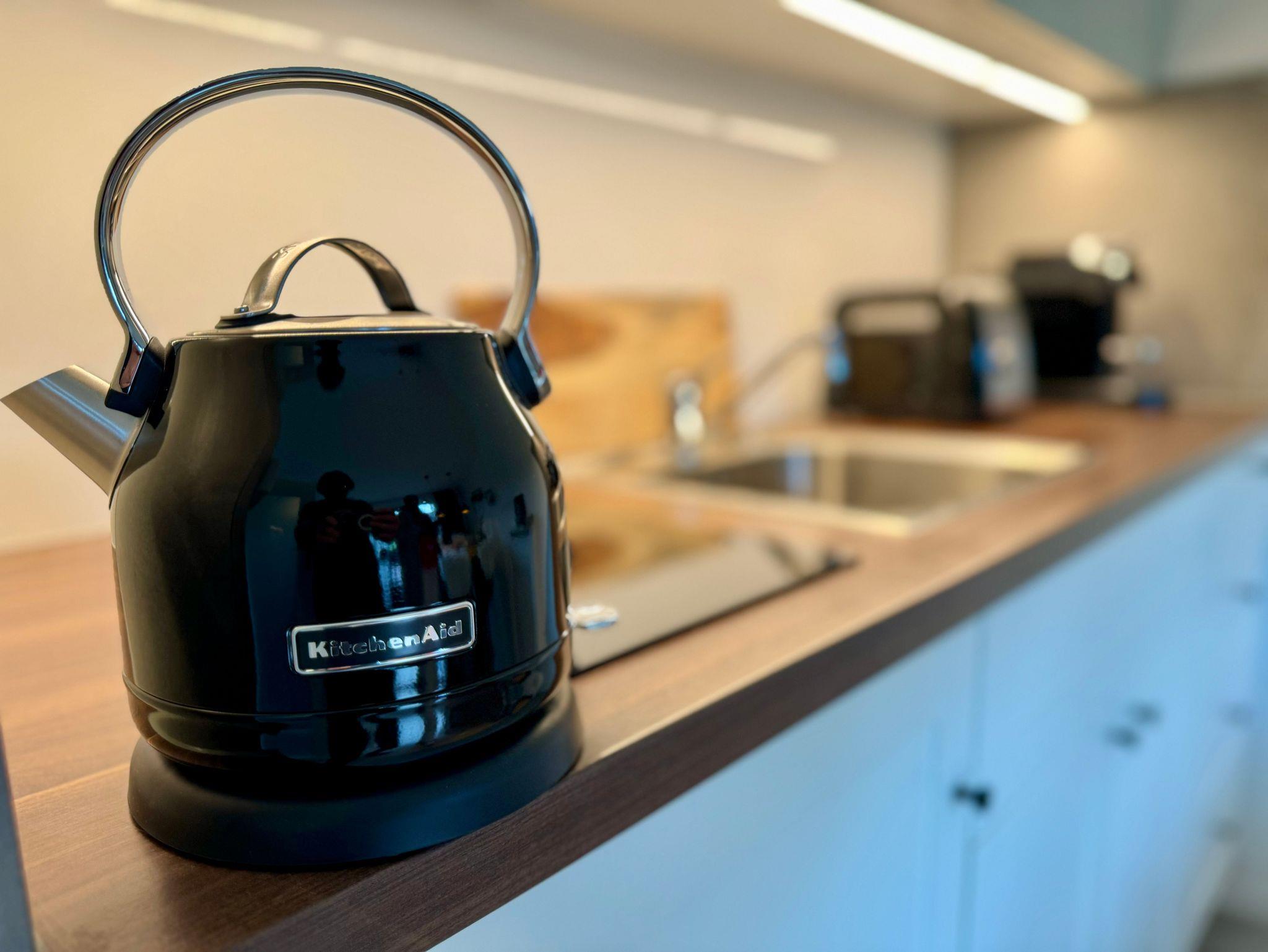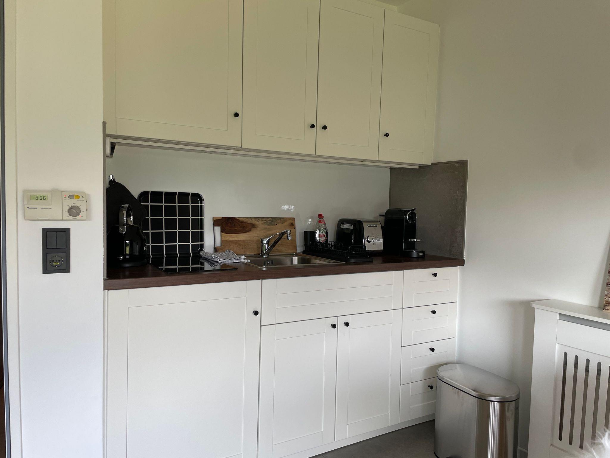 Die moderne Küchenzeile ist mit einem Kühlschrank, Herd, Kaffeemaschine, Wasserkocher und allen wichtigen Dingen ausgestattet.