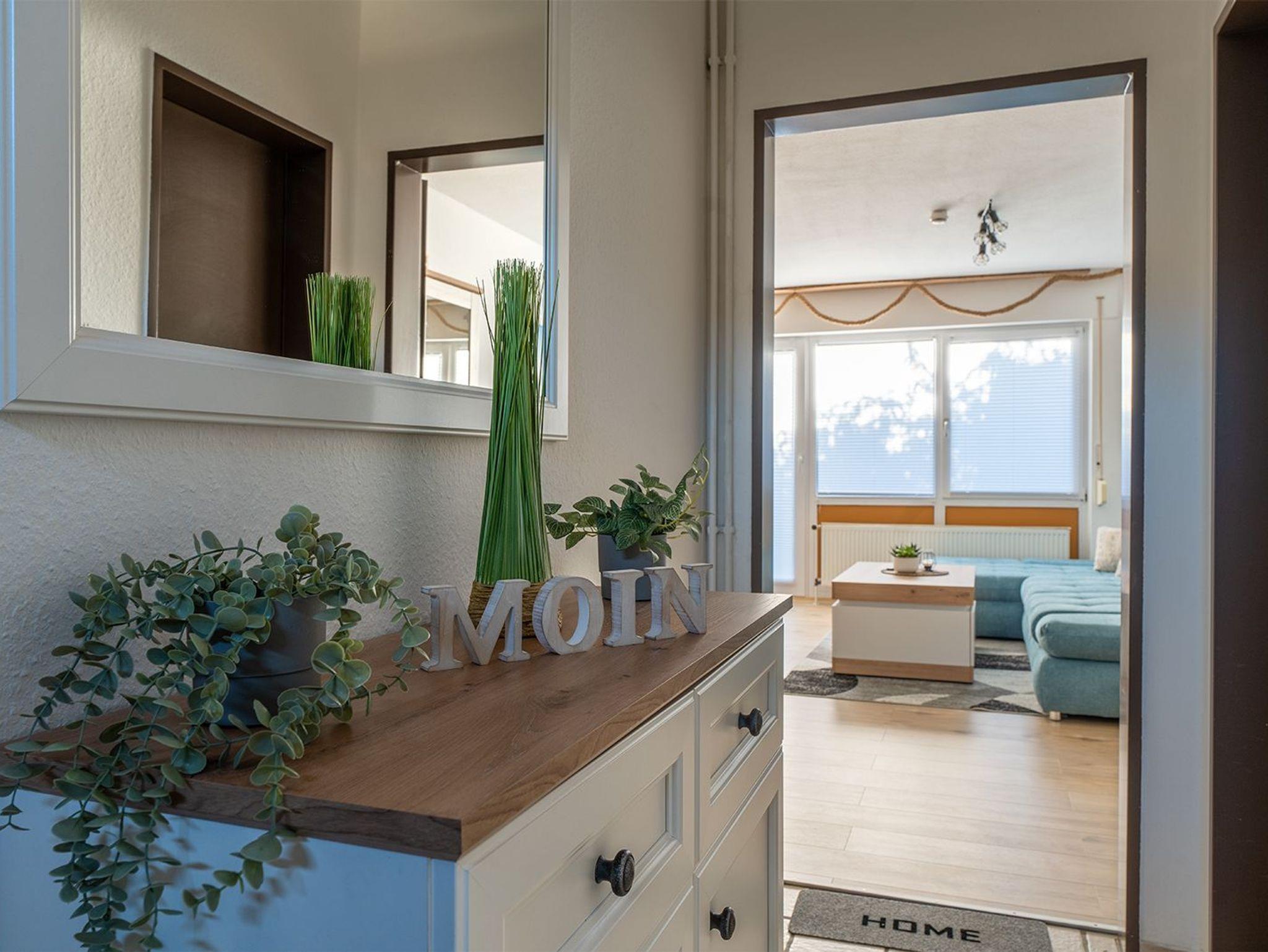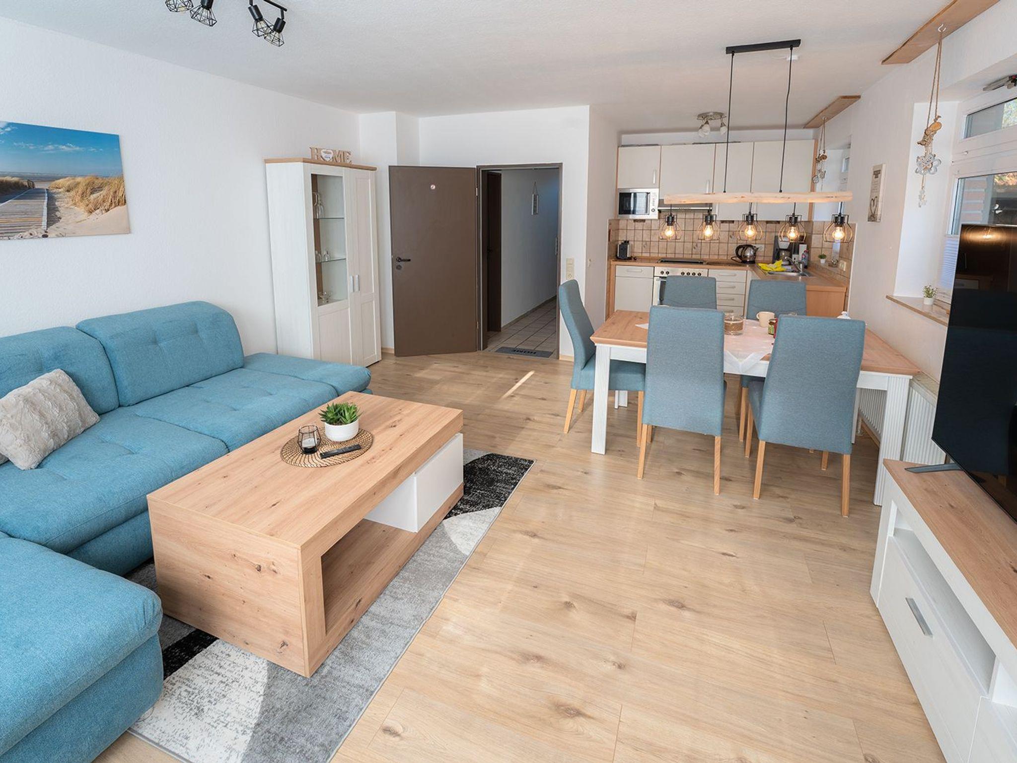 Vom Eingangsbereich mit Gäste-WC und Garderobe erreichen Sie das gemütliche Wohnzimmer mit integrierter Küchenzeile und dem Essplatz für vier Personen. Hier ist der Ausgang zur Terrasse mit Zugang zum schön begrünten Gemeinschaftsgarten.