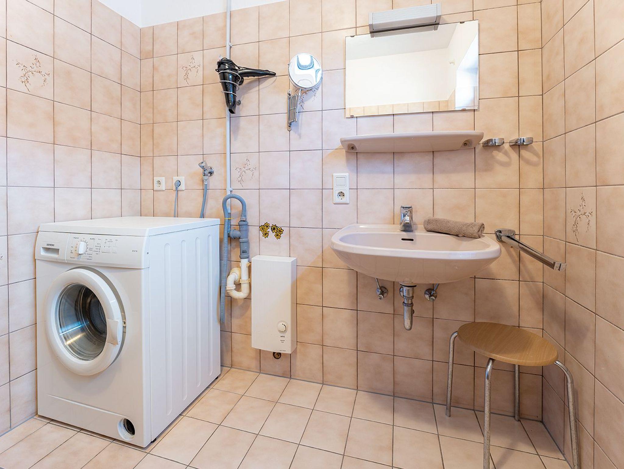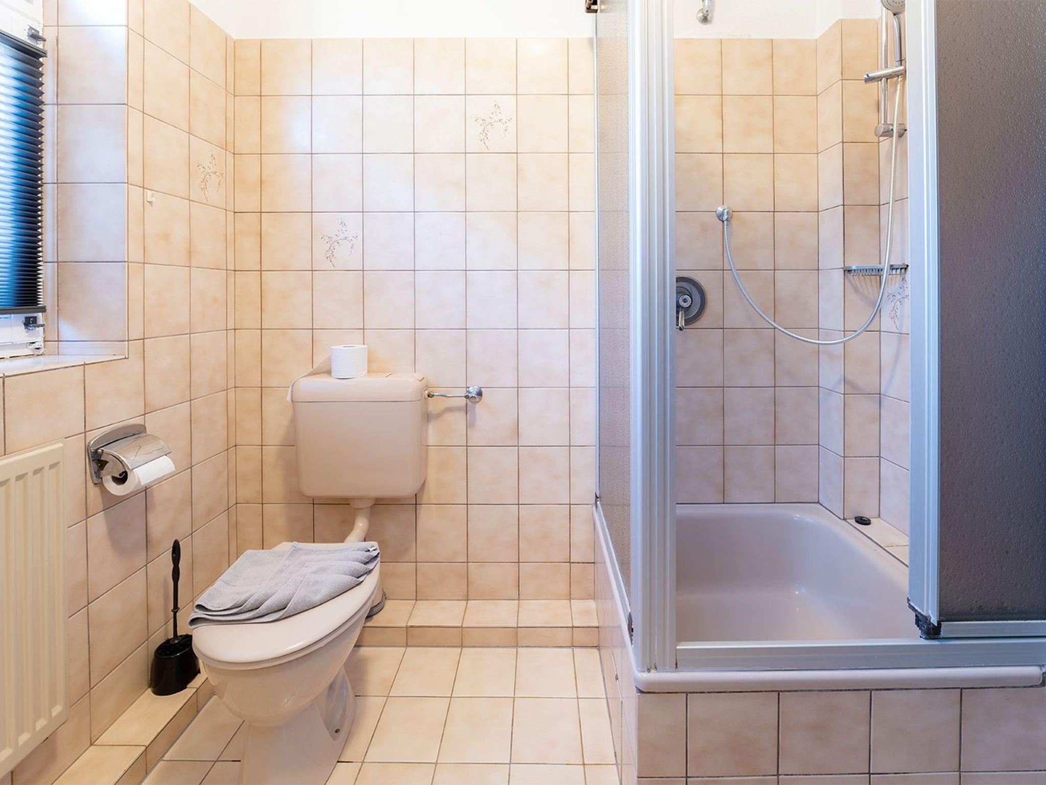 Im ersten OG befinden sich das Fenster-Duschbad und zwei Schlafräume. Einer ist ausgestattet mit einem Doppelbett, der andere mit zwei Einzelbetten sowie je einen großen Kleiderschrank.