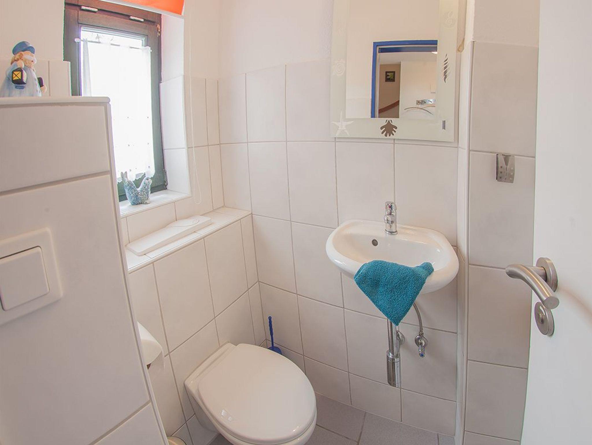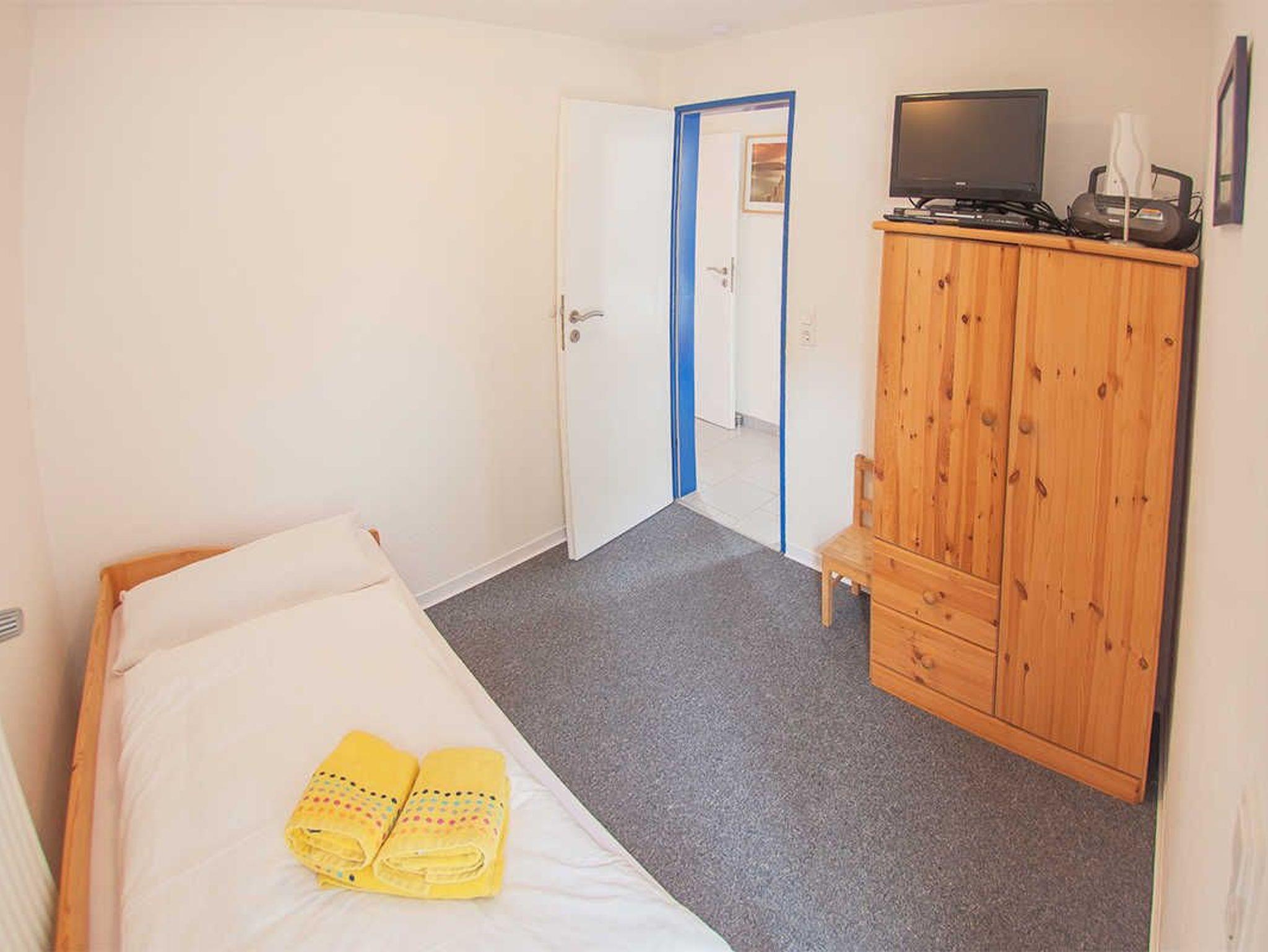 Im Obergeschoss liegt das helle Fensterduschbad mit Waschmaschine und die beiden Schlafräume mit Teppichboden: je ein Zimmer mit Doppelbett und ein Schlafraum mit ausziehbarem Tandembett.