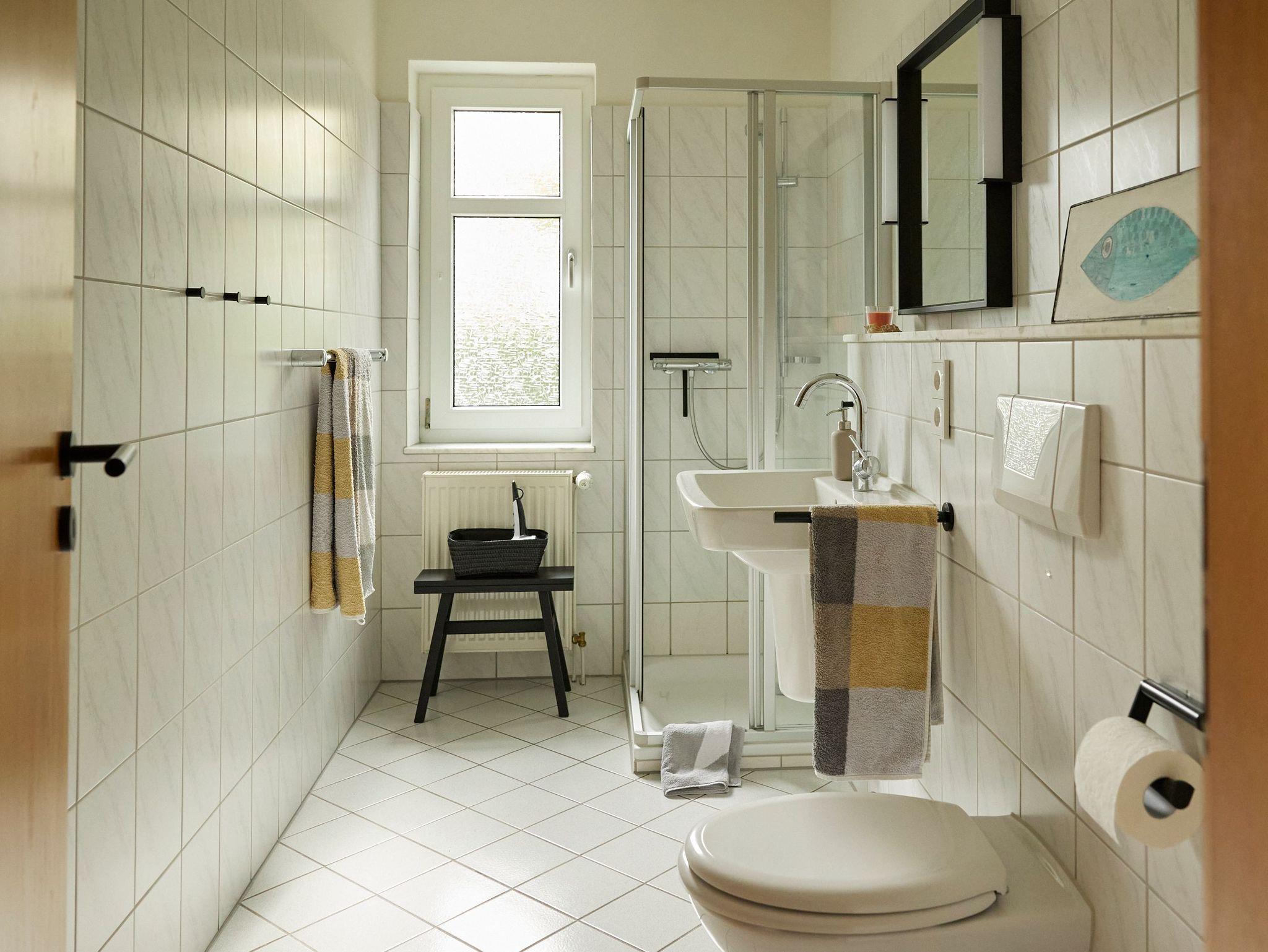 geräumiges Bad mit Dusche und Fenster (Föhn vorhanden)