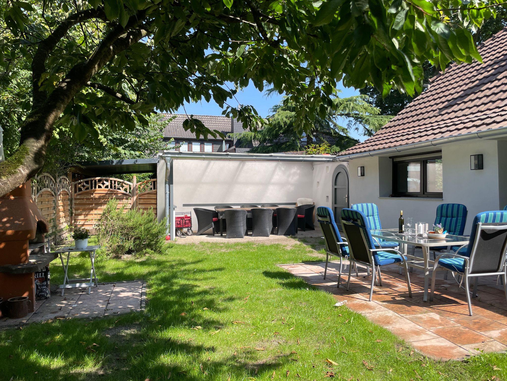 Garten mit Liege und Spielwiese und einem Kaminholzkohlegrill