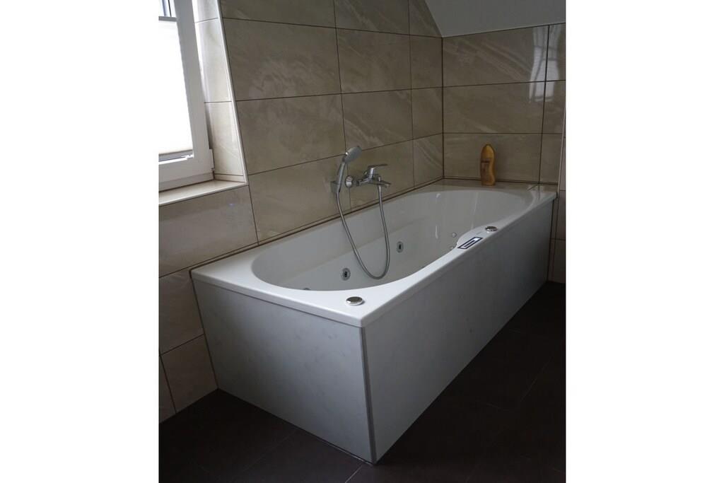 The semi-detached house offers a high standard of amenities on three floors. The house is designed for use by a maximum of 4 adults, 1 child up to 5 years old, and 1 child up to 2 years old. It is our goal to provide a high standard of seating and sleeping comfort and wellness-oriented relaxation. One of the bathrooms is equipped with a whirlpool. The attic features a sauna for 4 people and loungers. In the living room, you can enjoy warmth and coziness at the touch of a button thanks to a gas fireplace. The open-plan kitchen is well-equipped and spacious, so even preparing and presenting meals could be a holiday highlight. The master bedroom is furnished with a box-spring bed. Another highlight of the room is the permanently phosphorescent starry sky.