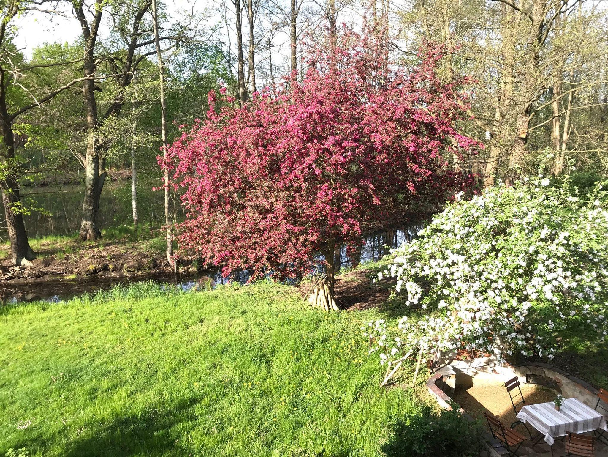 Der wunderschöne parkähnliche Garten direkt am Fließ hat verschiedene Sitzmöglichkeiten. Sonnenliegen und Grill sind auch vorhanden.