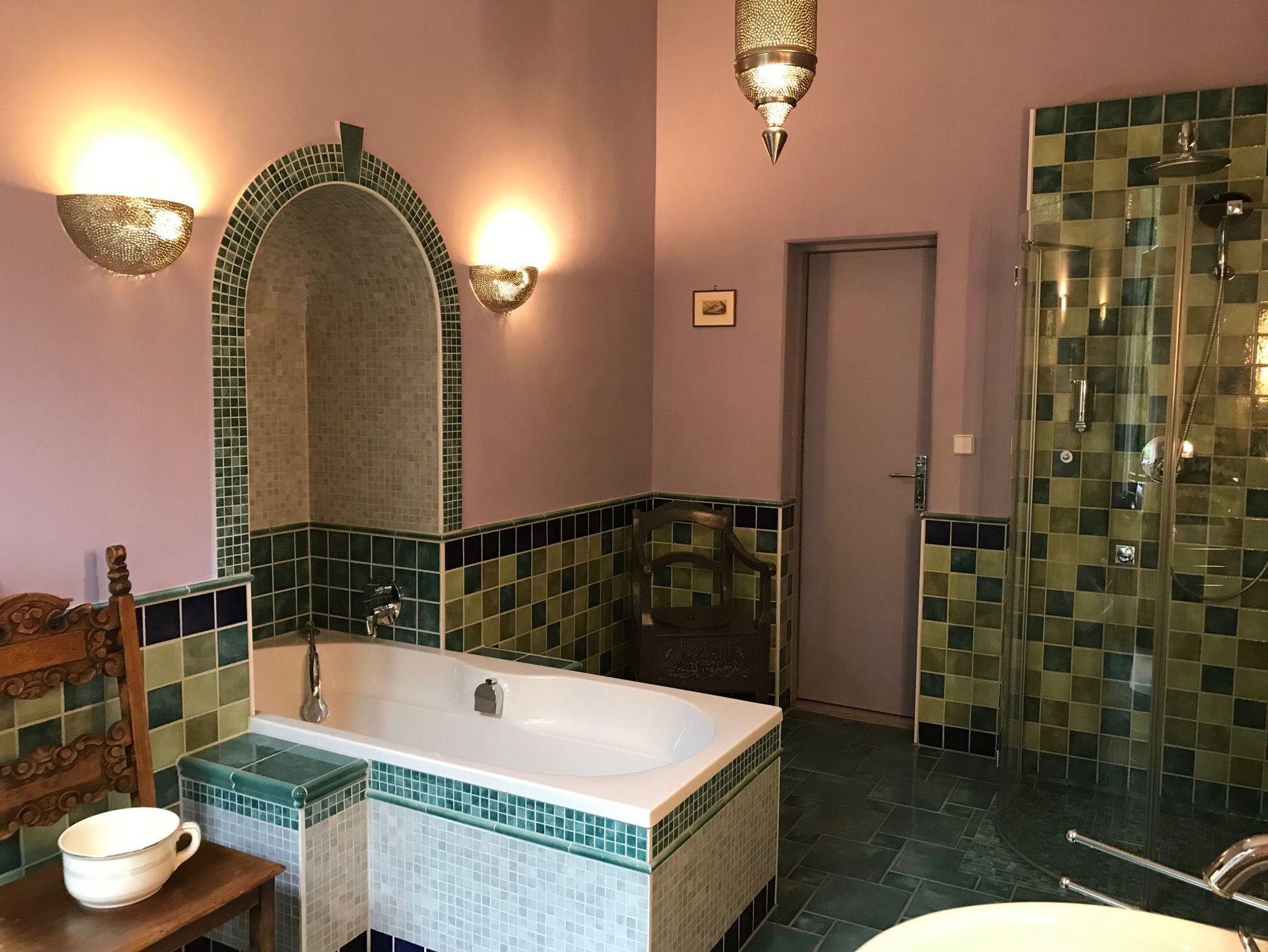 Das Bad zwischen den beiden Schlafzimmern im marrokanischen Stil hat eine Badewanne und Dusche. Zusätzlich gibt es noch ein Gäste-WC.
