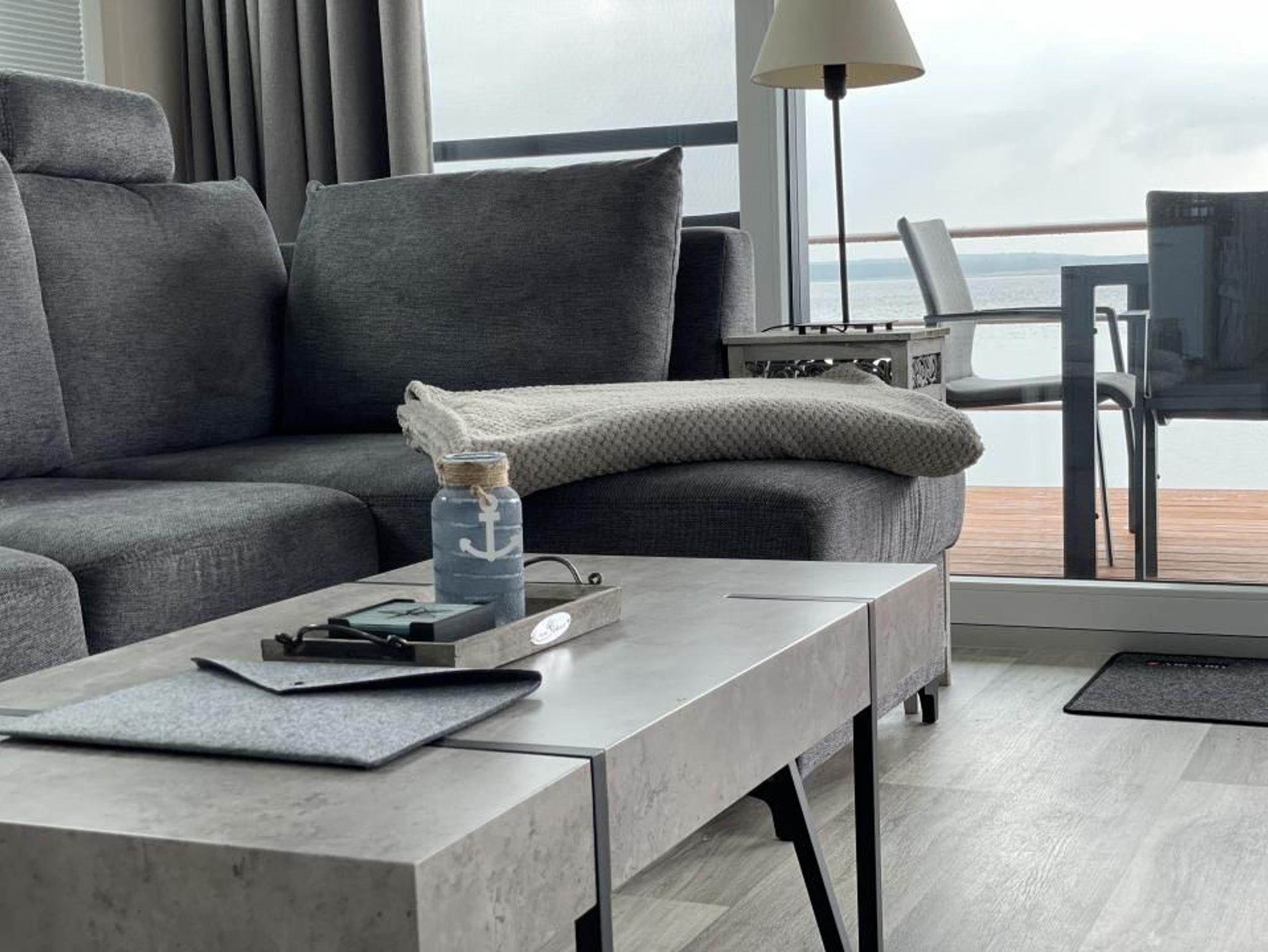 Möwenblick hat einen offenen Wohn-, und Essbereich mit integrierter, voll ausgestatteter Küche und bietet, Dank dem dreiseitigen Glasfront, einen tollen Ausblick auf den Gräbendorfer See. Es besitzt zwei separate Schlafzimmer mit je einem Doppelbett und Einbauschränken für ausreichenden Stauraum. Des Weiteren verfügt es über eine moderne Heizungs-/Klima-Technik, ein gefliestes Badezimmer mit Dusche und Waschtisch sowie ein separates WC mit Waschtisch. Drei abgeschlossene Innenräume auf 44 m² und zwei Terrassen (Bugterrasse mit 15 m² und Dachterrasse mit 25 m²) bieten bis zu 5 Personen ausreichend Rückzugsmöglichkeiten, um in Ruhe Kraft zu tanken, die Sonne und das Wasser zu genießen sowie einen traumhaften, unvergesslichen Urlaub zu erleben. Der große Ultra-HD TV und das hochwertige Sound-System lassen keine Wünsche offen. Ein High-Speed Internetzugang mit WLAN-Zugang steht selbstverständlich zur Verfügung.
