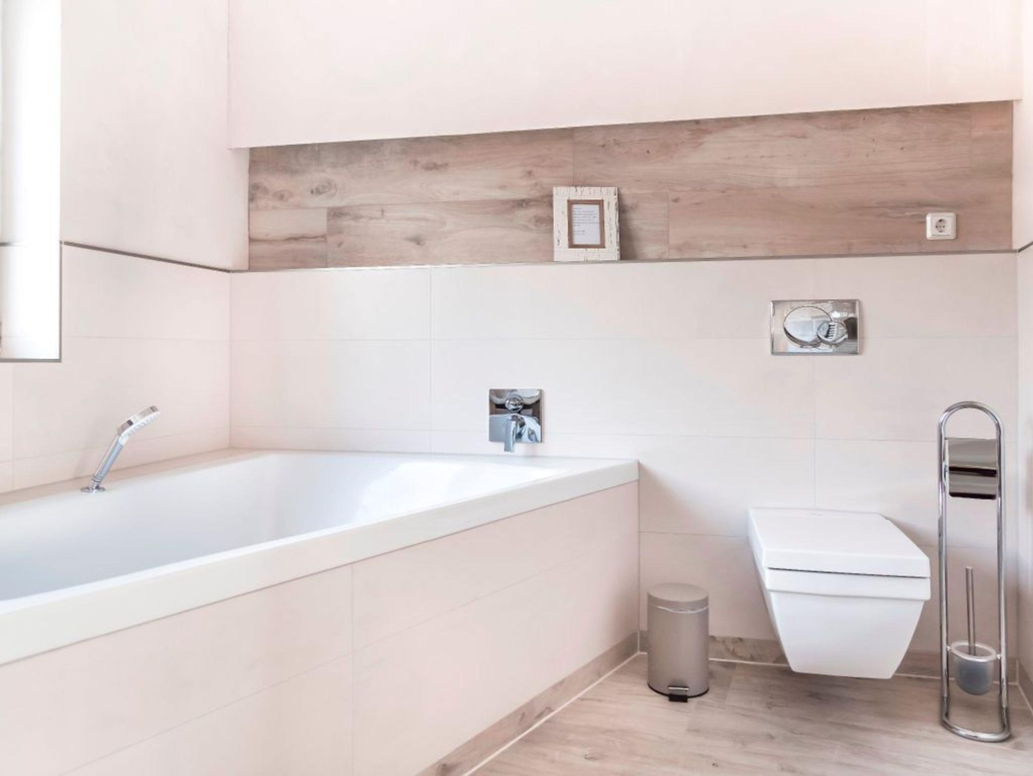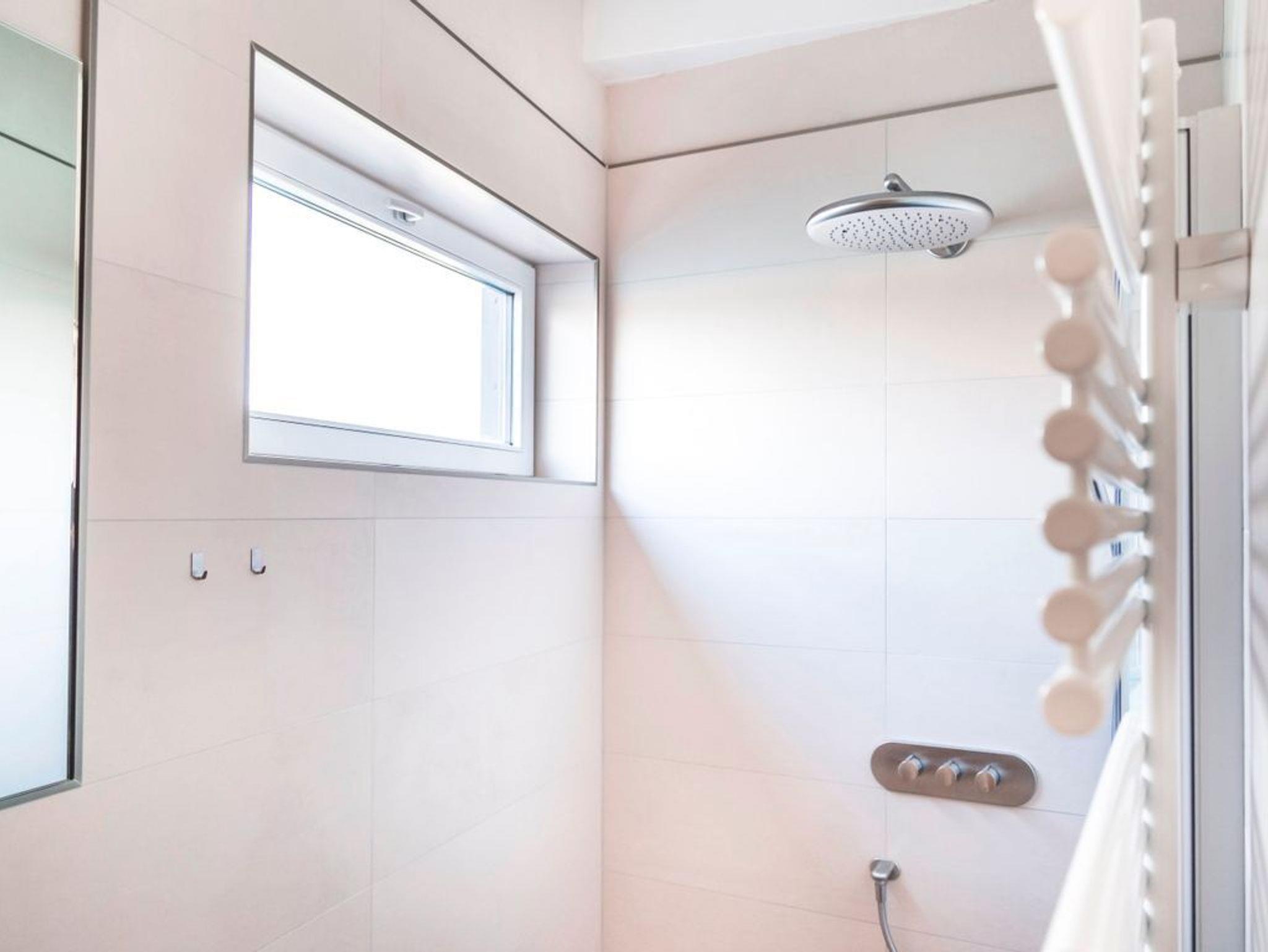 Ein modernes Bad mit Dusche und Waschtisch sowie ein separates WC