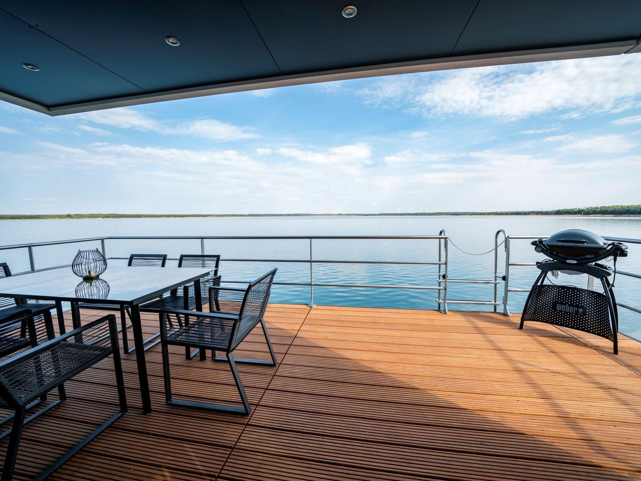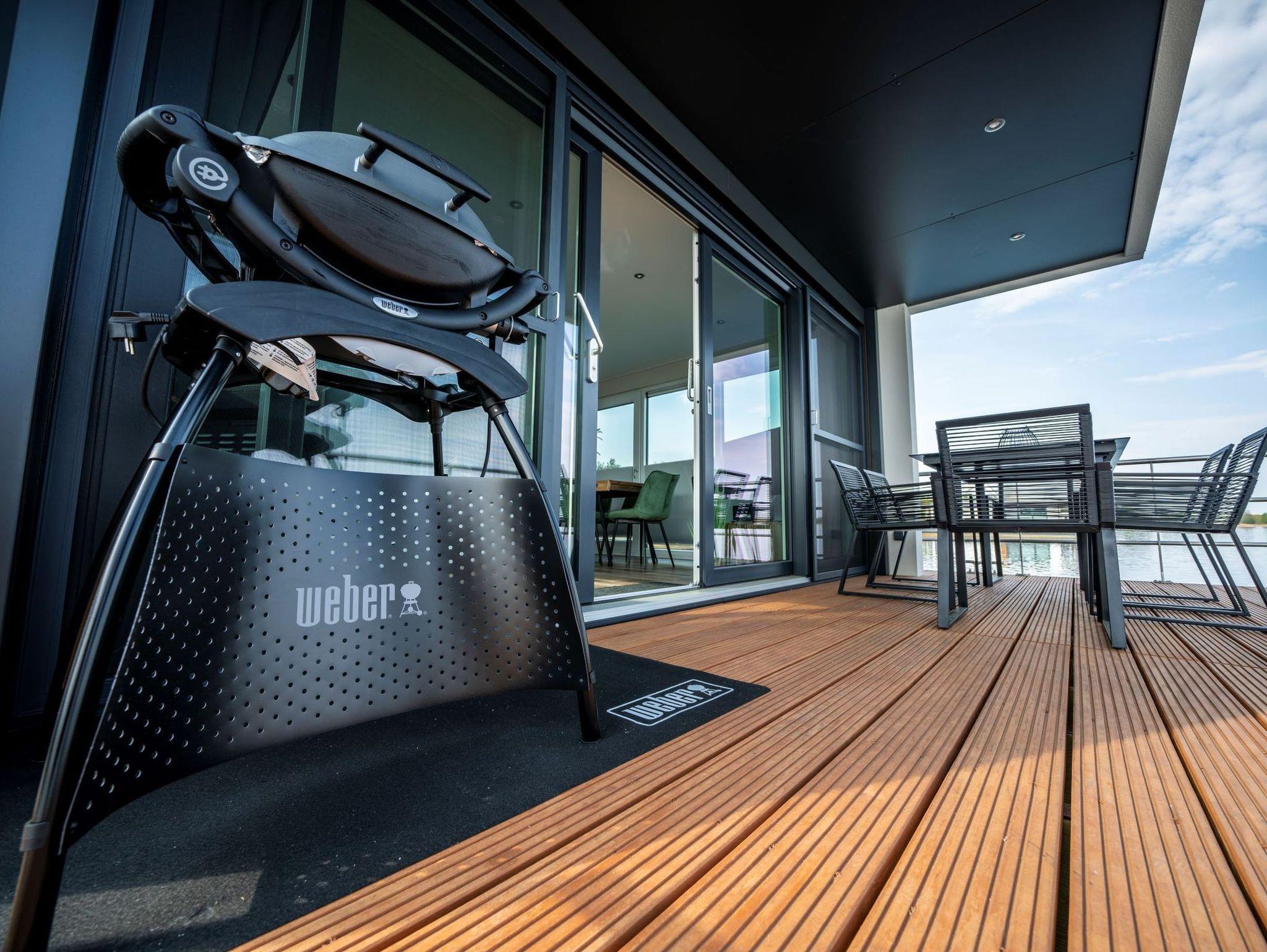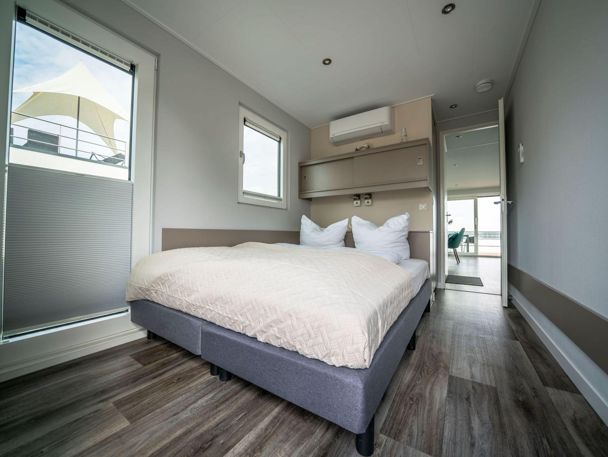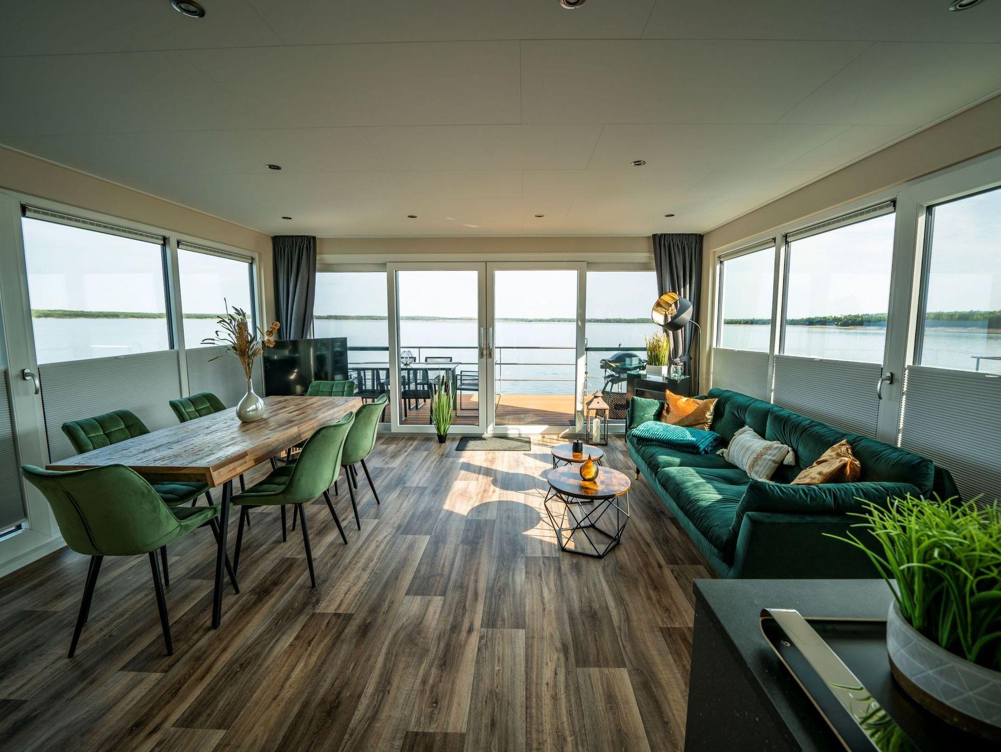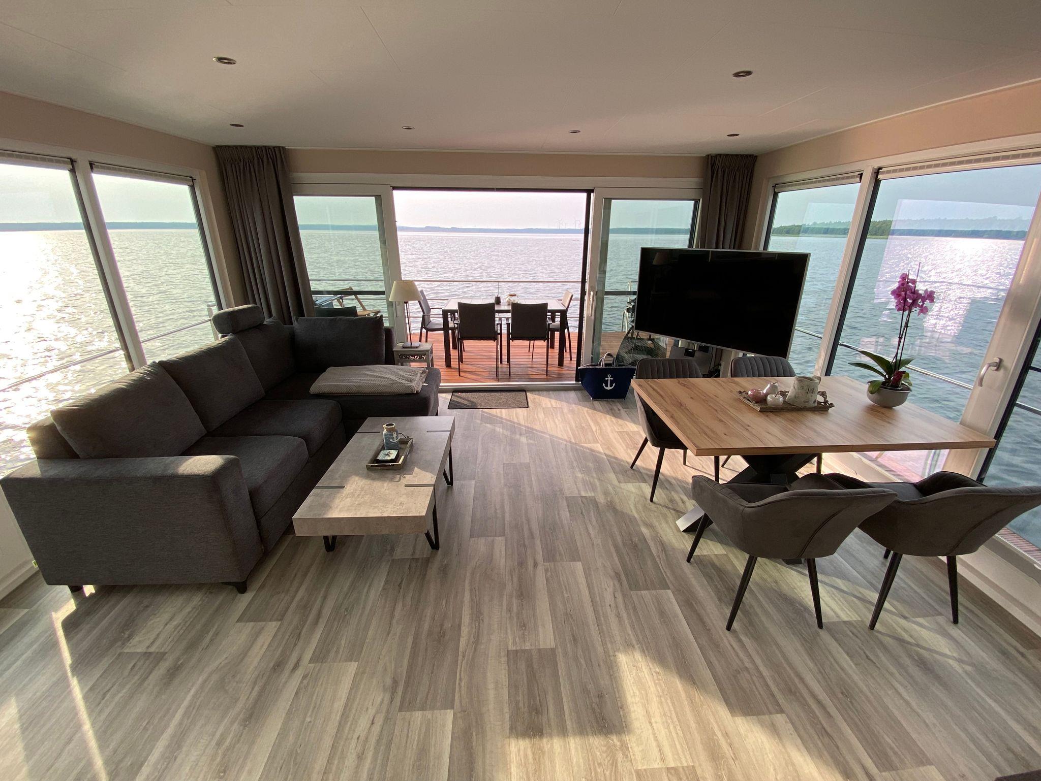 Auf 44 m² Wohnfläche und mit einer modernen Heizungs-/Klima-Technik ausgestattet, ist es an kalten und heißen Tagen immer angenehm. Auf der 15 m² großen Terrasse am Bug oder der 25 m² großen Terrasse auf dem Oberdeck kann man die Natur pur rund um die Uhr genießen. Das schwimmende Ferienhaus verfügt über zwei separate Schlafzimmer mit je einem Doppelbett, ein gefliestes Badezimmer mit Waschtisch und Dusche, sowie ein extra WC mit Waschbecken, eine vollausgestattete Küchenzeile, Panorama-Wohnzimmer mit Elektrokamin und alles andere, was Sie für eine schöne Zeit auf dem Wasser benötigen. Die drei abgeschlossenen Innenräume und zwei Terrassen bieten ausreichend Rückzugsmöglichkeiten, um in Ruhe Kraft zu tanken und die Sonne und das Wasser zu genießen. Ein großer Ultra-HD TV und High-Speed Internetzugang mit WLAN-Zugang stehen selbstverständlich kostenfrei zur Verfügung.