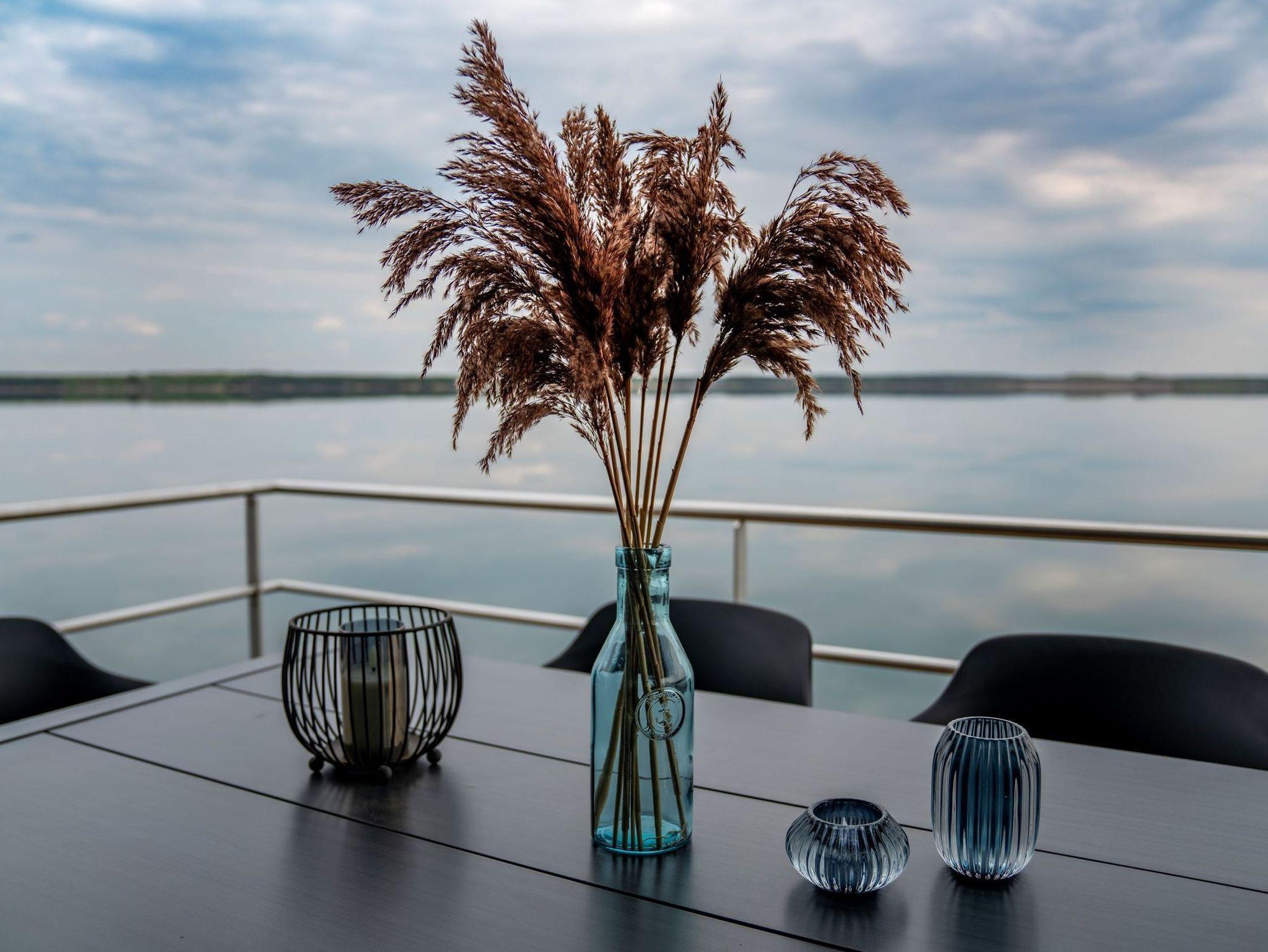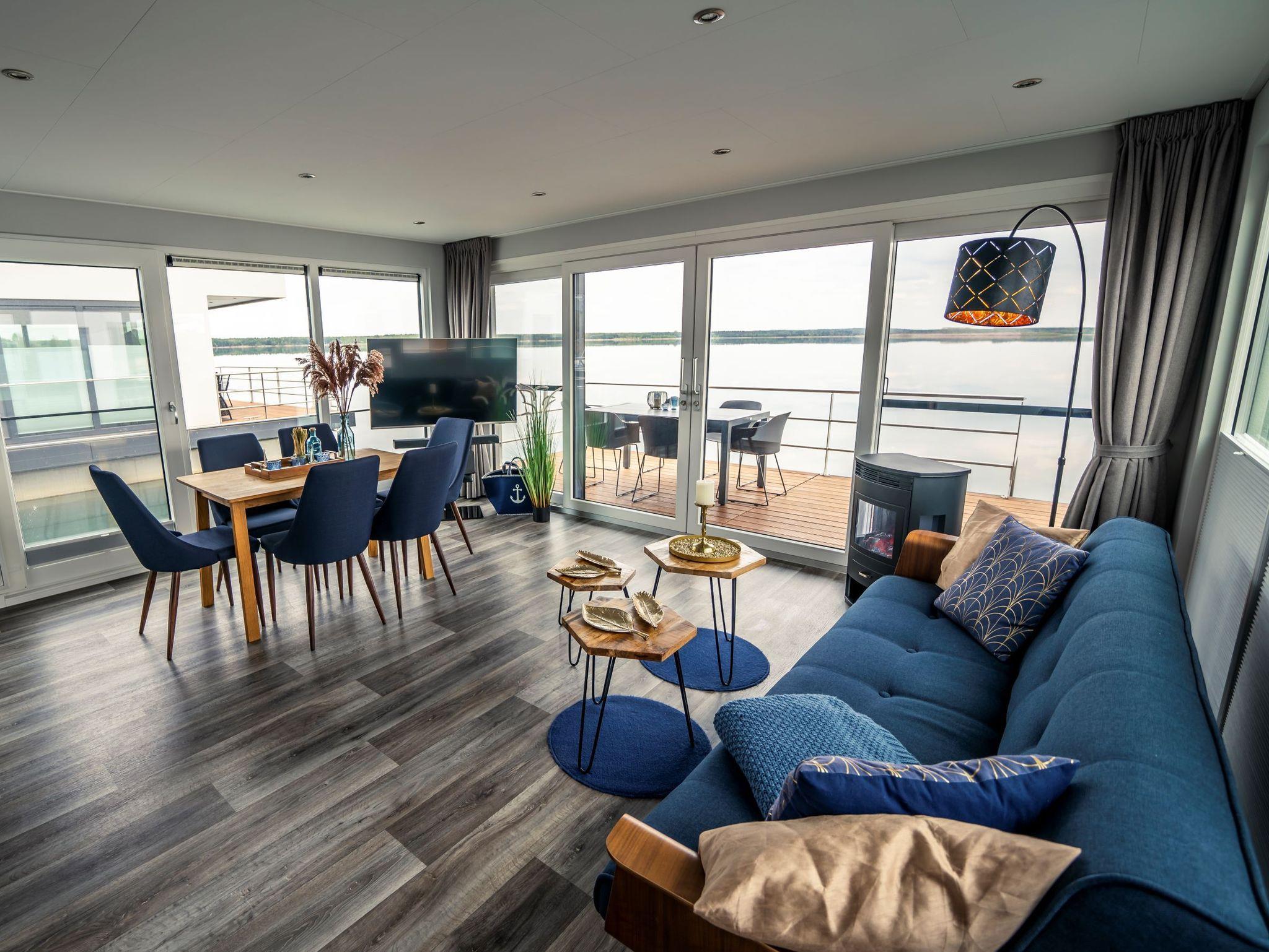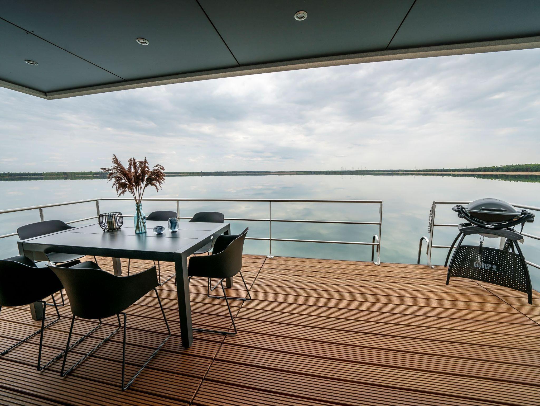 Die technisch ausgereifte Ausstattung bietet praktischen Komfort und jede Menge Annehmlichkeiten für ein Ferienhaus auf dem Wasser und bietet Platz für bis 4 Personen. Auf 44 m² Wohnfläche und mit einer modernen Heizungs-/Klima-Technik ausgestattet, ist es an kalten und heißen Tagen immer angenehm. Auf der 15 m² großen Terrasse am Bug oder der 25 m² großen Terrasse auf dem Oberdeck kann man die Natur pur rund um die Uhr genießen.