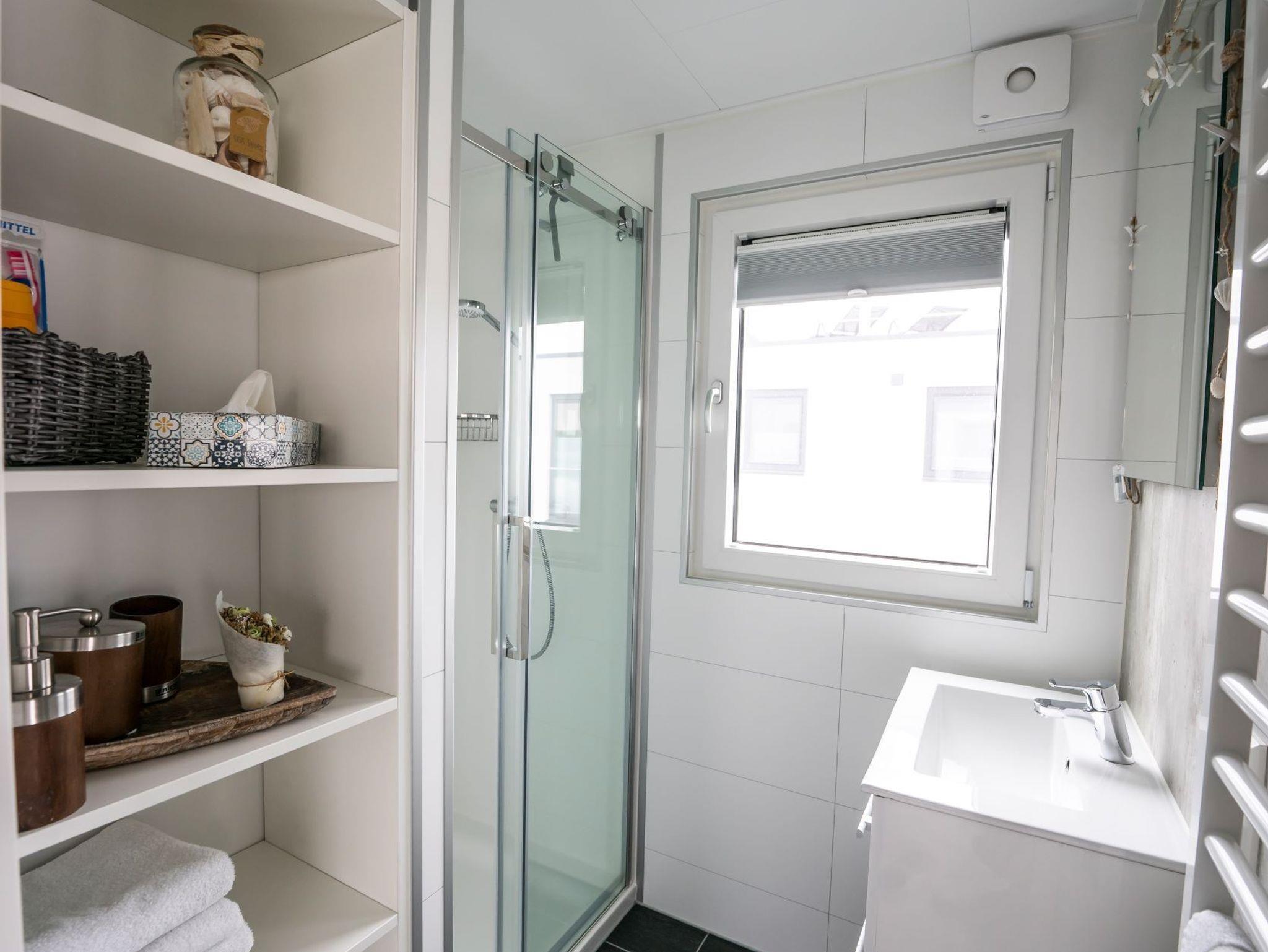 Ein modernes Bad mit Dusche und Waschtisch sowie ein separates WC