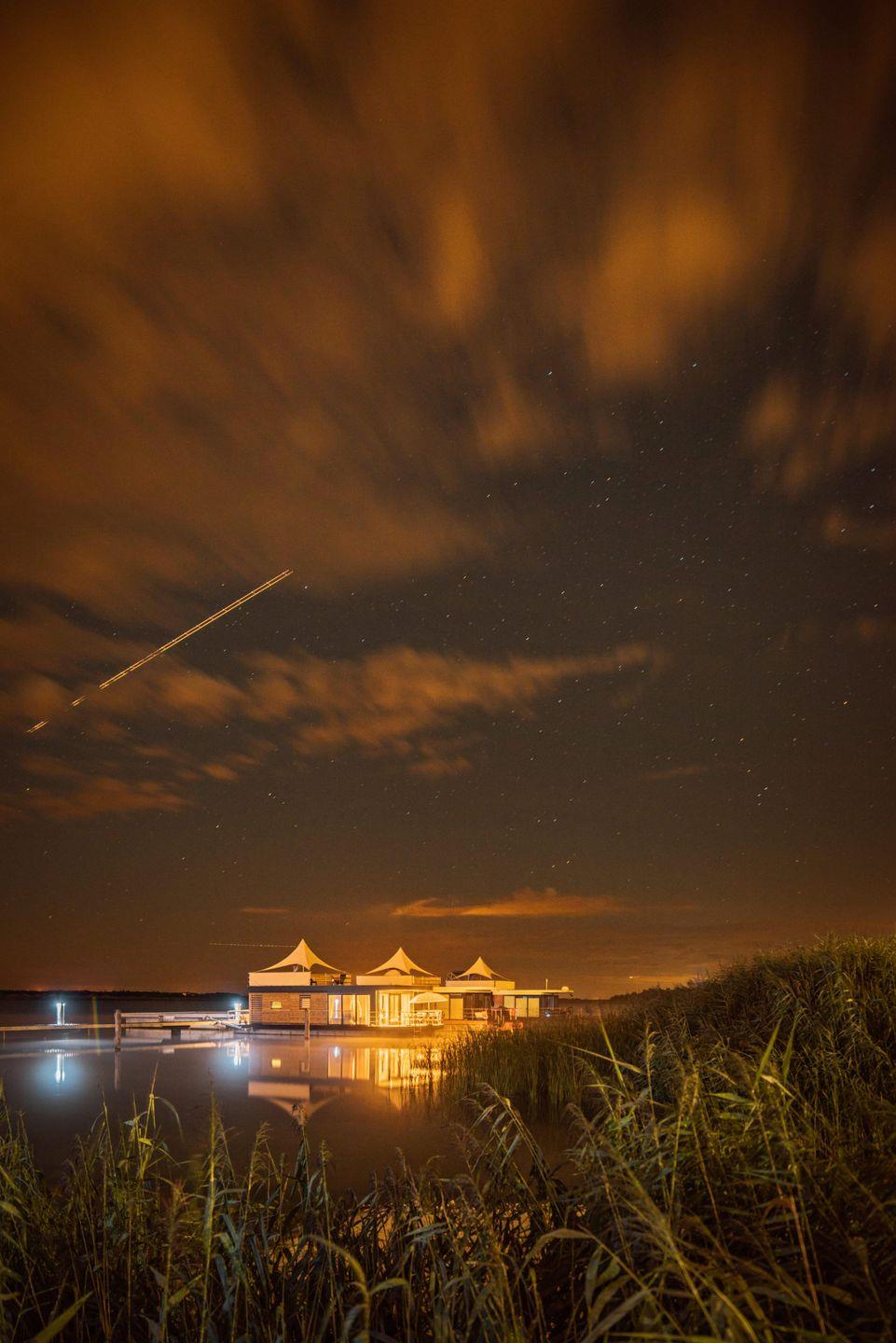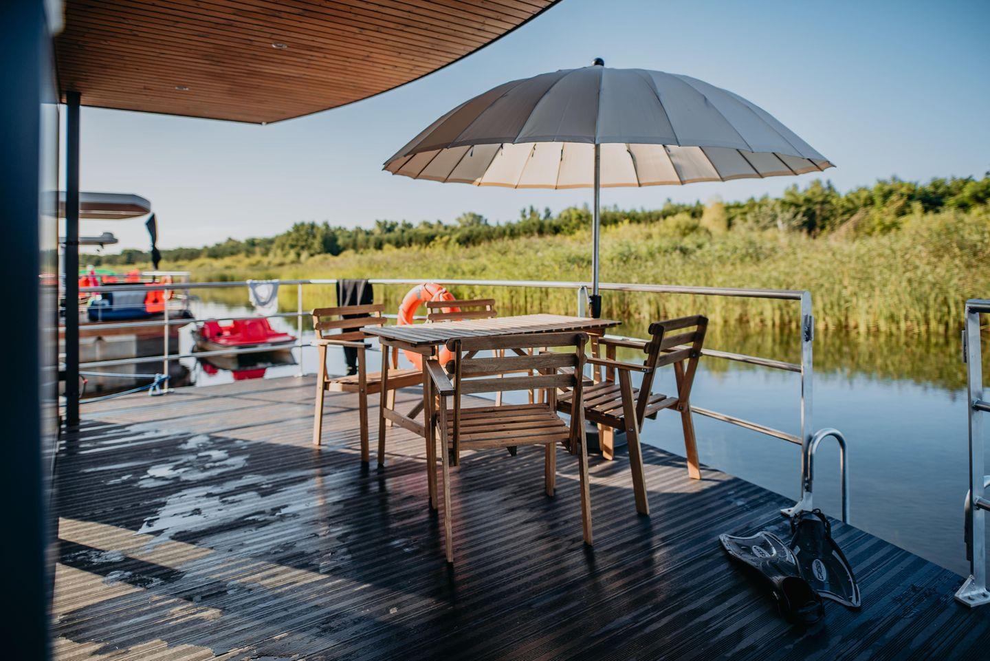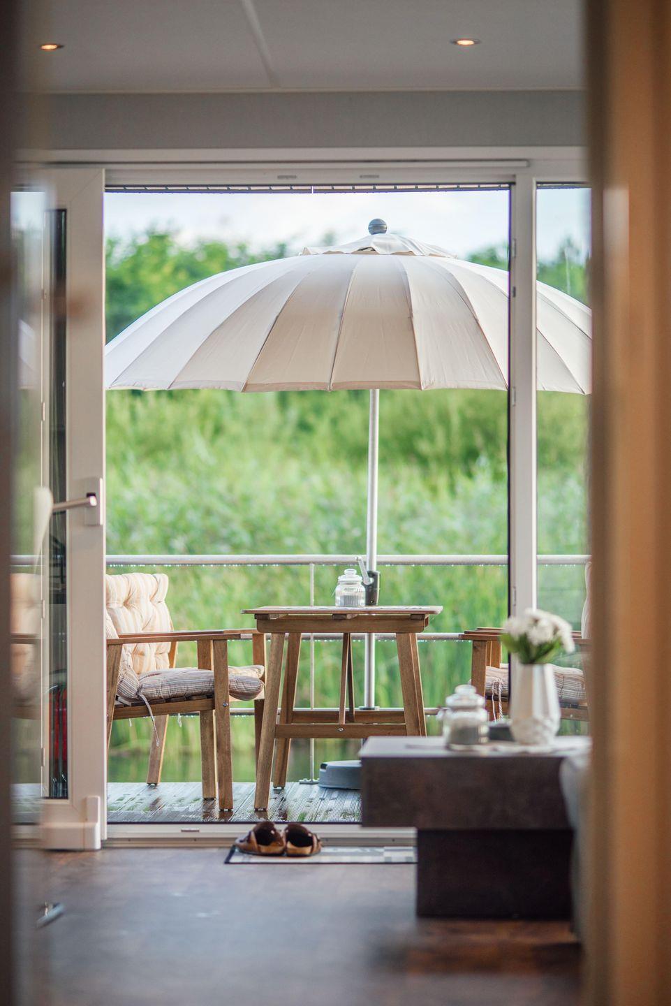 Der Wohnbereich ist auf Komfort ausgelegt und lädt mit Sofaecke und Essbereich zum gemeinsamen Ankommen ein. Für Unterhaltung und entspannte Abende stehen TV, Radio und WLAN zur Verfügung. Dank Heizung und Klimaanlage ist das Floatinghouse zu unterschiedlichen Jahreszeiten angenehm nutzbar. Sichtschutz an allen Fenstern sorgt für ungestörte Momente, Fliegengitter erhöhen den Wohnkomfort. Eine Garderobe sowie praktische Ausstattung wie Staubsauger und Erstausstattung erleichtern den Aufenthalt.