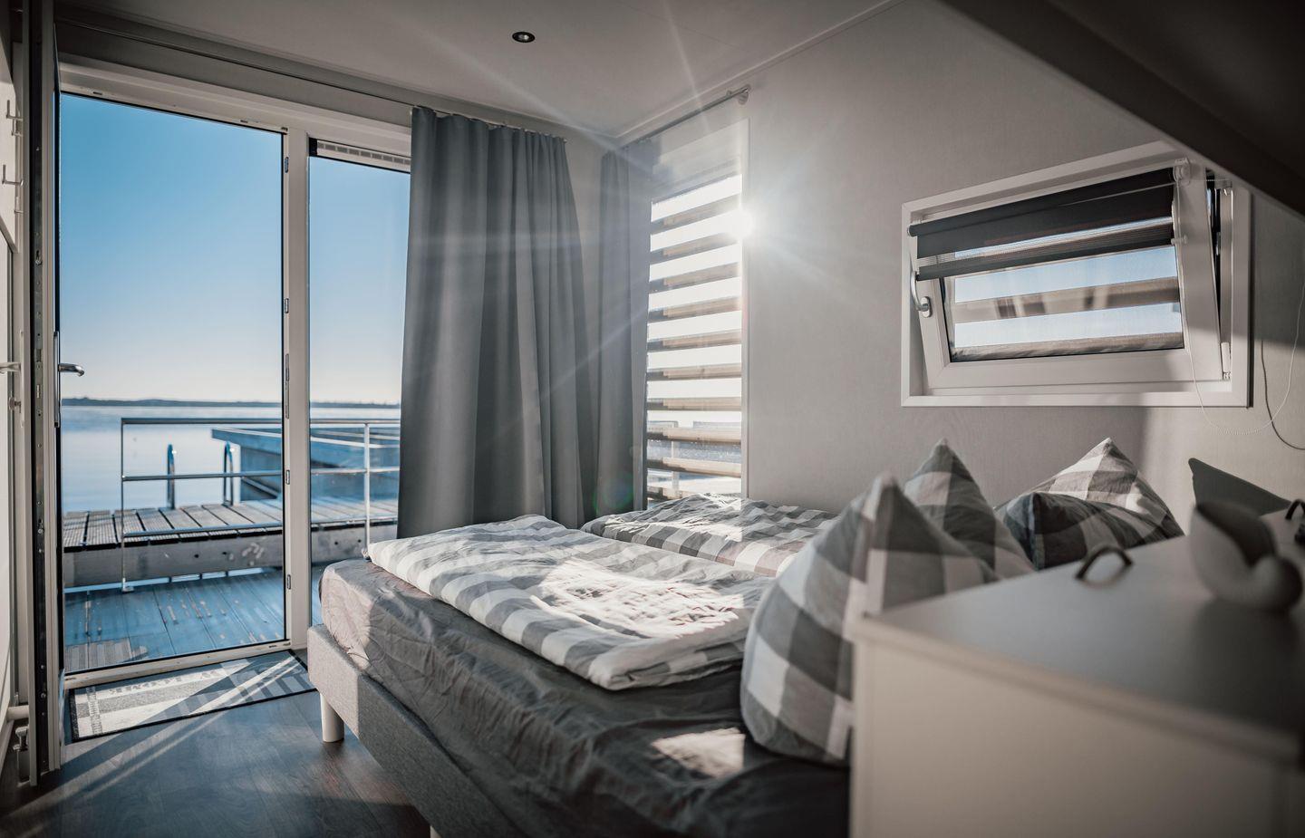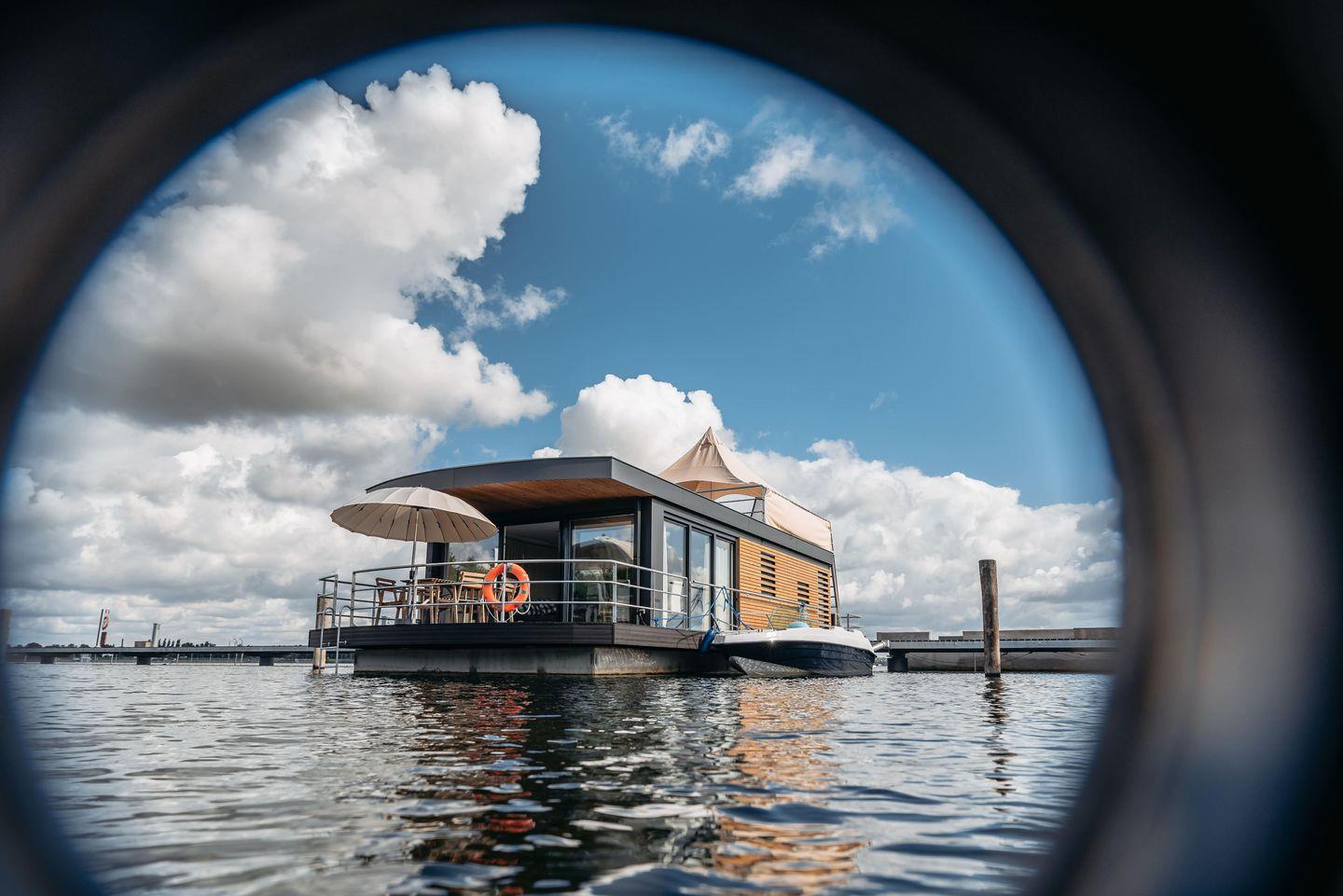 Floatinghouse Möwe 3: freistehendes, 44 m² großes Nichtraucher-Ferienhaus auf dem Wasser mit Seeblick. 3 Zimmer, 2 Schlafzimmer und Platz für bis zu 6 Personen, ideal für Familien. Mit Küche inkl. Spülmaschine, WLAN, TV/Radio, Klima und Heizung. Überdachte Terrasse mit Gartenmöbeln, Sonnenliegen und Elektrogrill am Steg, Parkplatz vorhanden.