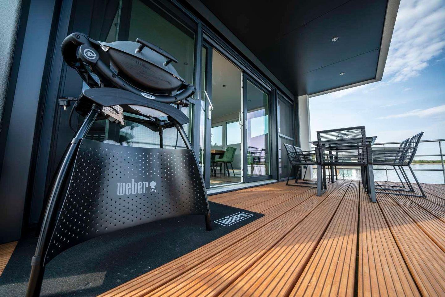Draußen lädt die überdachte Terrasse mit Gartenmöbeln, Sonnenschutz und Sonnenliegen zum Verweilen ein; ein Elektrogrill steht ebenfalls bereit. Direkt am Steg genießen Sie die Nähe zum Wasser – ideal für Schwimmen, Angeln, SUP Board fahren. Auch Kanufahren, Radfahren, Wandern, Joggen, Windsurfen und weiterer Wassersport lassen sich in der Umgebung gut kombinieren, ebenso der Besuch von Restaurants und Spielplätzen.