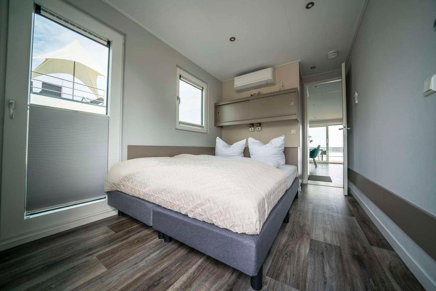 Das Floatinghouse Albatros bietet auf 44 m² Platz für bis zu 4 Personen mit 3 Zimmern, darunter 2 Schlafzimmer und 1 Bad. Die offene Küche zum Wohnzimmer ist u. a. mit Ceranherd, Spülmaschine und Kaffeemaschine ausgestattet. Genießen Sie Seeblick und Landschaftsblick von der überdachten Terrasse am eigenen Steg; WLAN, TV, Klimaanlage und Kamin sorgen für Komfort. Nichtraucher, familienfreundlich.
