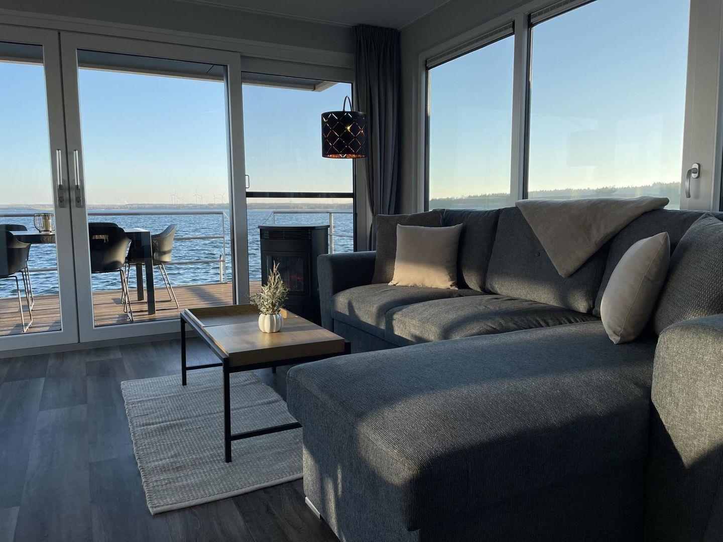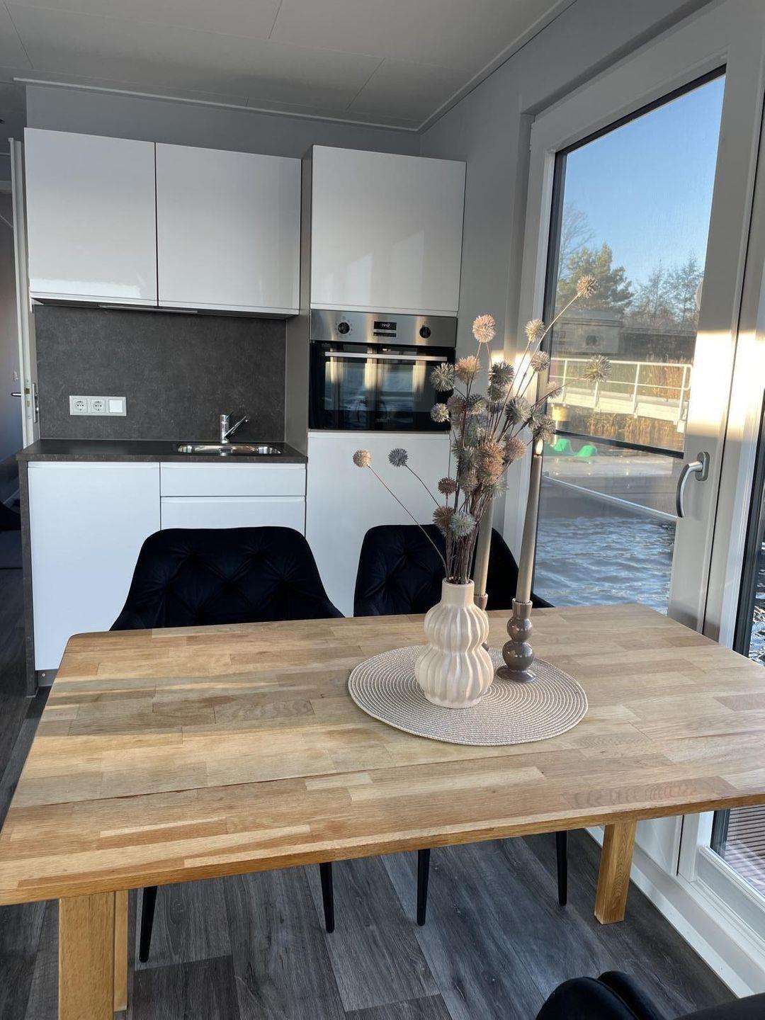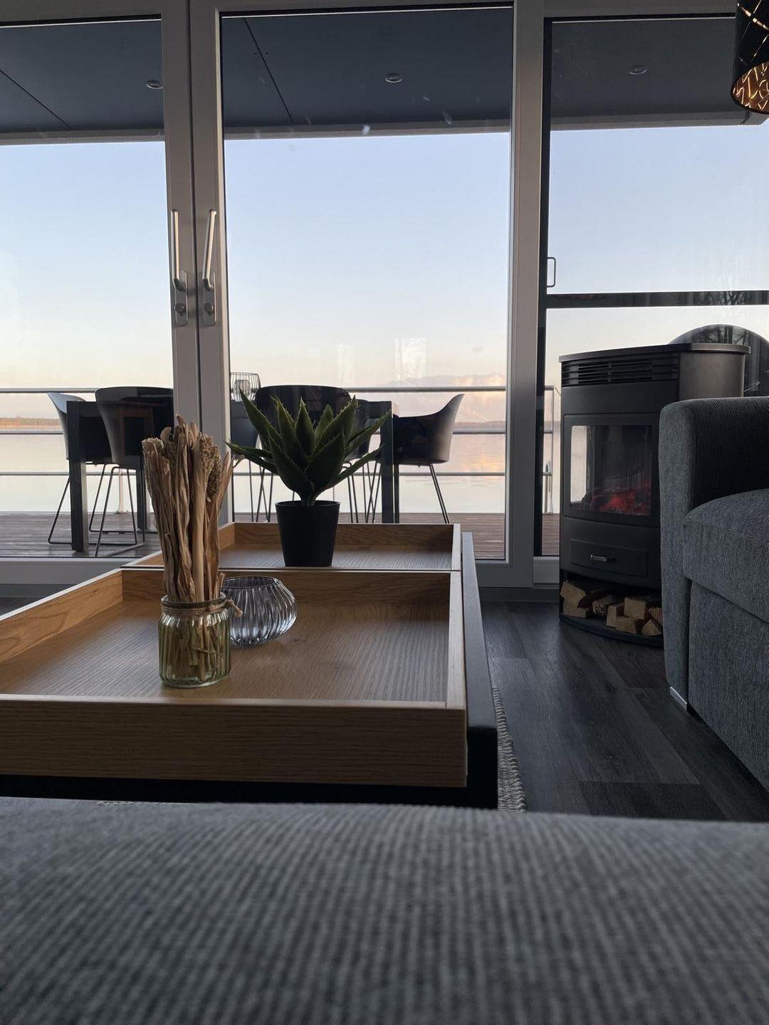 Floatinghouse Neptun: freistehendes, schwimmendes Ferienhaus mit Seeblick und Landschaftsblick. 44 m², 3 Zimmer, 2 Schlafzimmer, 1 Bad, Schlafmöglichkeiten für bis zu 6 Personen. Offene Küche zum Wohnzimmer mit Ceranherd, Spülmaschine und viel Ausstattung. Überdachte Terrasse mit Gartenmöbeln, Sonnenliegen und Elektrogrill; WLAN, Klimaanlage und Gaskamin, Nichtraucher, kinderfreundlich.