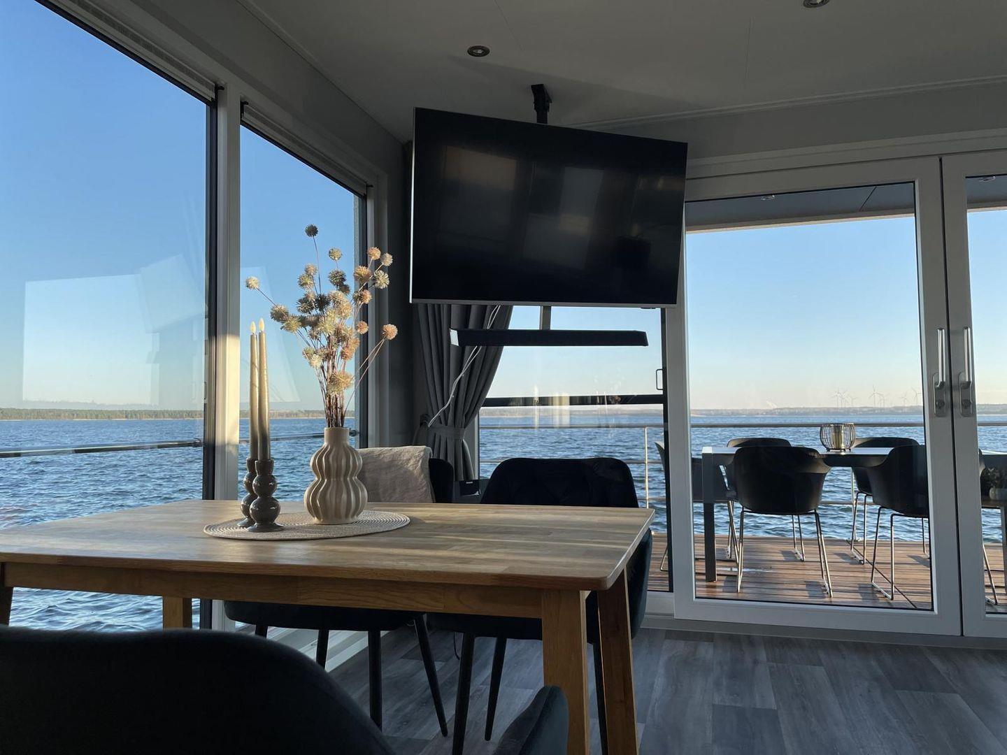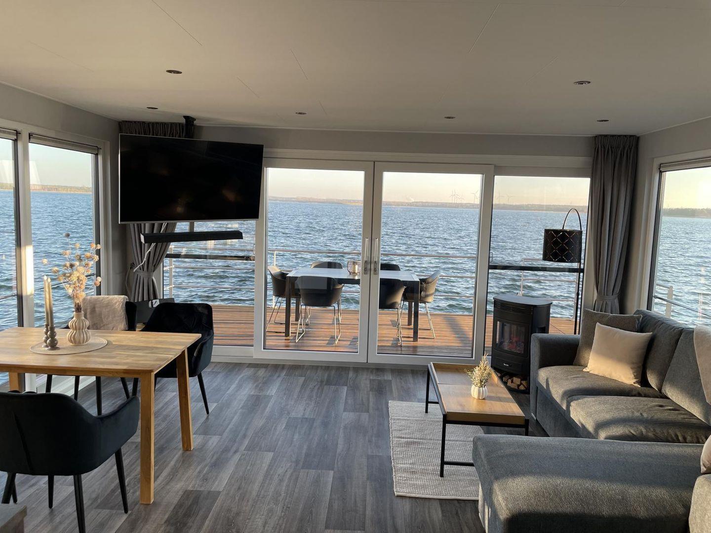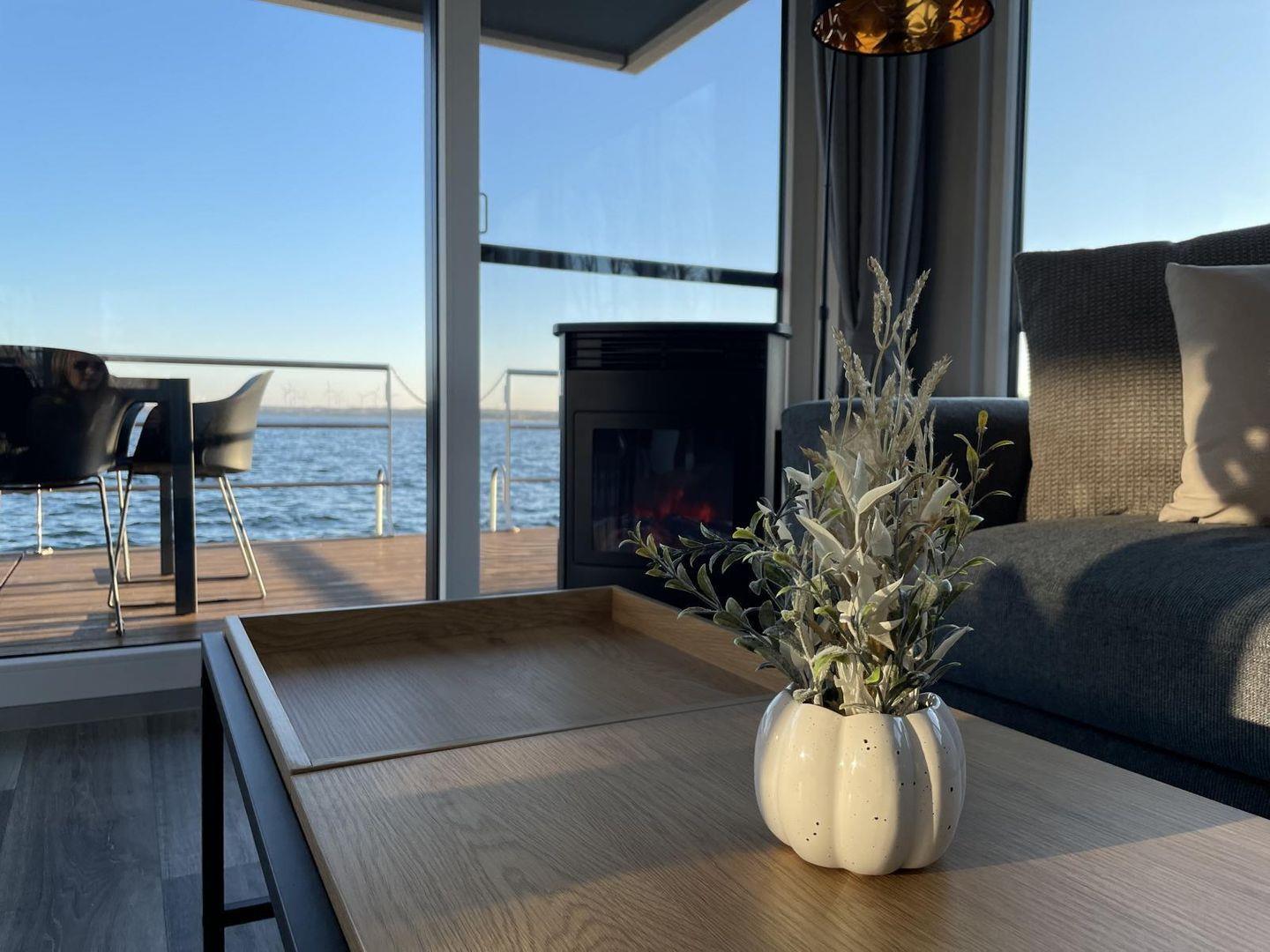 Floatinghouse Neptun: freistehendes, schwimmendes Ferienhaus mit Seeblick und Landschaftsblick. 44 m², 3 Zimmer, 2 Schlafzimmer, 1 Bad, Schlafmöglichkeiten für bis zu 6 Personen. Offene Küche zum Wohnzimmer mit Ceranherd, Spülmaschine und viel Ausstattung. Überdachte Terrasse mit Gartenmöbeln, Sonnenliegen und Elektrogrill; WLAN, Klimaanlage und Gaskamin, Nichtraucher, kinderfreundlich.