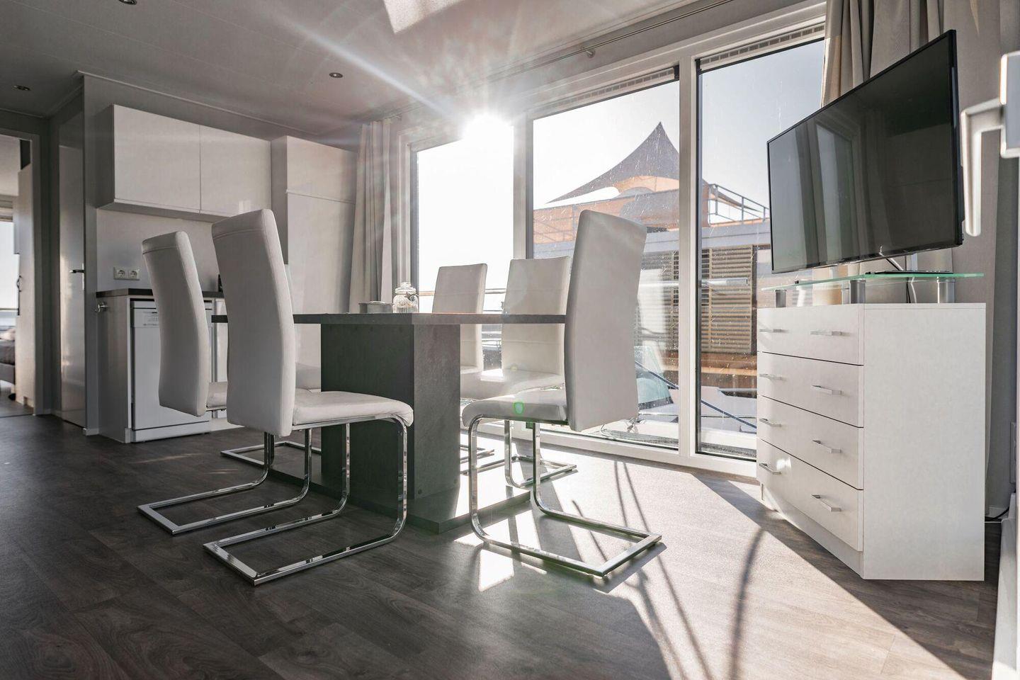 Das Badezimmer ist mit Dusche, WC, Waschbecken, Spiegel, Fenster und warmem Wasser ausgestattet. Draußen lädt die überdachte Terrasse mit Gartenmöbeln, Sonnenliegen und Sonnenschutz zum Verweilen ein. Ein Steg gehört zur Unterkunft; für gesellige Stunden steht ein Elektrogrill zur Verfügung.