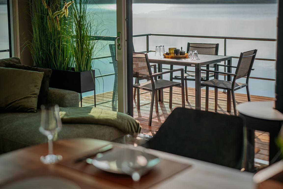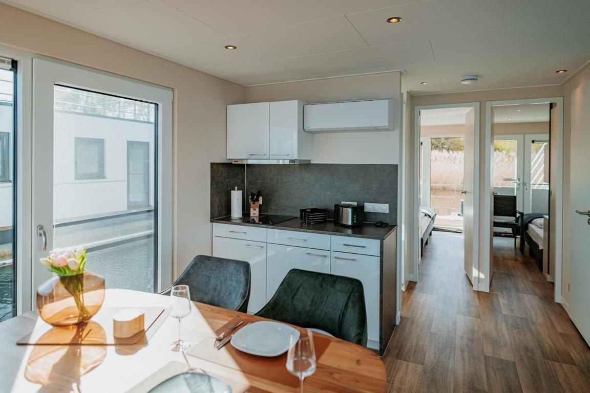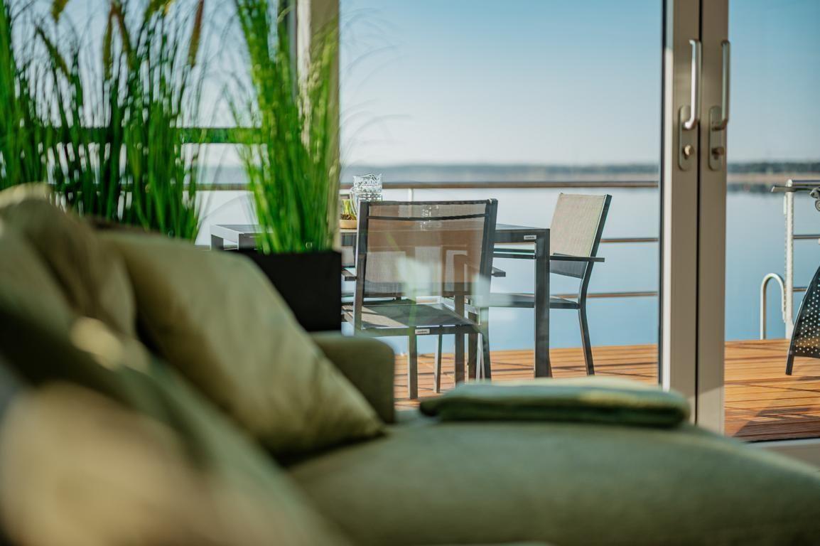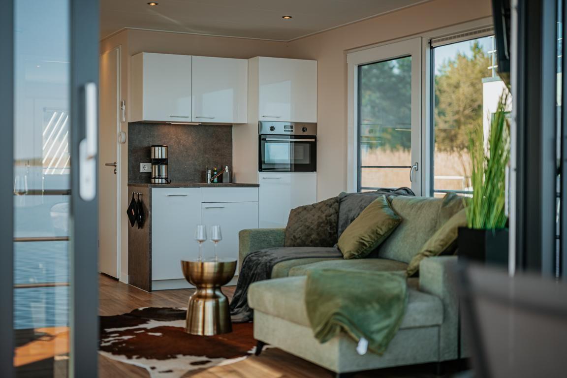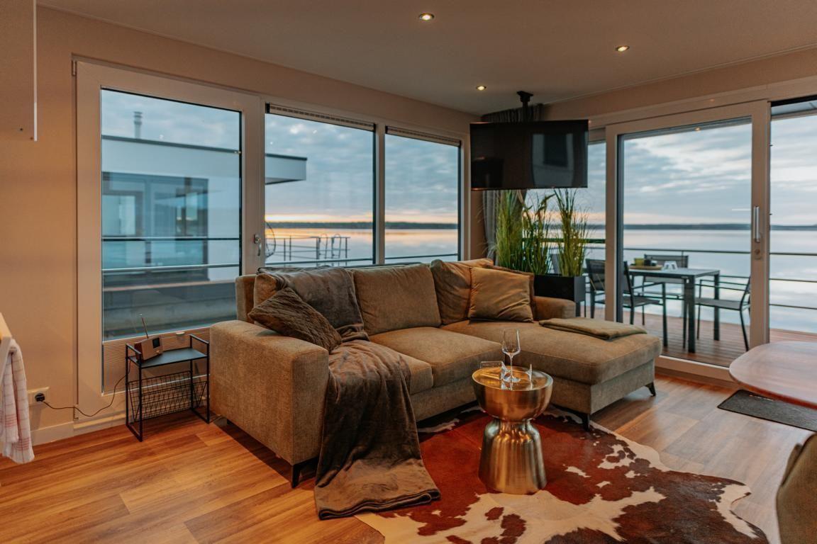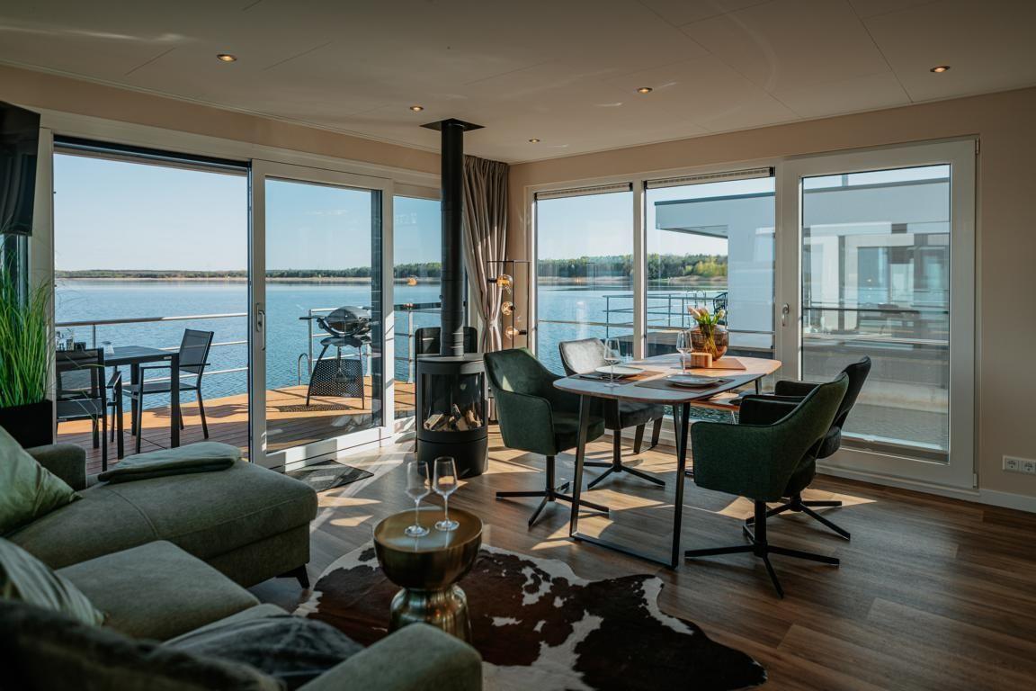 Floatinghouse Seeblick: freistehendes Hausboot auf dem Wasser (44 m²) mit Seeblick, Steg und überdachter Terrasse mit Gartenmöbeln, Sonnenliegen und Sonnenschutz. Für bis zu 6 Personen, 2 Schlafzimmer, 1 Bad. Offene Küche zum Wohnbereich mit Ceranherd, Spülmaschine, Kaffeemaschine u.v.m. WLAN, TV, Klimaanlage, Elektroheizung und Gaskamin; Nichtraucher, kinder- und haustierfreundlich.