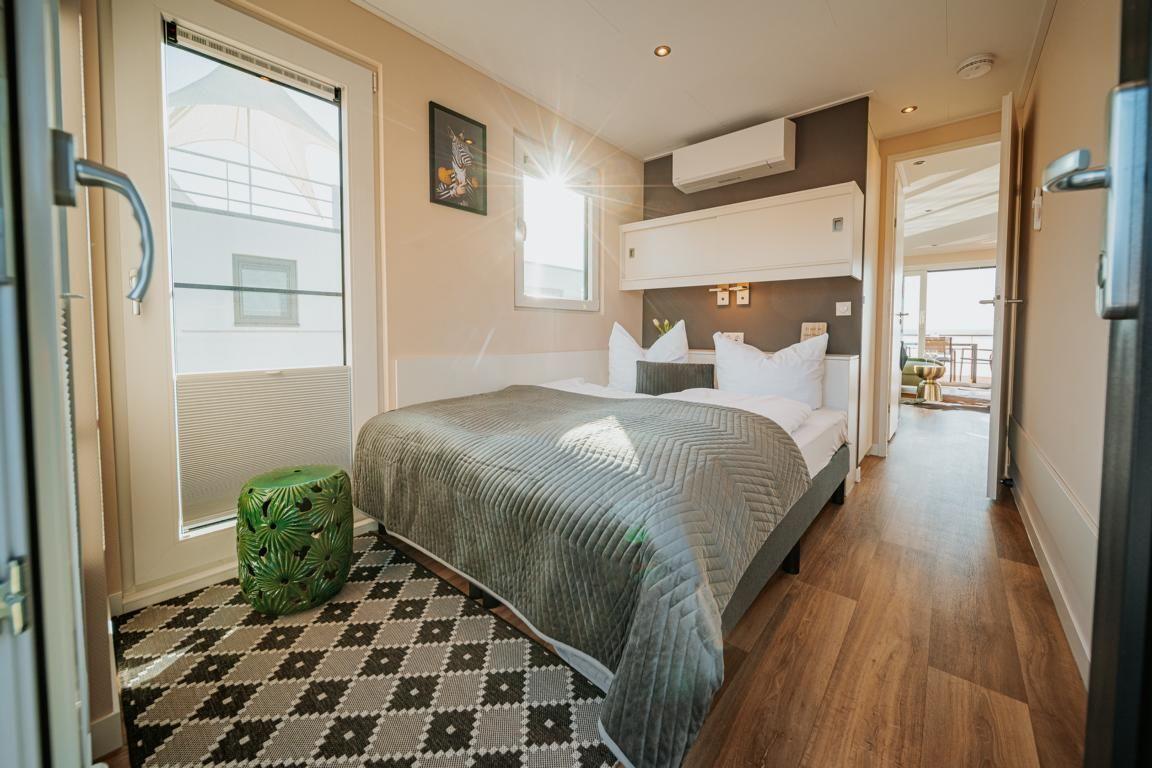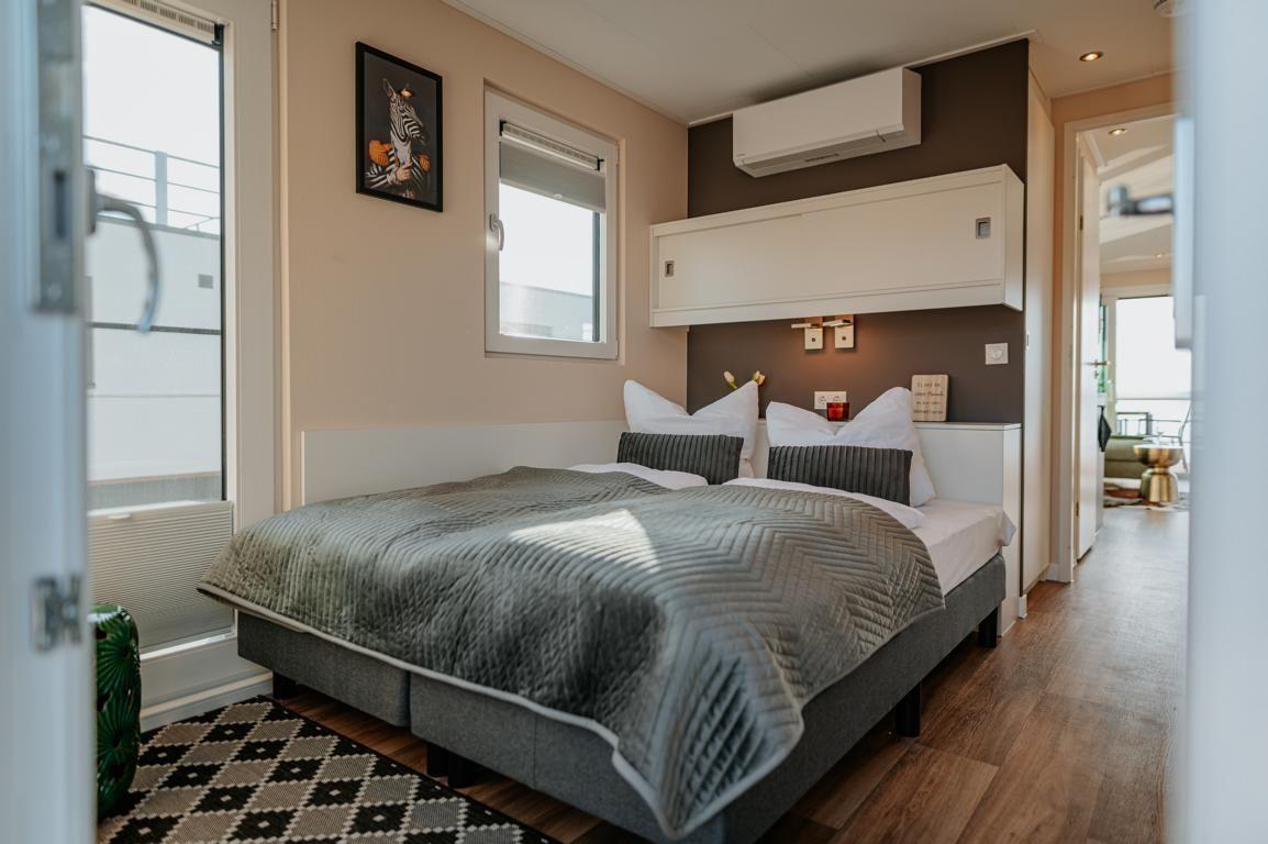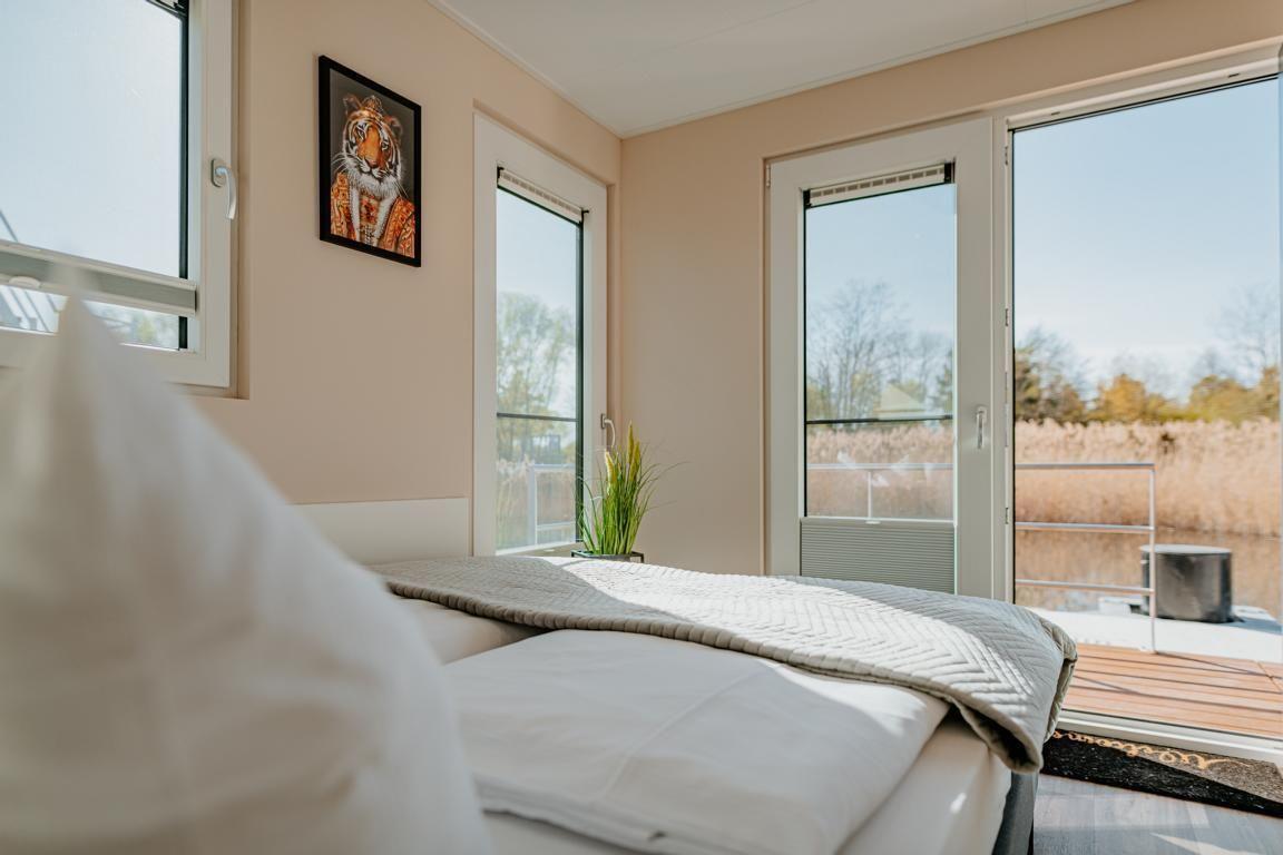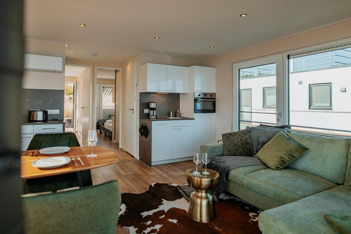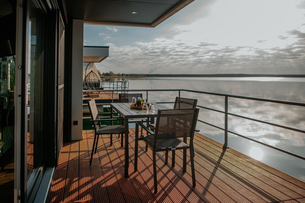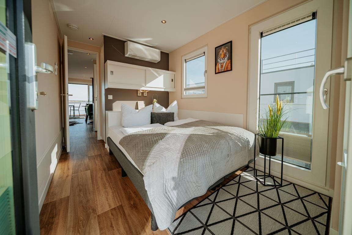 Floatinghouse Seeblick: freistehendes Hausboot auf dem Wasser (44 m²) mit Seeblick, Steg und überdachter Terrasse mit Gartenmöbeln, Sonnenliegen und Sonnenschutz. Für bis zu 6 Personen, 2 Schlafzimmer, 1 Bad. Offene Küche zum Wohnbereich mit Ceranherd, Spülmaschine, Kaffeemaschine u.v.m. WLAN, TV, Klimaanlage, Elektroheizung und Gaskamin; Nichtraucher, kinder- und haustierfreundlich.