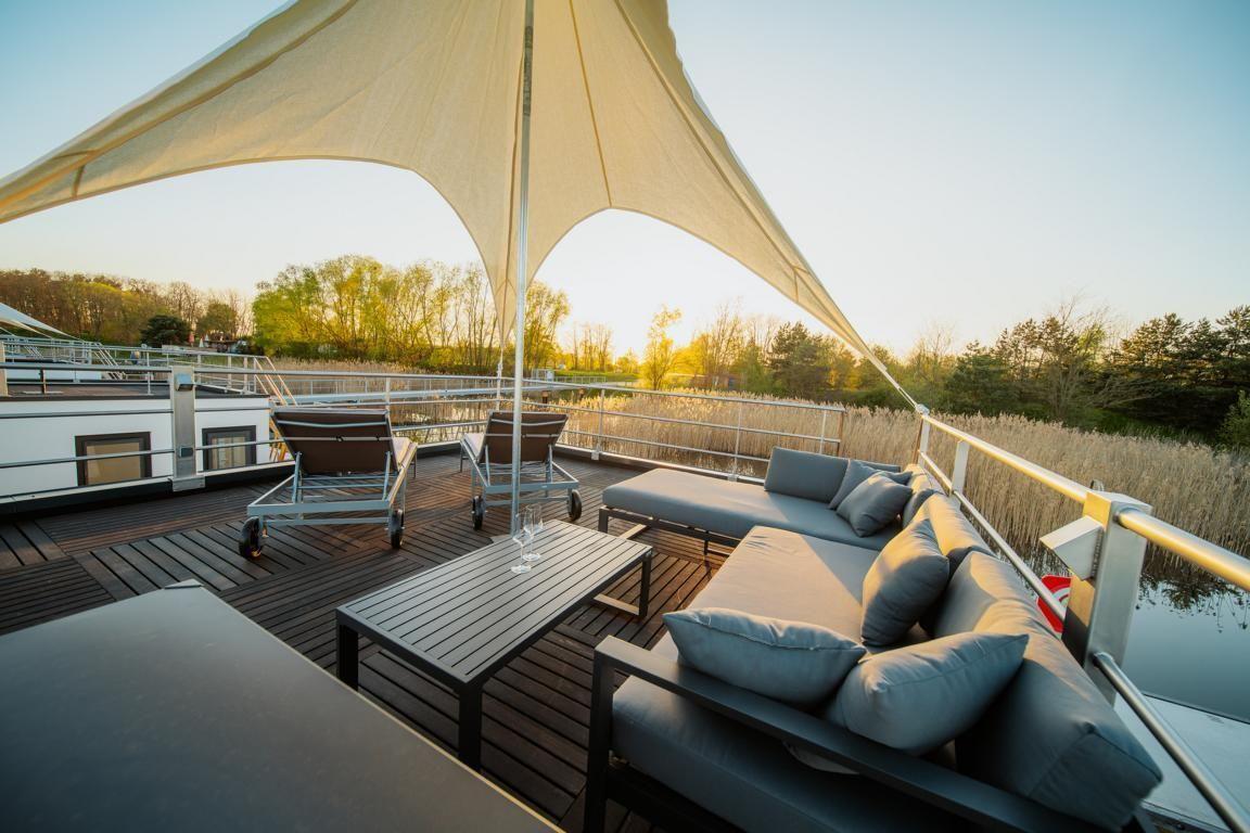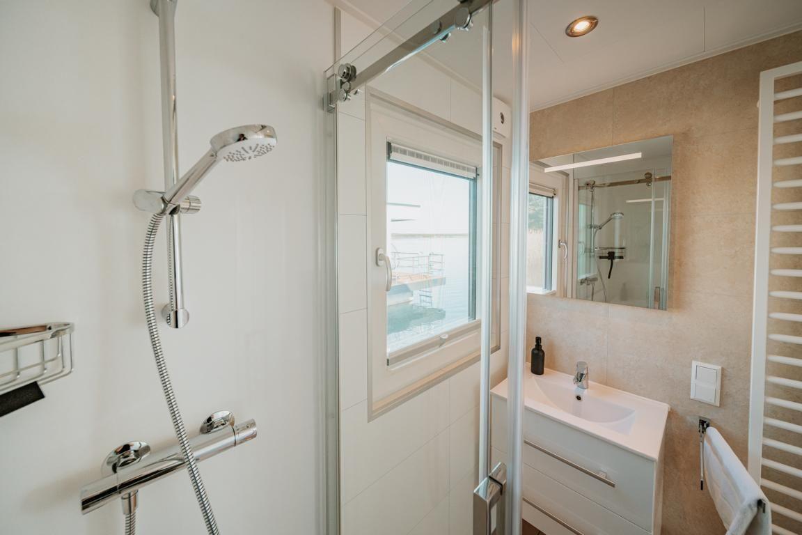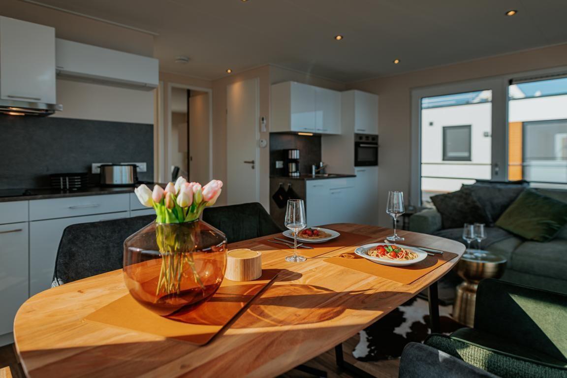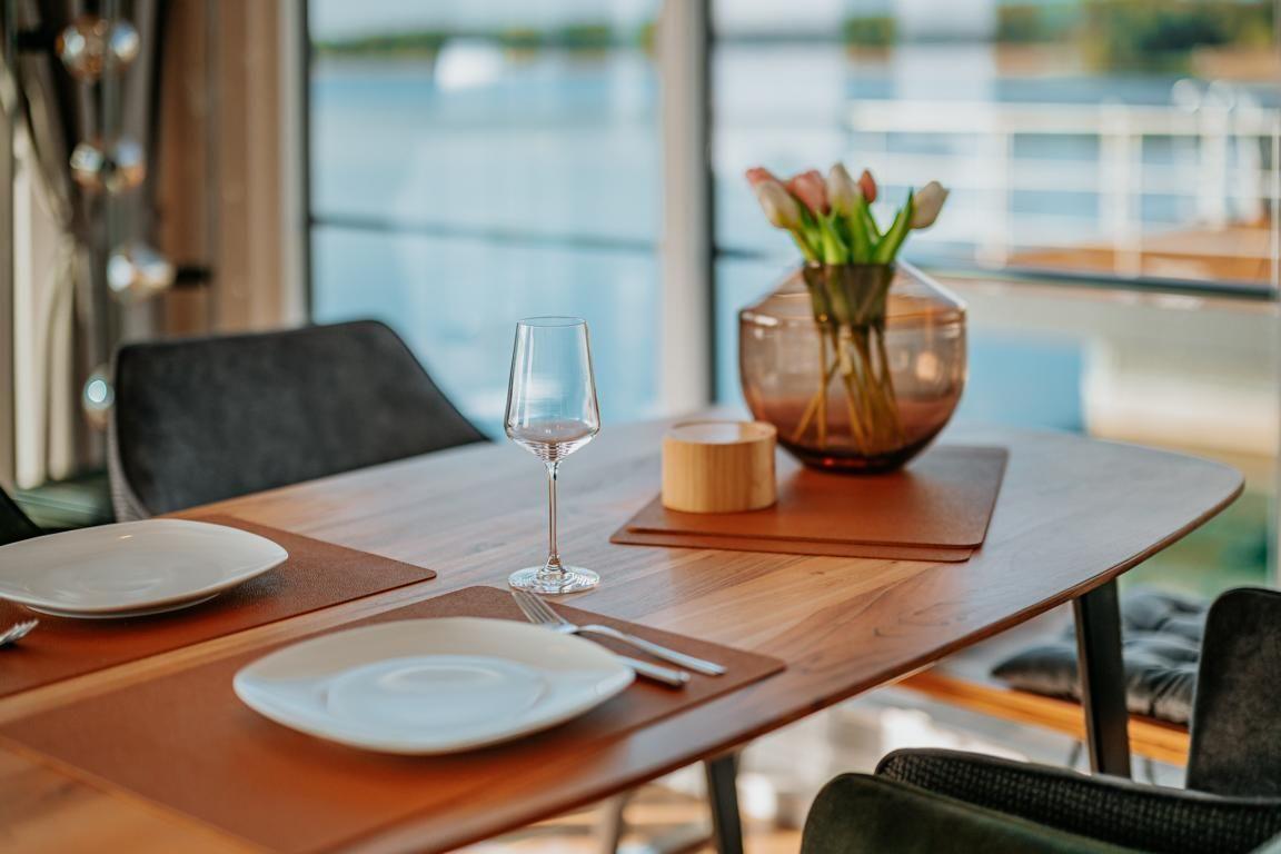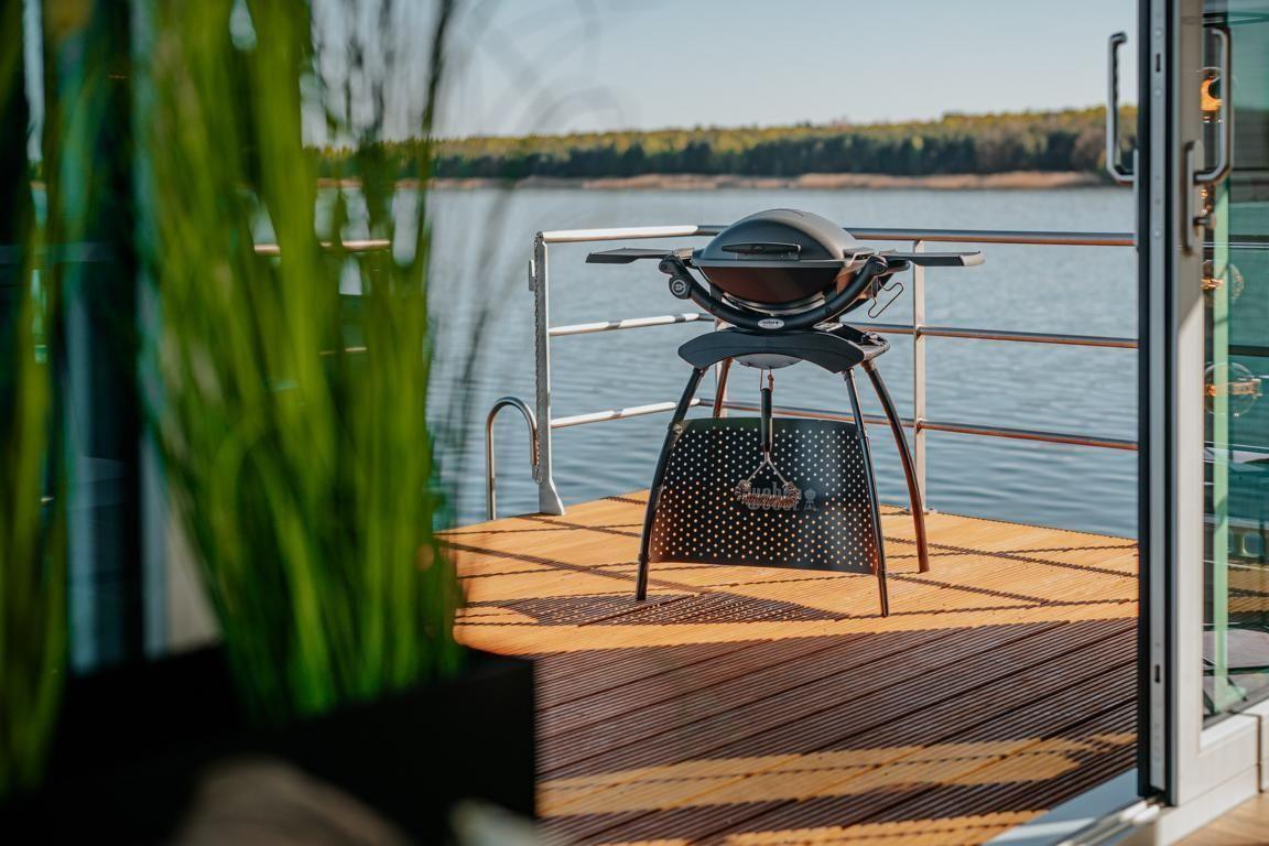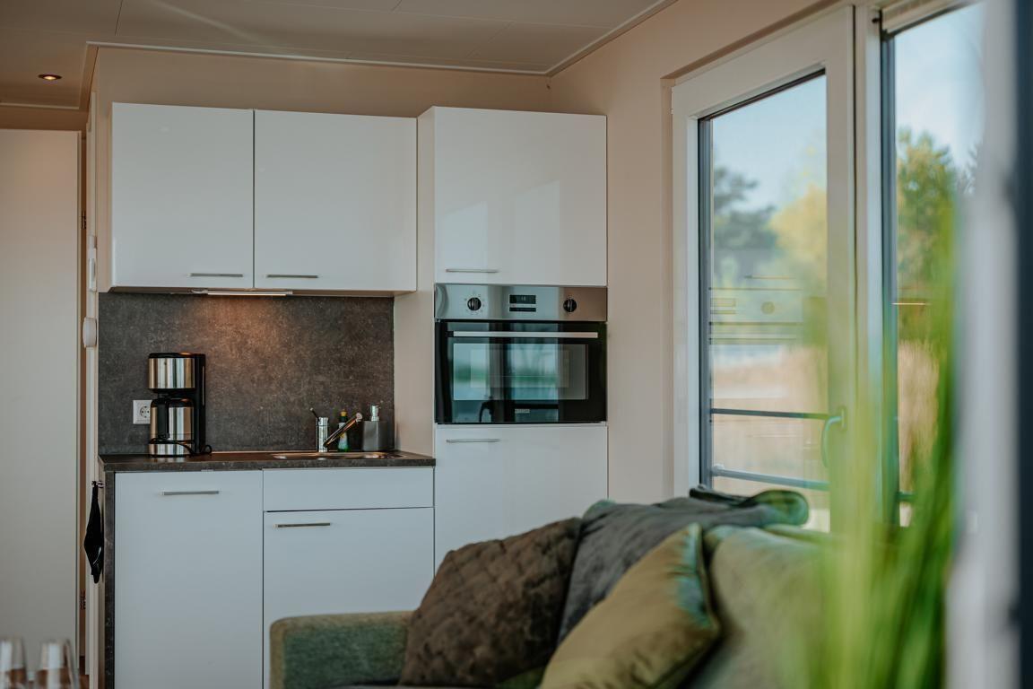 Floatinghouse Seeblick: freistehendes Hausboot auf dem Wasser (44 m²) mit Seeblick, Steg und überdachter Terrasse mit Gartenmöbeln, Sonnenliegen und Sonnenschutz. Für bis zu 6 Personen, 2 Schlafzimmer, 1 Bad. Offene Küche zum Wohnbereich mit Ceranherd, Spülmaschine, Kaffeemaschine u.v.m. WLAN, TV, Klimaanlage, Elektroheizung und Gaskamin; Nichtraucher, kinder- und haustierfreundlich.