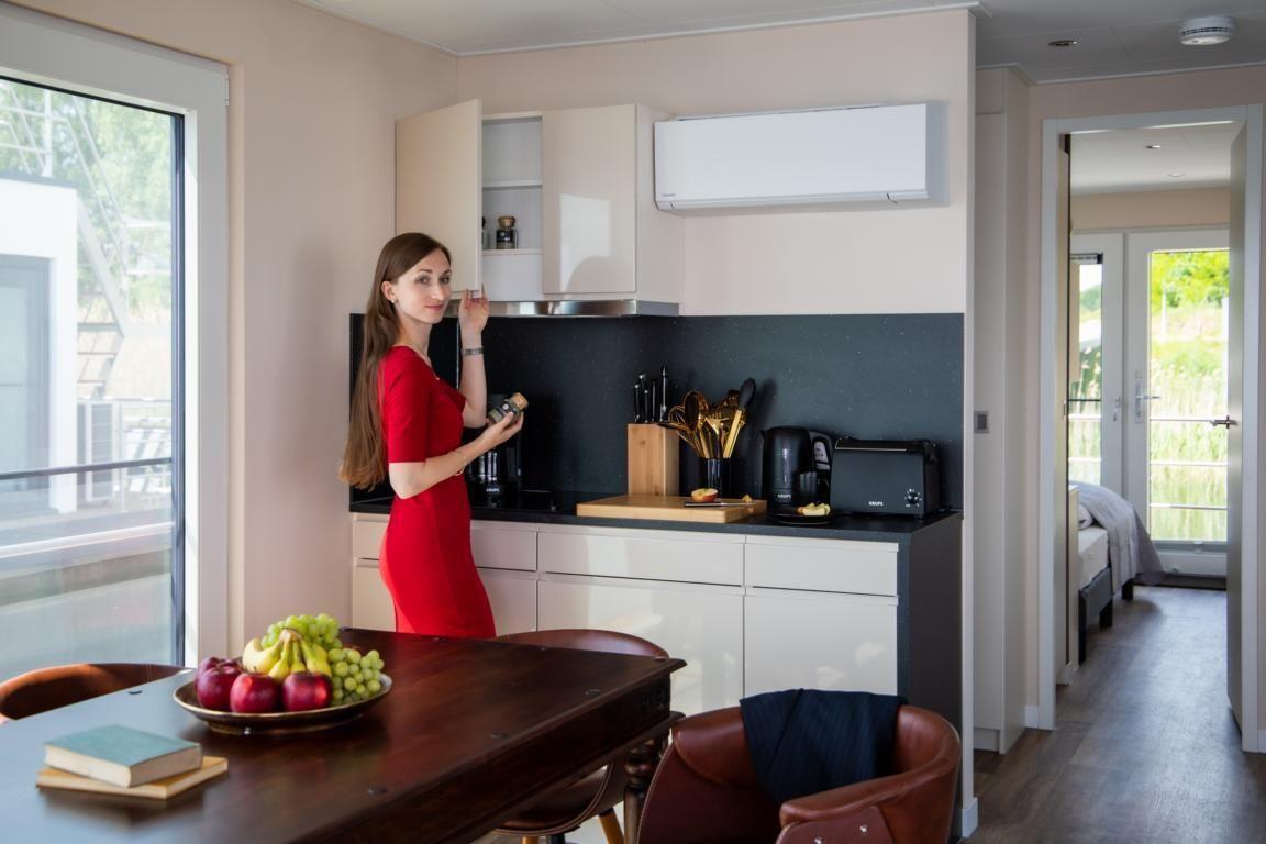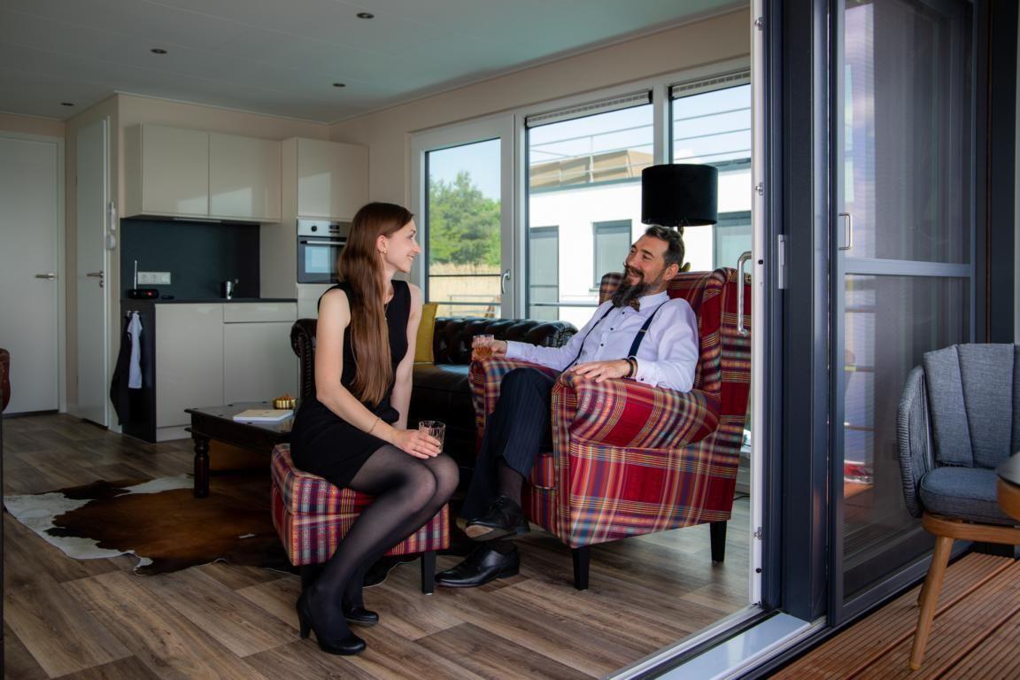 Floatinghouse King: freistehendes 44 m² Floatinghouse auf dem Wasser mit See- und Landschaftsblick. Platz für 4 Personen, 3 Zimmer mit 2 Schlafzimmern und 1 Bad. Offene Küche zum Wohnzimmer mit Ceranherd und Spülmaschine. Überdachte Terrasse mit Gartenmöbeln, Sonnenliegen und Elektrogrill am Steg. WLAN/TV, Klimaanlage, Gaskamin, familienfreundlich und Nichtraucher.