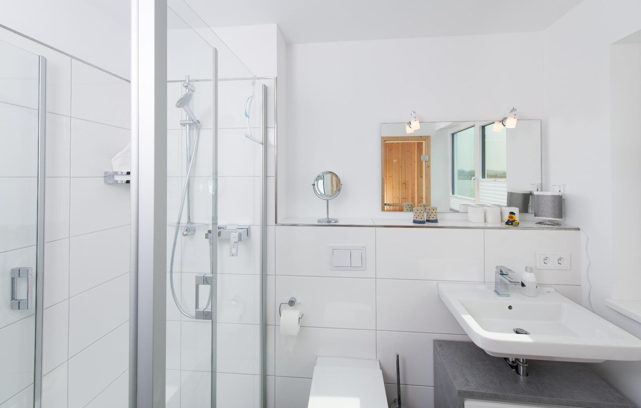 På første sal er også soveværelset med sit eget personlige wellness-program: et spabad, en sauna (infrarød varmekabine) med udsigt over vandet og en bruser gør dette badeværelse til et privat wellness-område.