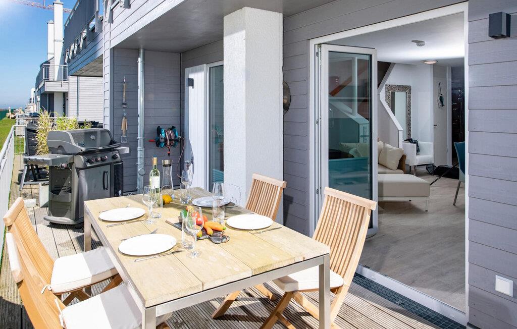 Højdepunktet ved feriehuset Villa Kunterbunt er den store tagterrasse, der giver jer panoramaudsigt over Slien og havnen i OstseeResort.