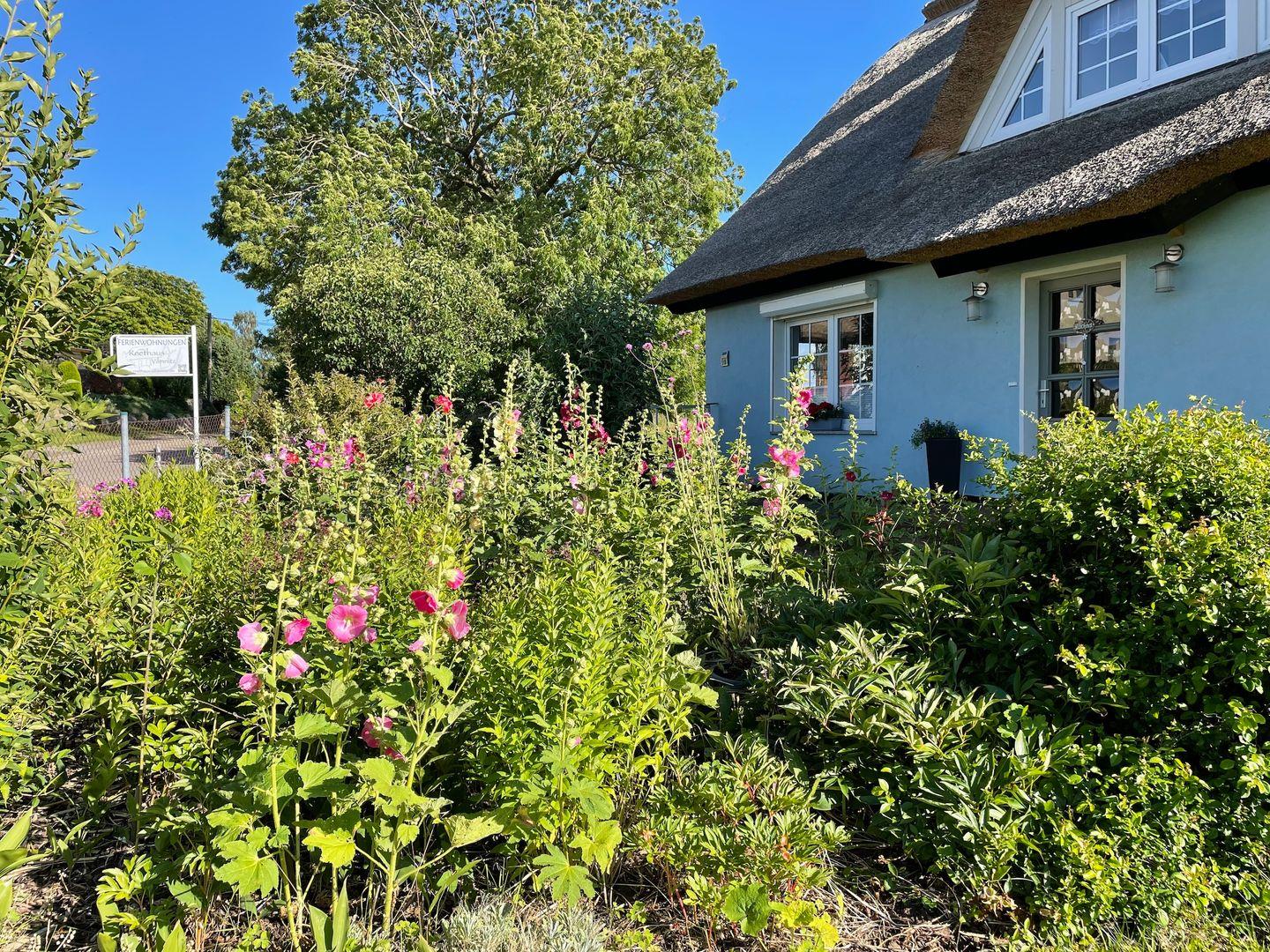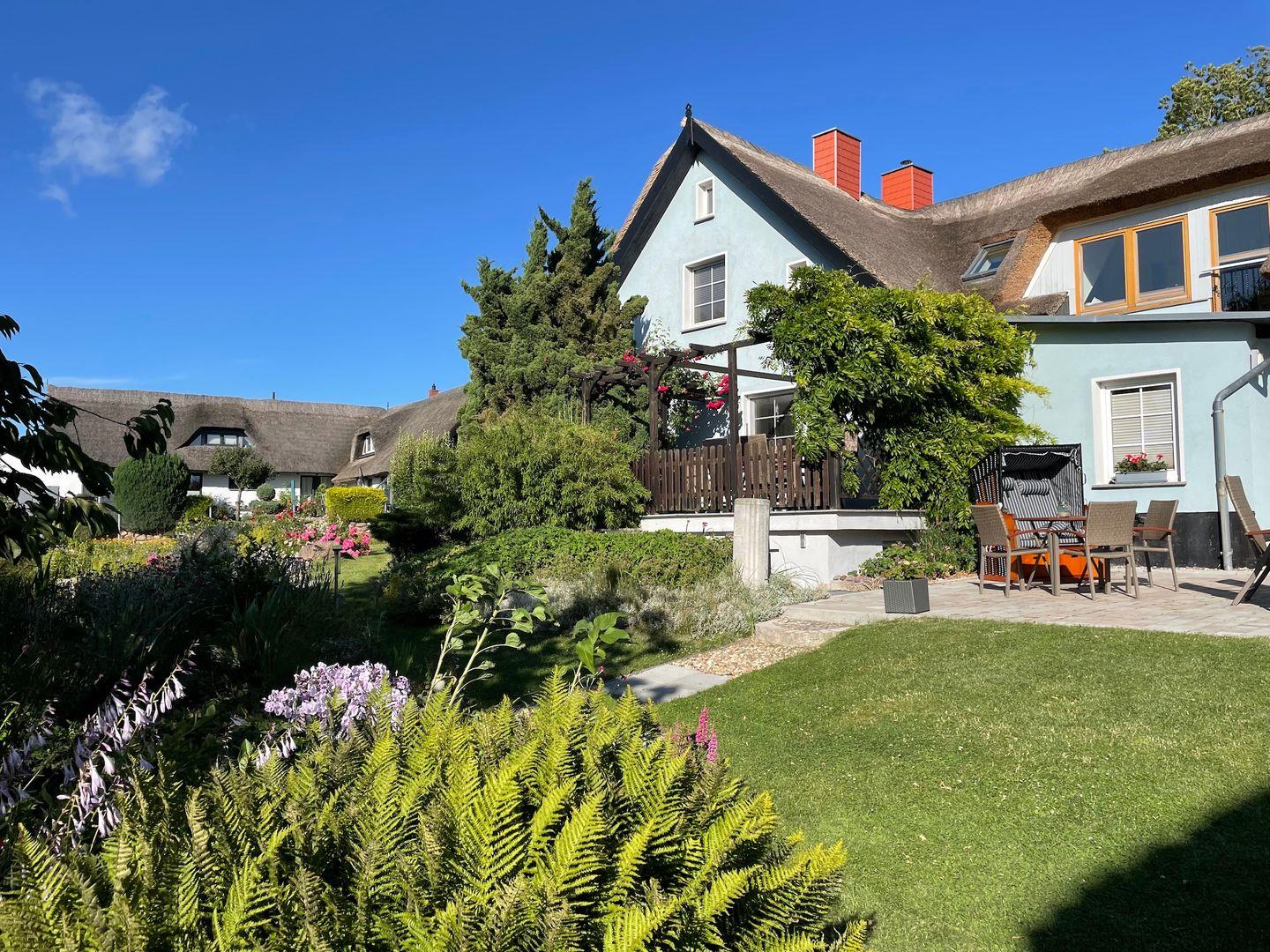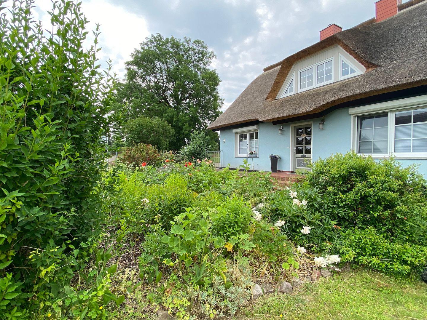 In dem kleinen, wunderschönen Örtchen Vilmnitz, direkt an der "Deutschen Alleenstraße" zwischen dem Ostseebad Binz und der zauberhaften Residenzstadt Putbus gelegen, befinden sich im reetgedeckten Ferienhaus insgesamt drei Ferienwohnungen. Die Ferienwohnung "Vilm" befindet sich im Erdgeschoß des Reetdachhauses. Die Ferienwohnungen "Goor" und "Muglitz" sind über eine separate Außentreppe im 1. OG zu erreichen. Die Wohnung "Vilm" mit einer Wohnfläche von ca. 105qm bietet Platz für maximal 5 Personen. Die Wohnung "Goor" mit einer Wohnfläche von ca. 92 qm bietet Platz für insgesamt 5 Personen. Die Wohnung "Muglitz" mit einer Wohnfläche von ca. 50 qm bietet Platz für insgesamt 3 Personen. Alle drei Wohnungen zusammen sind ideal für einen Urlaub mit Freunden oder in Großfamilie. Im liebevoll angelegten Bauerngarten stehen ausreichend Sitz-und Grillmöglichkeiten zur gemeinschaftlichen Nutzung zur Verfügung.Das insgesamt ca. 3000 qm große eingezäunte Grundstück verfügt über einen gepflasterten Vorplatz, über den man den großen Carport mit 3 Stellplätzen und Fahrradunterstellmöglichkeiten erreicht. Ihr Elektroauto können Sie während Ihres Aufenthaltes an der privaten E-Ladesäule im Carport laden. Im Haus gibt es ein WLAN und eine gemeinschaftliche Waschmaschine.