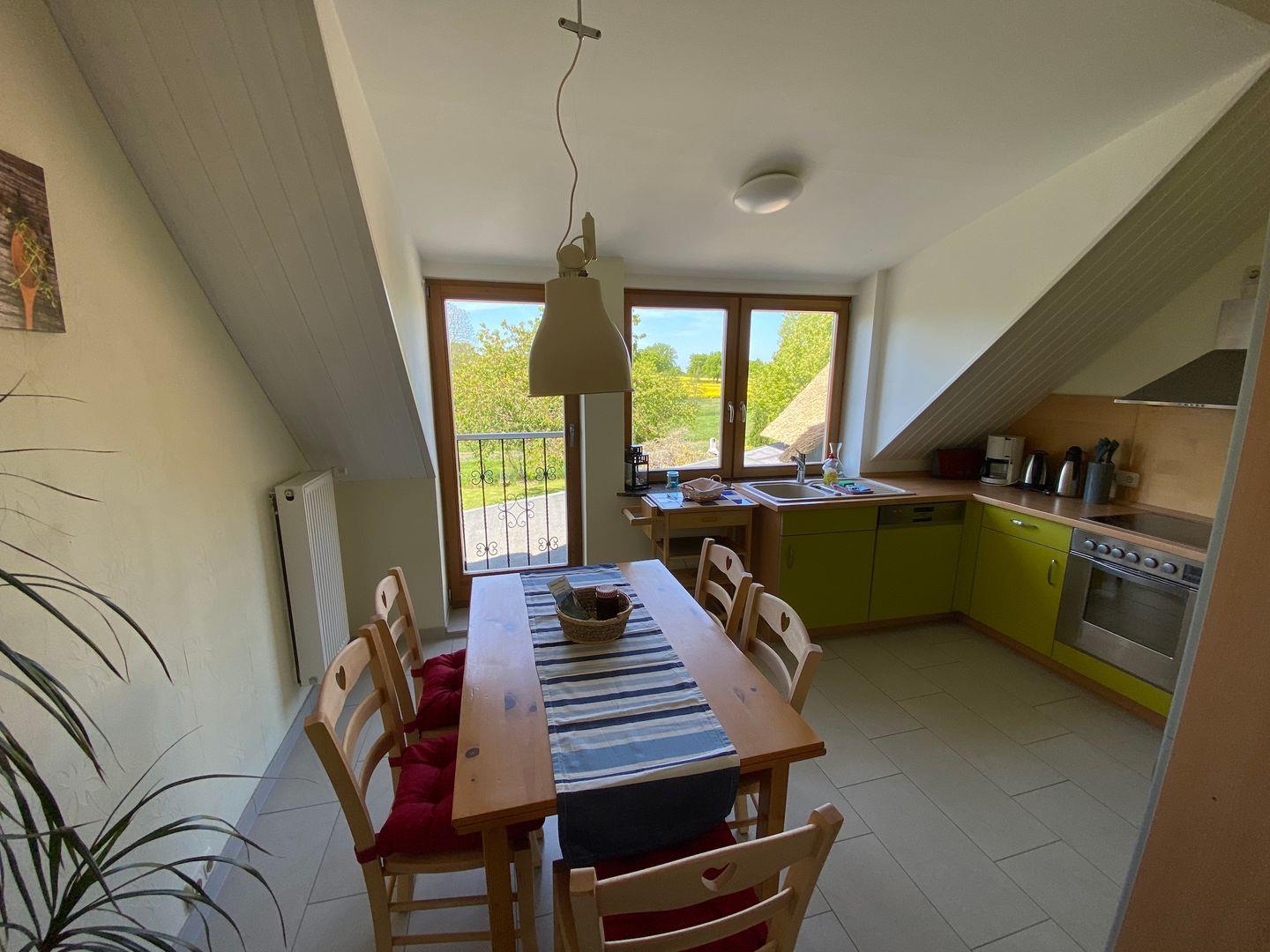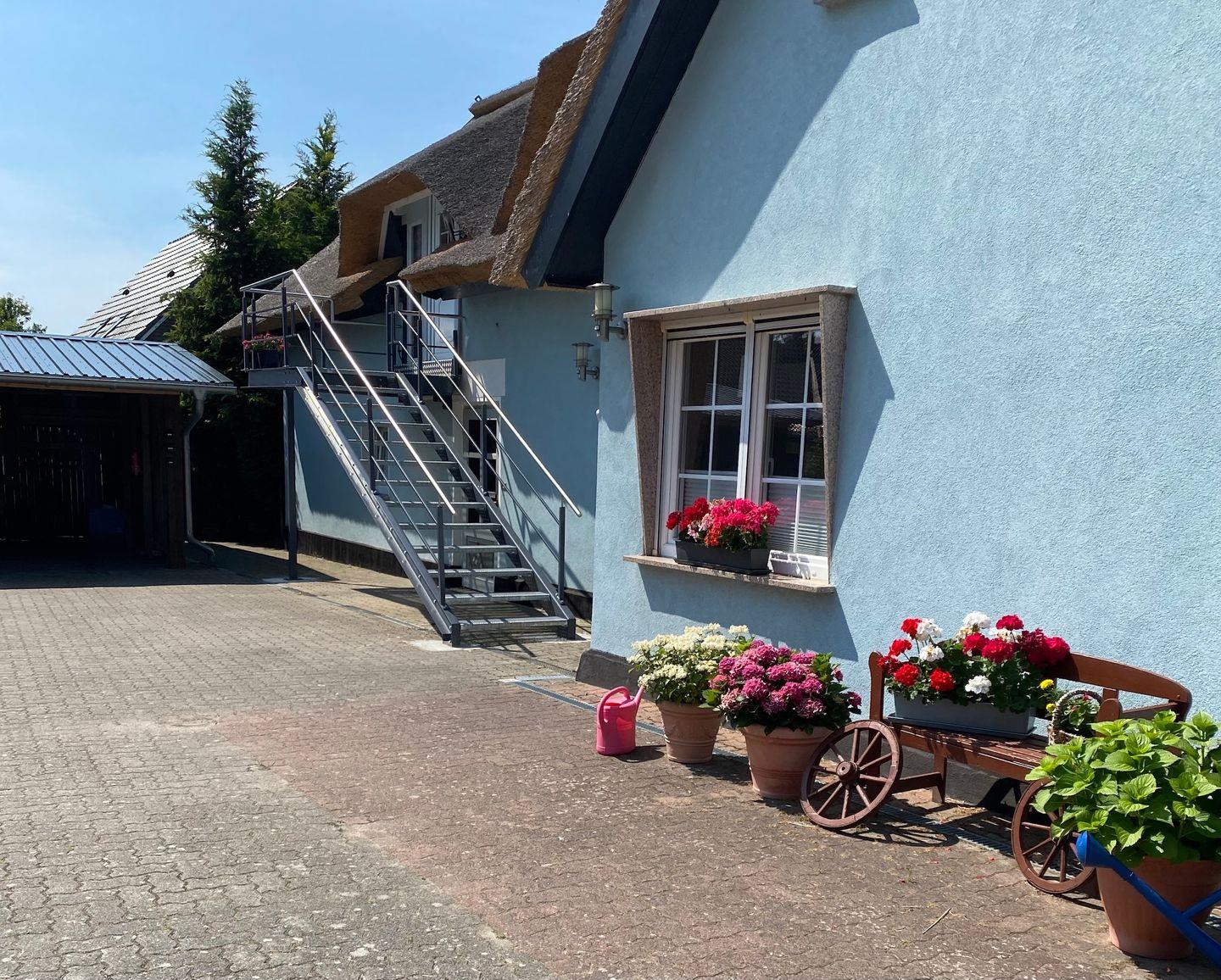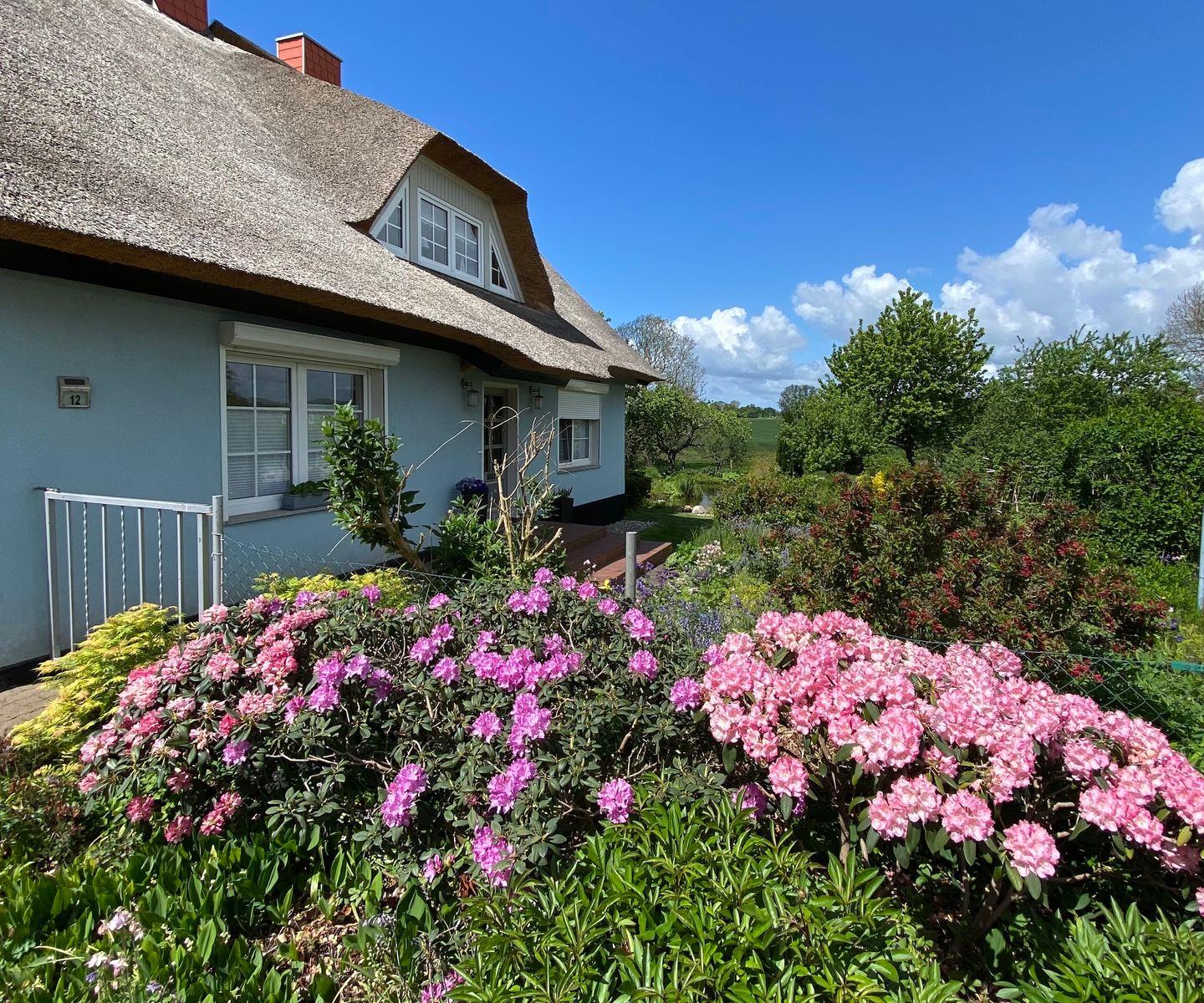 In dem kleinen, wunderschönen Örtchen Vilmnitz, direkt an der "Deutschen Alleenstraße" zwischen dem Ostseebad Binz und der zauberhaften Residenzstadt Putbus gelegen, befinden sich im reetgedeckten Ferienhaus insgesamt drei Ferienwohnungen. Die Ferienwohnung "Vilm" befindet sich im Erdgeschoß des Reetdachhauses. Die Ferienwohnungen "Goor" und "Muglitz" sind über eine separate Außentreppe im 1. OG zu erreichen. Die Wohnung "Vilm" mit einer Wohnfläche von ca. 105qm bietet Platz für maximal 5 Personen. Die Wohnung "Goor" mit einer Wohnfläche von ca. 92 qm bietet Platz für insgesamt 5 Personen. Die Wohnung "Muglitz" mit einer Wohnfläche von ca. 50 qm bietet Platz für insgesamt 3 Personen. Alle drei Wohnungen zusammen sind ideal für einen Urlaub mit Freunden oder in Großfamilie. Im liebevoll angelegten Bauerngarten stehen ausreichend Sitz-und Grillmöglichkeiten zur gemeinschaftlichen Nutzung zur Verfügung.Das insgesamt ca. 3000 qm große eingezäunte Grundstück verfügt über einen gepflasterten Vorplatz, über den man den großen Carport mit 3 Stellplätzen und Fahrradunterstellmöglichkeiten erreicht. Ihr Elektroauto können Sie während Ihres Aufenthaltes an der privaten E-Ladesäule im Carport laden. Im Haus gibt es ein WLAN und eine gemeinschaftliche Waschmaschine.