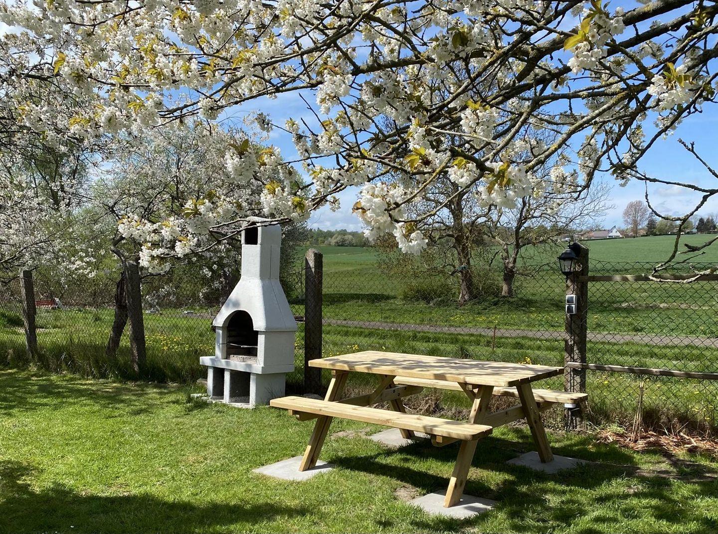 Ein Kinderbett sowie ein Hochstuhl sind vorhanden.