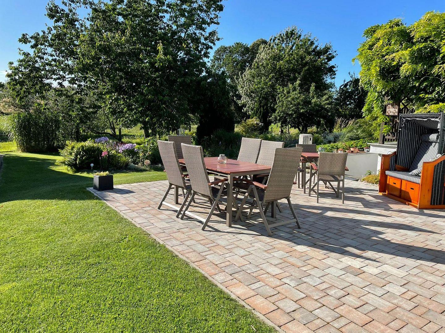 In dem kleinen, wunderschönen Örtchen Vilmnitz, direkt an der "Deutschen Alleenstraße" zwischen dem Ostseebad Binz und der zauberhaften Residenzstadt Putbus gelegen, befinden sich im reetgedeckten Ferienhaus insgesamt drei Ferienwohnungen. Die Ferienwohnung "Vilm" befindet sich im Erdgeschoß des Reetdachhauses. Die Ferienwohnungen "Goor" und "Muglitz" sind über eine separate Außentreppe im 1. OG zu erreichen. Die Wohnung "Vilm" mit einer Wohnfläche von ca. 105qm bietet Platz für maximal 5 Personen. Die Wohnung "Goor" mit einer Wohnfläche von ca. 92 qm bietet Platz für insgesamt 5 Personen. Die Wohnung "Muglitz" mit einer Wohnfläche von ca. 50 qm bietet Platz für insgesamt 3 Personen. Alle drei Wohnungen zusammen sind ideal für einen Urlaub mit Freunden oder in Großfamilie. Im liebevoll angelegten Bauerngarten stehen ausreichend Sitz-und Grillmöglichkeiten zur gemeinschaftlichen Nutzung zur Verfügung. Das insgesamt ca. 3000 qm große eingezäunte Grundstück verfügt über einen gepflasterten Vorplatz, über den man den großen Carport mit 3 Stellplätzen und Fahrradunterstellmöglichkeiten erreicht. Ihr Elektroauto können Sie während Ihres Aufenthaltes an der privaten E-Ladesäule im Carport laden. Im Haus gibt es ein WLAN und eine gemeinschaftliche Waschmaschine.