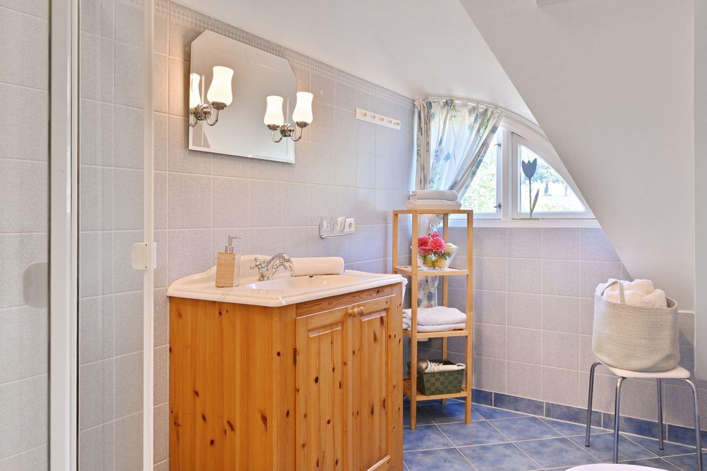 Das Bad im Obergeschoß verfügt über eine Dusche und Haartrockner und hat ein Fenster. Im Schlafzimmer gibt es ein Doppelbett.