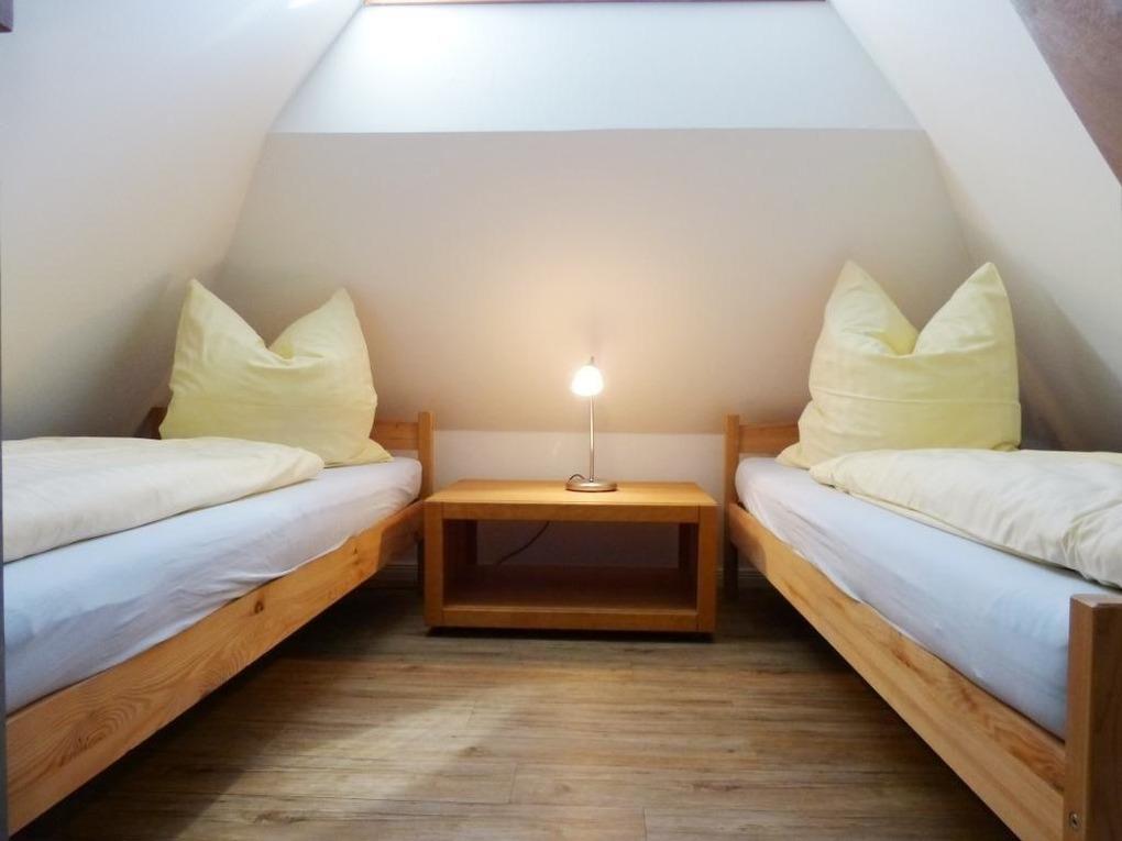 Im Obergeschoss liegen 2 geräumige Schlafzimmer, ein Schlafraum mit einem Doppelbett und ein Schlafraum mit 2 getrennten Betten. Durch einen Schlafraum gelangt man in den geräumigen Spitzboden mit 2 getrennten Betten.
