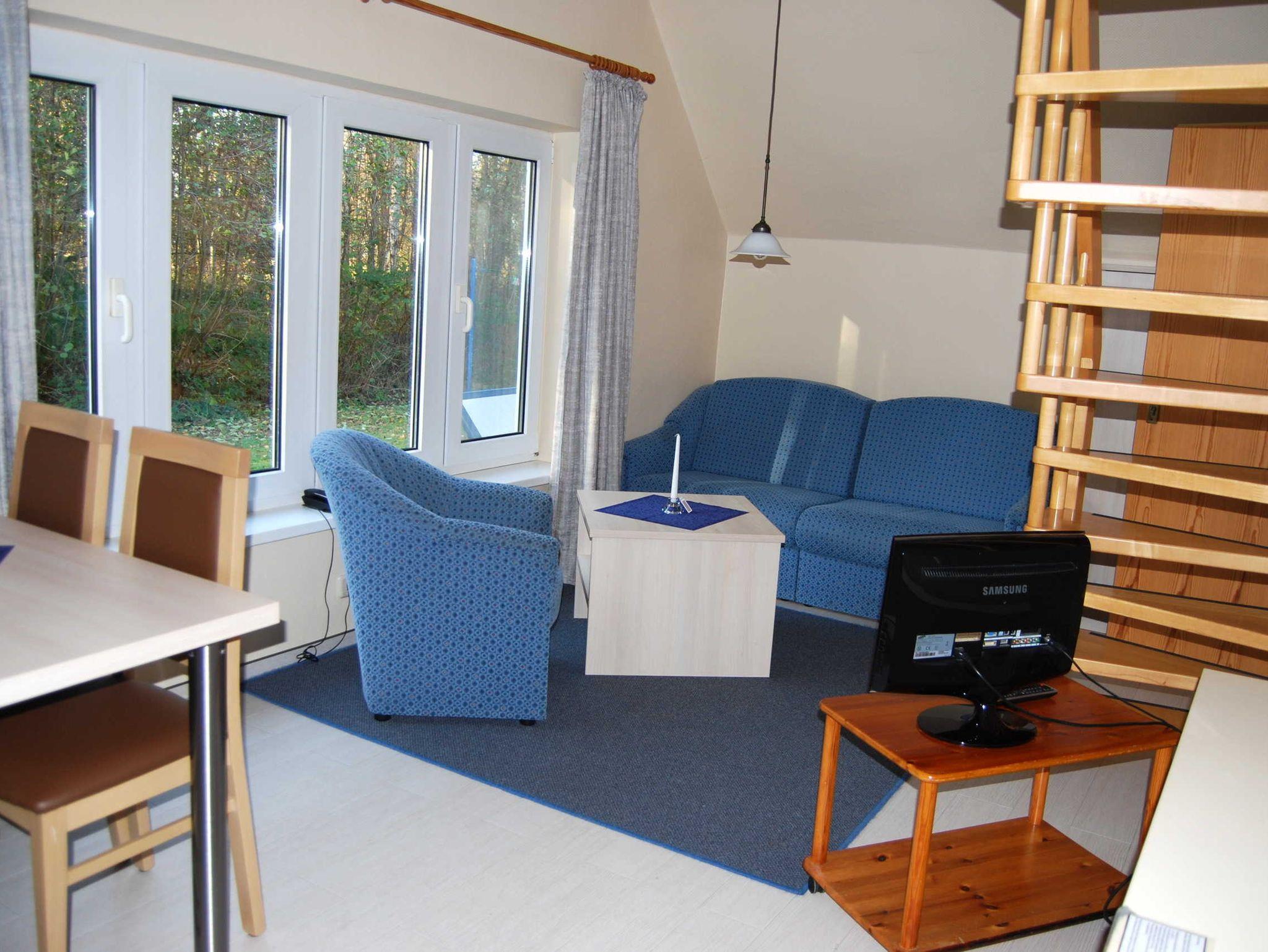 Die Ferienhaushälfte südlich von Vitte ist in Erdgeschoss und Spitzboden aufgeteilt. Der Wohnbereich ist mit einer ausziehbaren Schlafcouch, Sessel, Esstisch, und Pantryküche sowie Farb-TV ausgestattet. Das Bad besitzt Dusche und WC. Eine Raumspartreppe führt zum offenen Schlafraum mit zwei Betten unter dem Spitzdach.