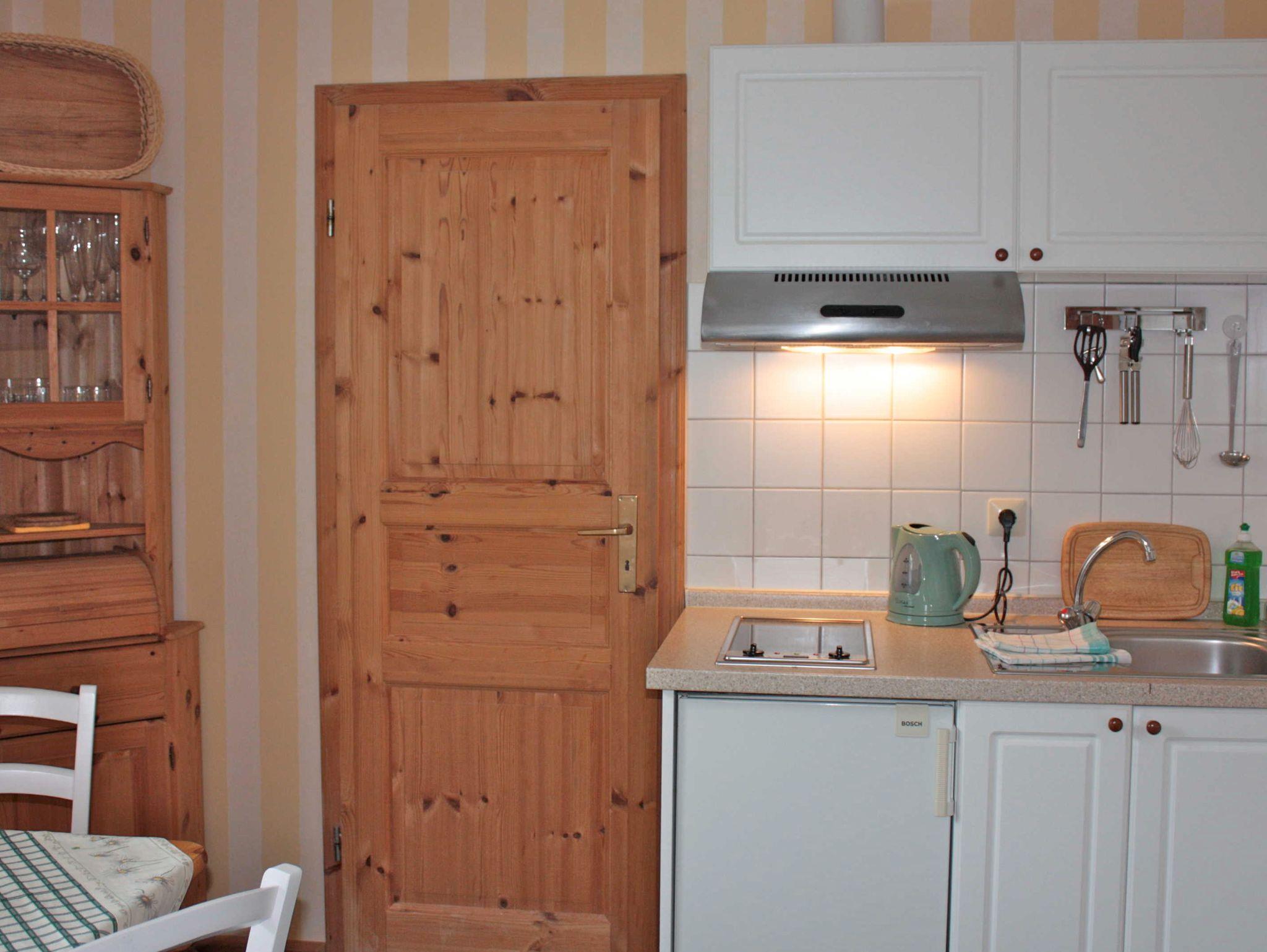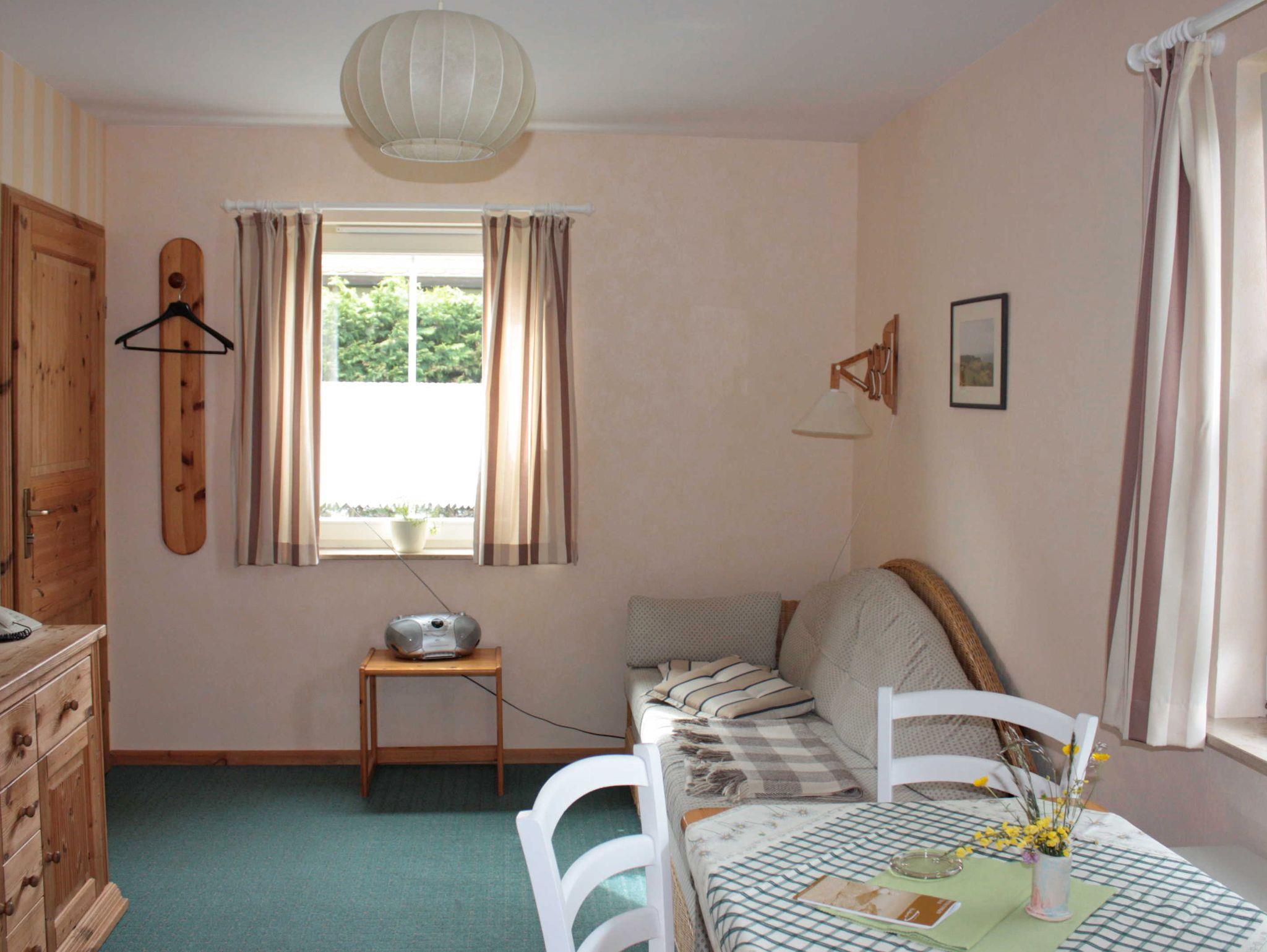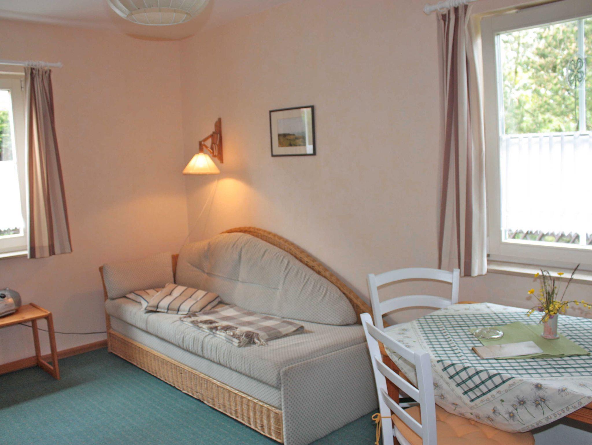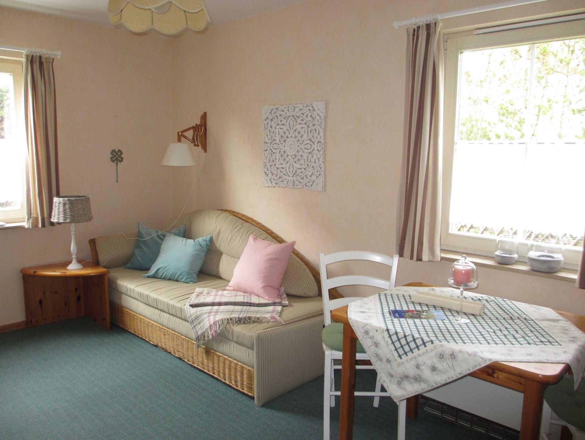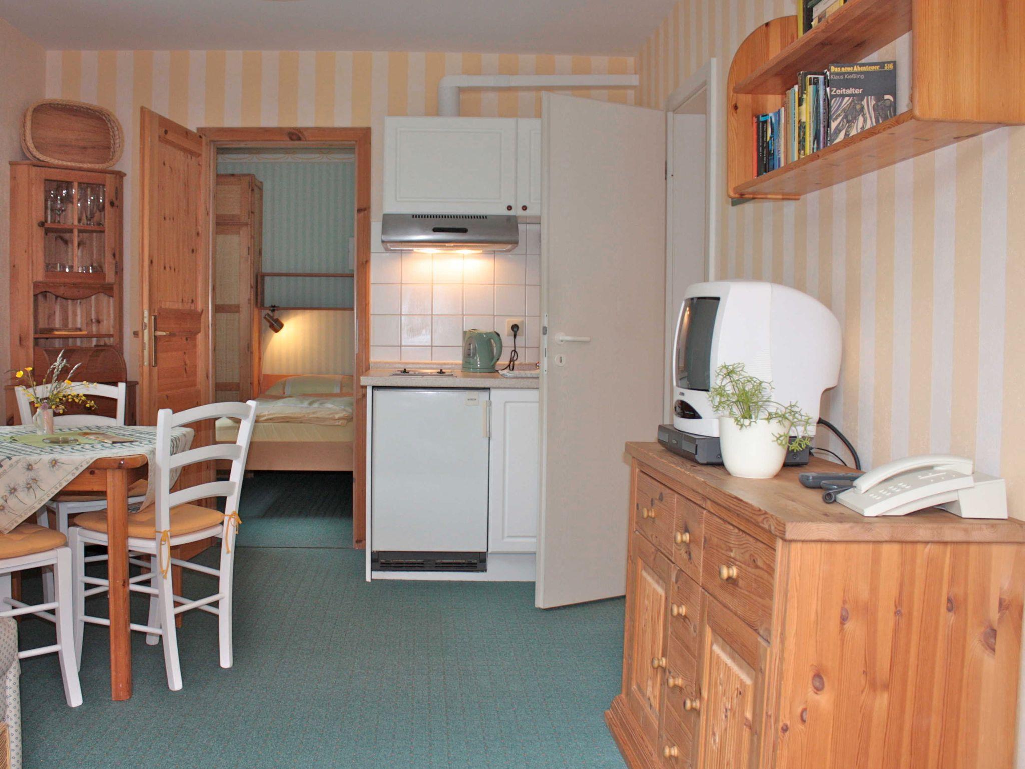 Diese Ferienwohnung befindet sich im Erdgeschoß auf der Nordseite des Hauses und hat eine Größe von ca. 27 m². Sie ist aufgeteilt in einen Schlafraum, Wohnraum mit Küchenzeile und Bad mit Dusche und WC. Das Doppelbett im Schlafzimmer hat eine Größe von 1,60m x 2,00m. Im Wohnzimmer steht, falls eine Aufbettung gewünscht wird eine Doppelbettcouch. Zur Wohnzimmerausstattung gehören außerdem W-LAN, ein Fernseher, Radio mit CD-Player und ein Telefon mit eigener Nummer. Die Küche hat folgende Ausstattung, Cerankochfeld, Kühlschrank mit kleinem Gefrierfach, Kaffeeautomat, Wasserkocher, Toaster sowie div. Geschirr und Küchenutensilien.