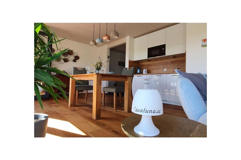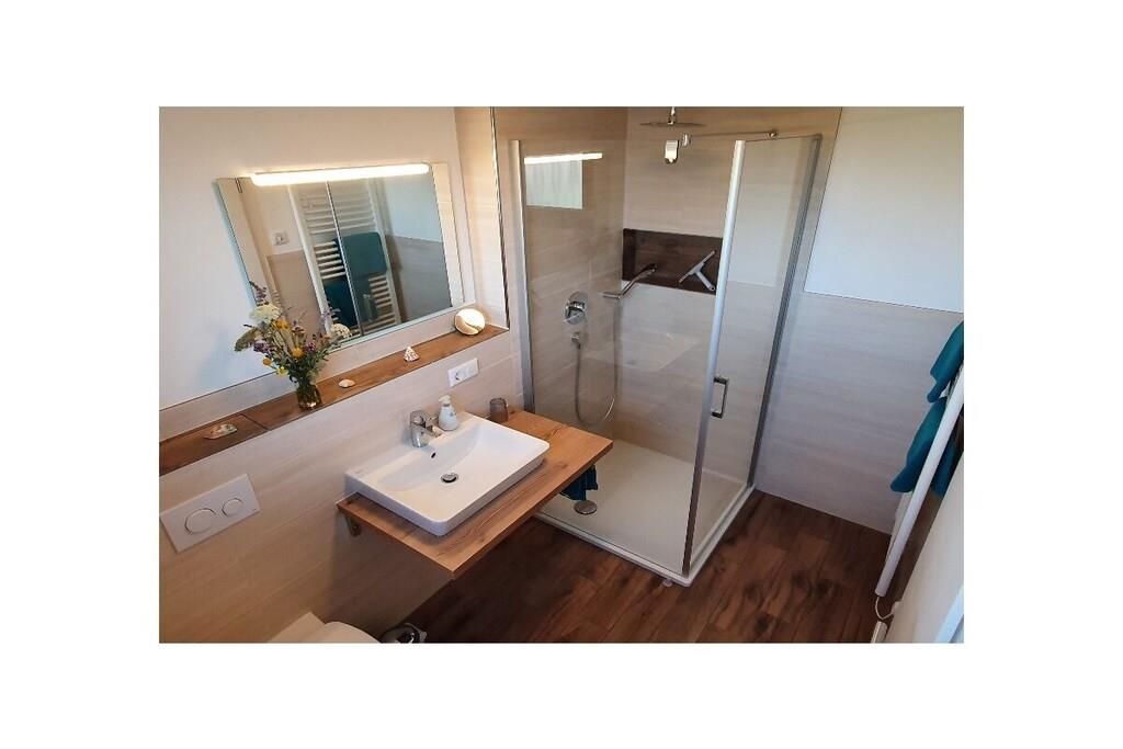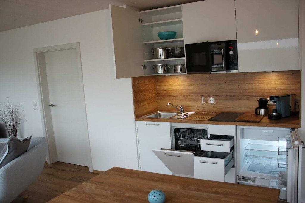 On the 1st floor: (Living/diningroom(Armchair, Sofa, Spices, Tea Towels, Kitchenette, TV, dining table, hob, coffee machine, microwave, dishwasher, fridge, freezer, heating), bedroom(Bed Linen, single sofa bed, double bed, heating), bathroom(Mirror, toilet, shower, washbasin, heating, hairdryer, Towels incl.)) Fire Alarm, Hot Water, Internet Access DSL, Internet Access ISDN, Internet access, First Aid, balcony(Sun Umbrella, garden furniture), heating, garden(Barbecue center, Garden shed), parking, parasol