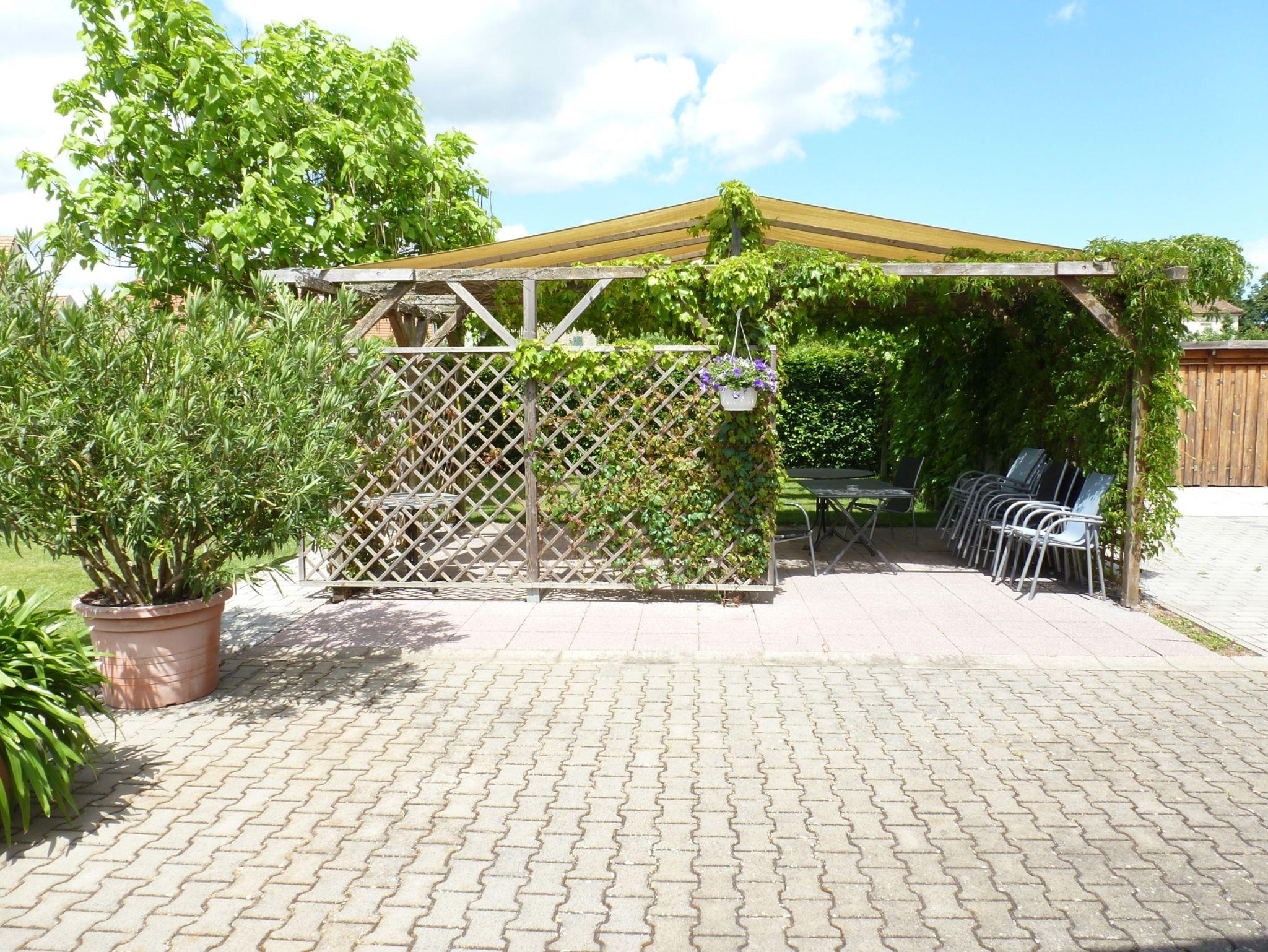 Weinlaube mit Grillkamin und große Liegewiese.