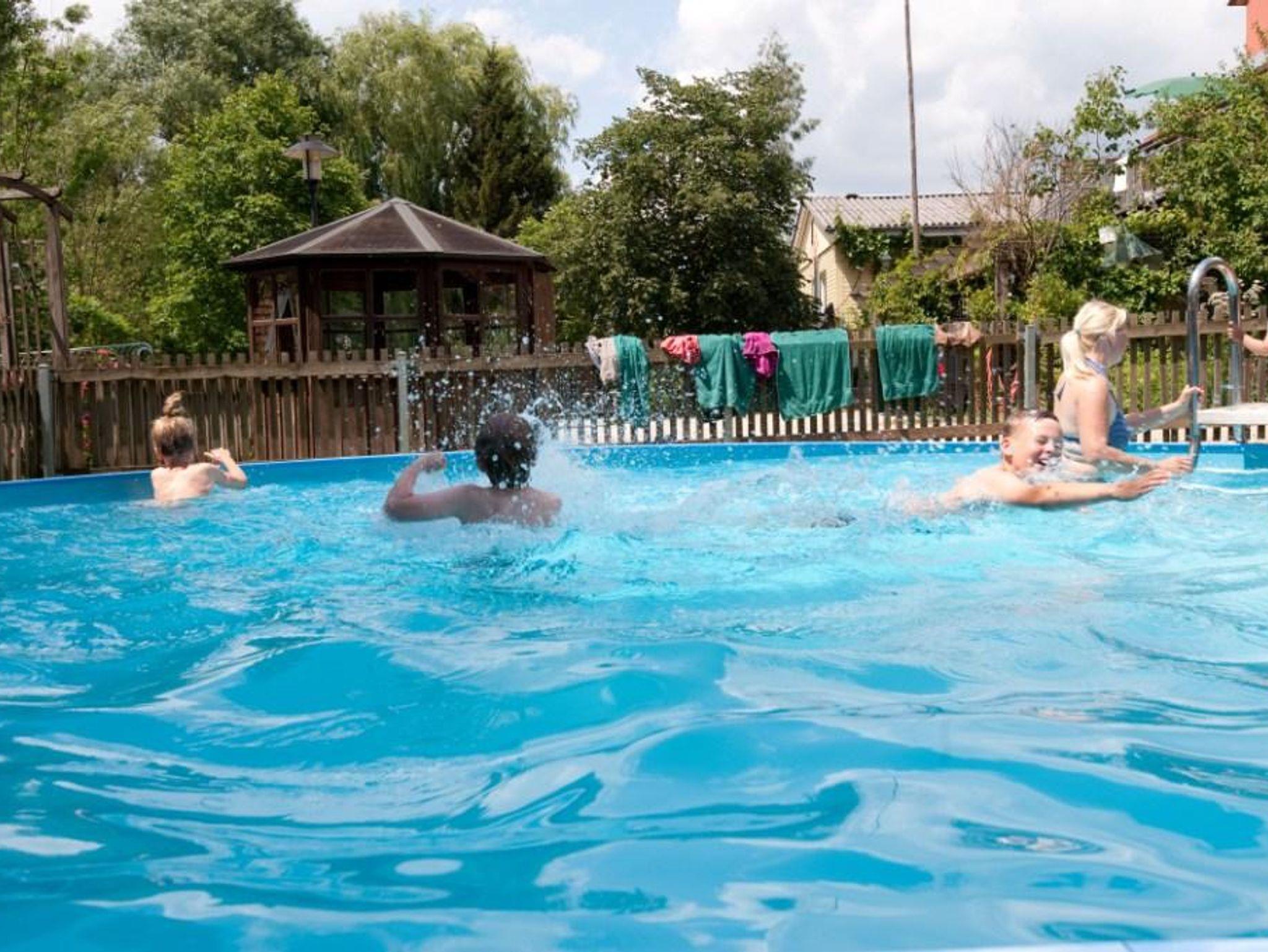 Blick zum Swimmingpool, Rießentrampolin, Spielplatz. Zu den Schlafzimmern geht eine steile Treppe