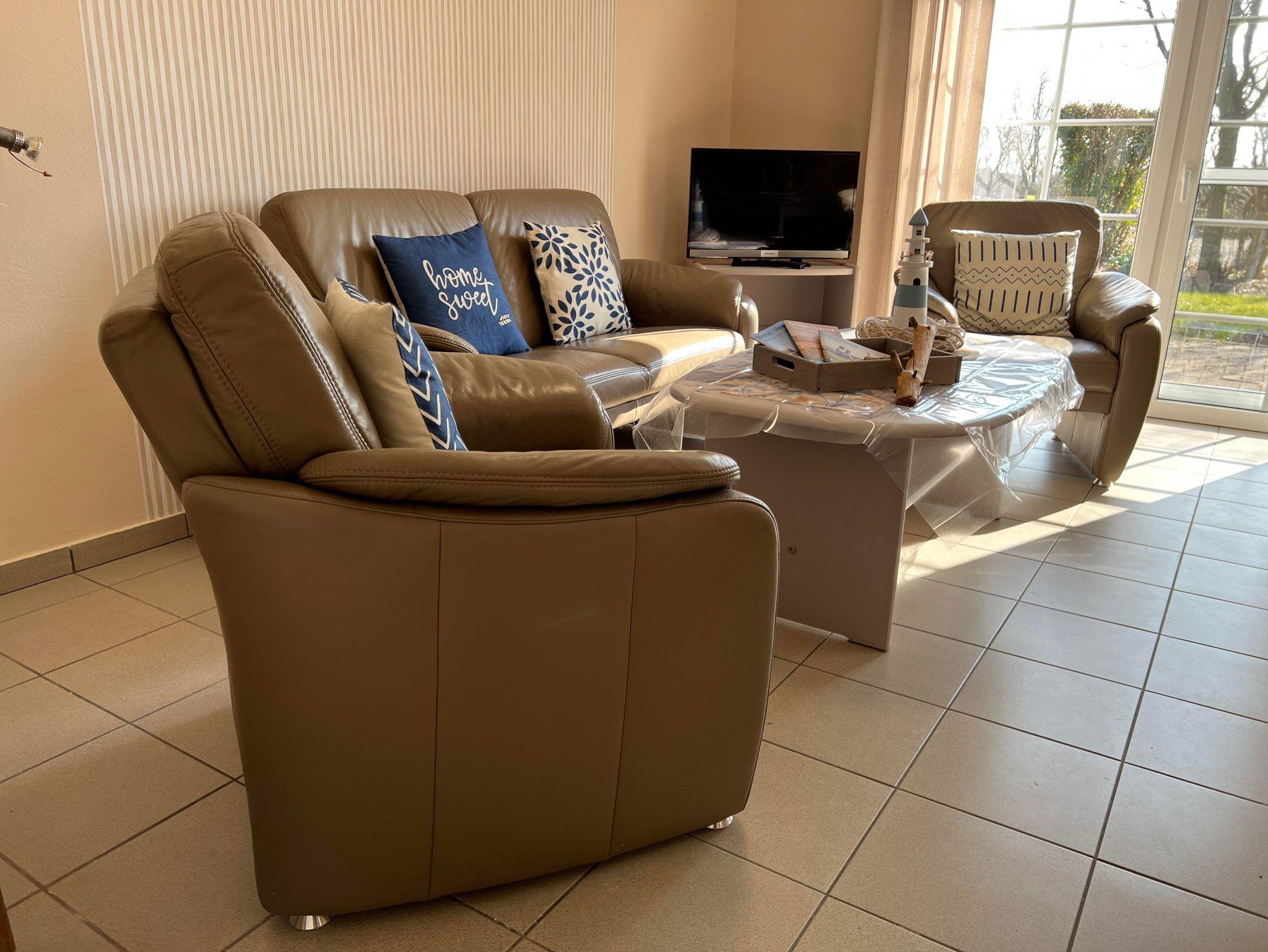 Im Wohnraum finden Sie eine schöne Ledermöbelgarnitur (Sitzecke), die zum Ausruhen einlädt.