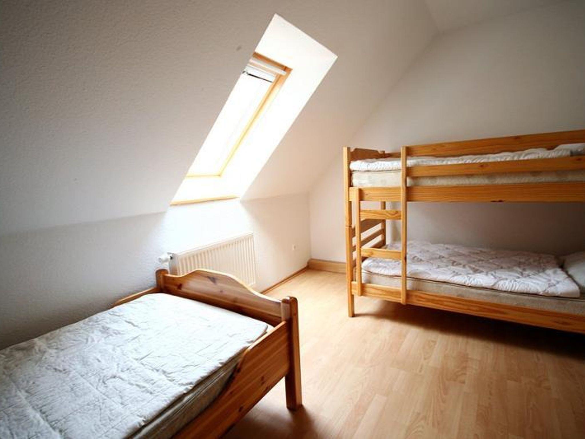 Die Unterkunft verfügt über zwei separate Schlafzimmer: eines mit Doppelbett und Etagenbett, das andere mit einem weiteren Doppelbett.