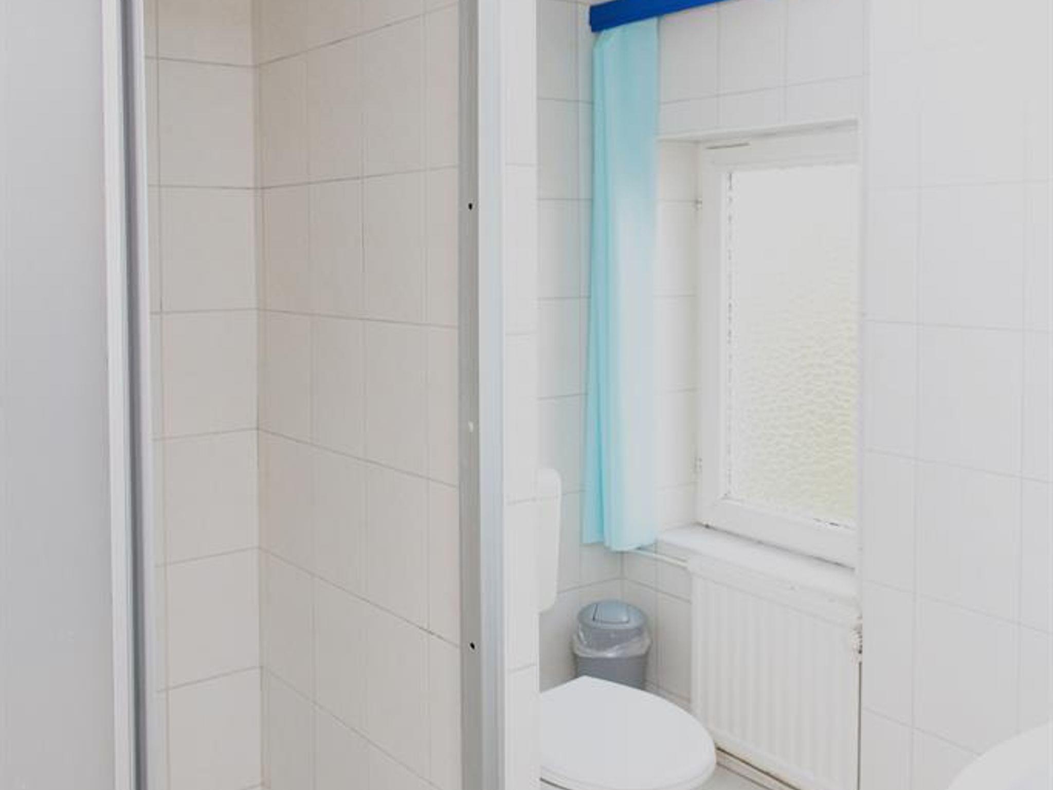 mit Herd und Backofen, Toaster, Wasserkocher, einem Schlafraum mit Doppelbett, einem Kinderzimmer mit Einzelbett und Duschbad mit WC.