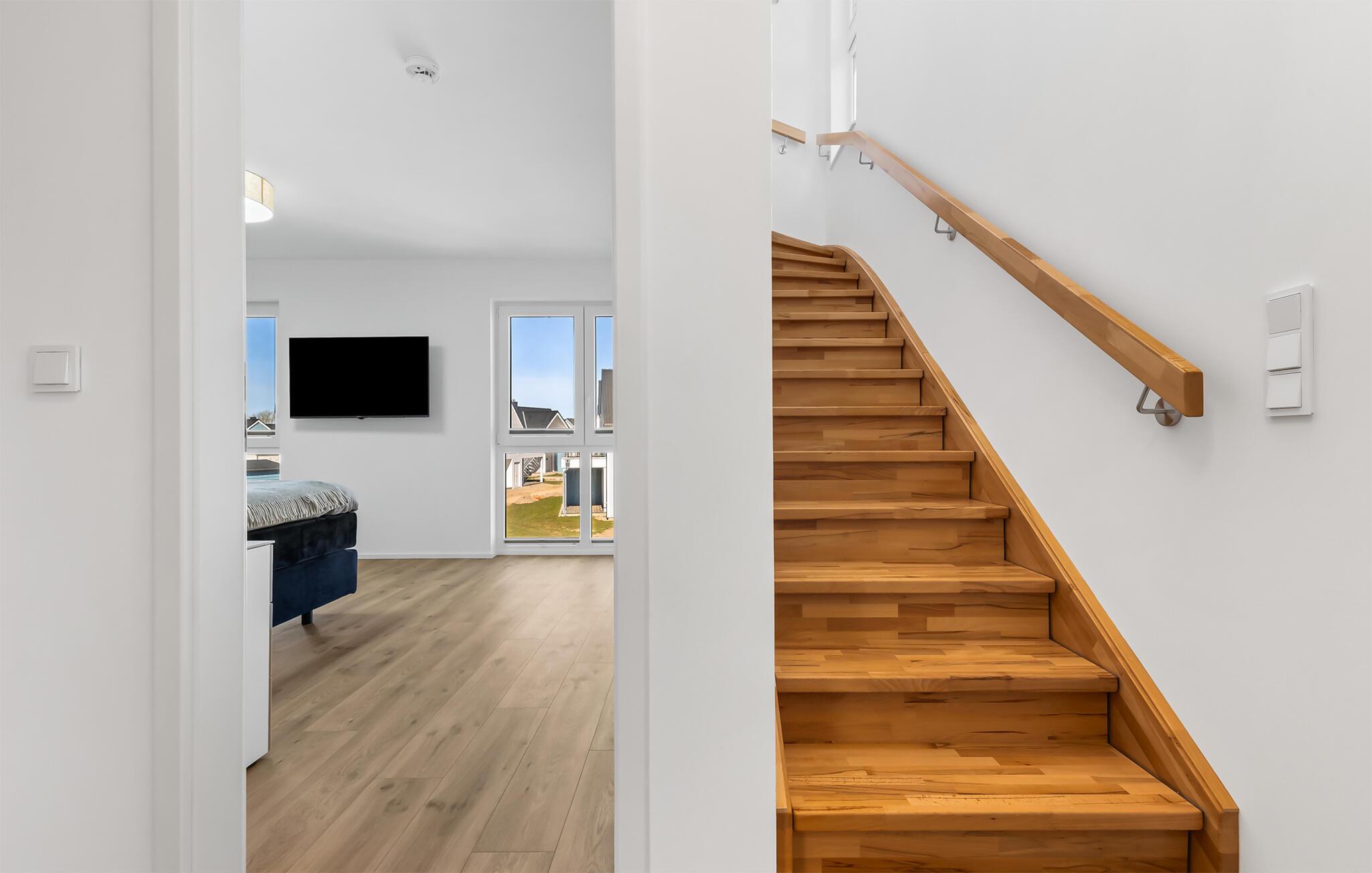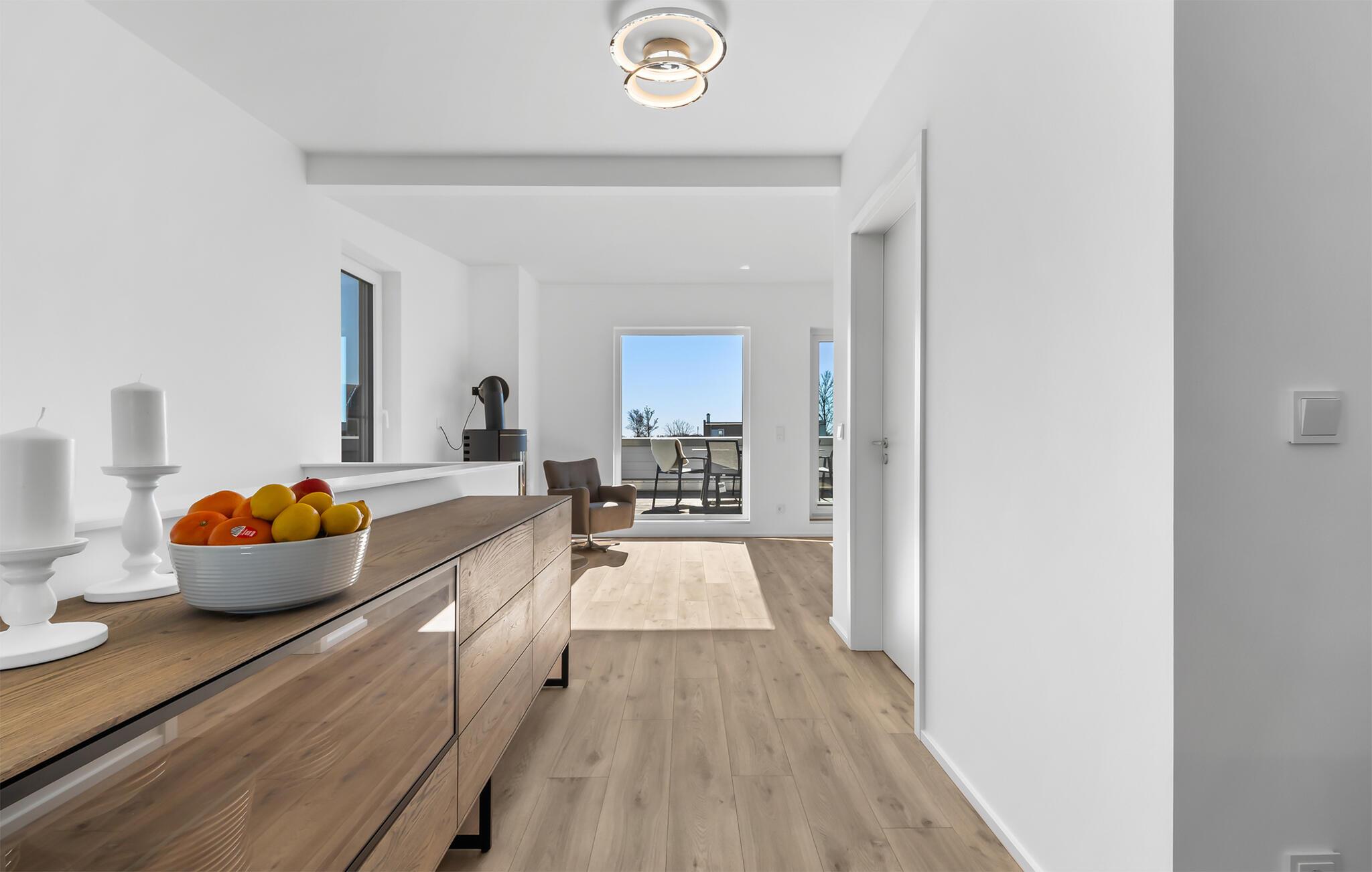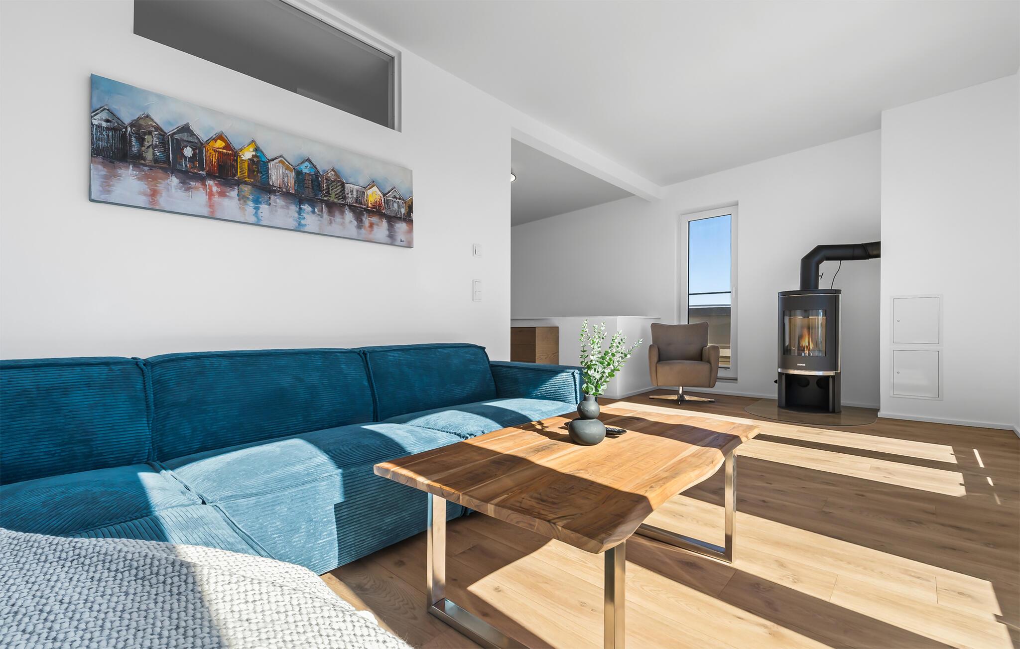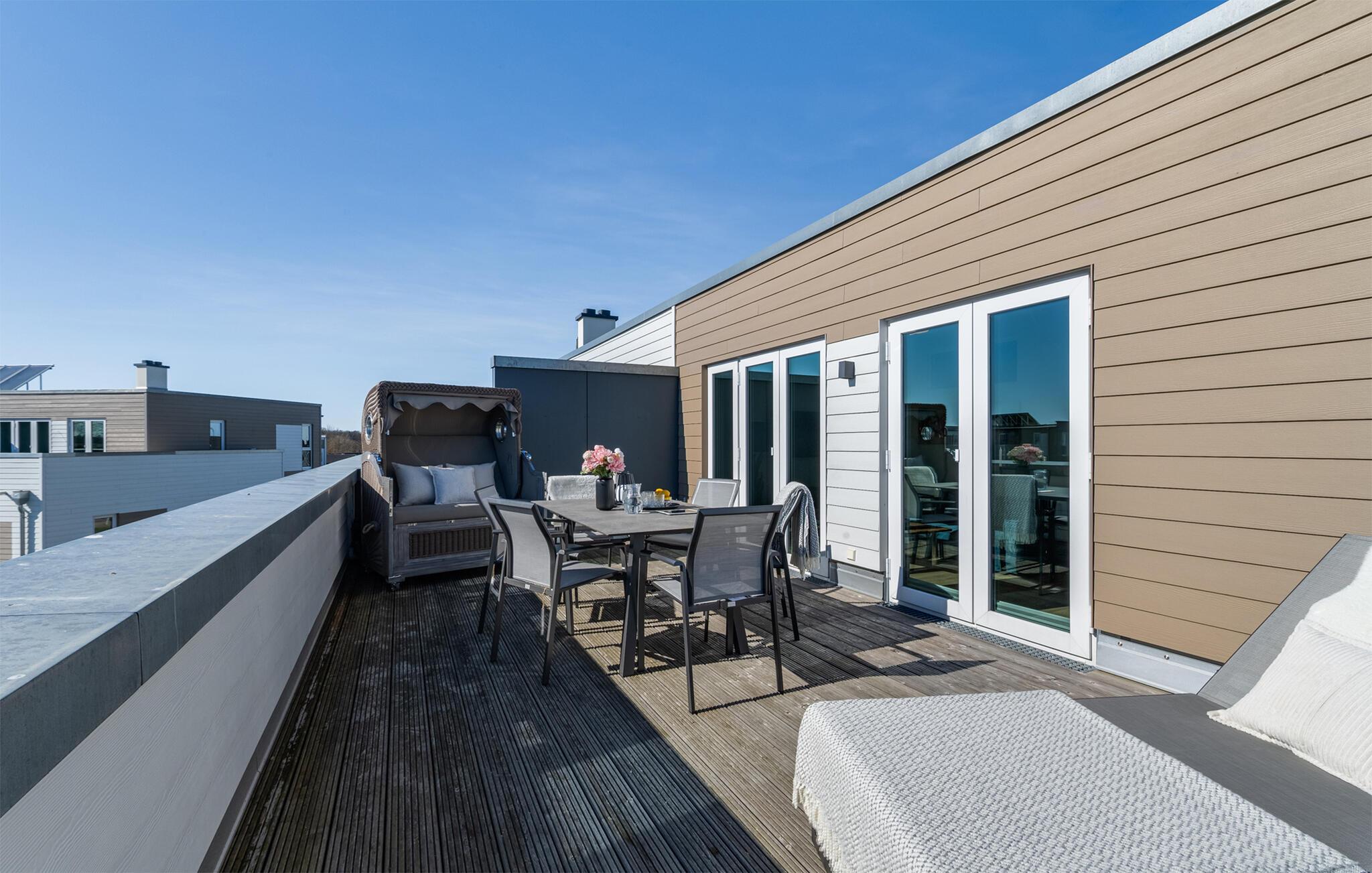VON MANDERLEY BALTIC VIEW er en stilfuld, maritim og højkvalitets møbleret maisonette ferielejlighed på 1. og 2. sal med en lysbelyst vinduesfront og en stor terrasse, hvorfra I har udsigt til de naturbeskyttede strandenge og Østersøen. Hav. Hyggelig afslapning med BALTIC VIEW. Når I træder ind i ferielejligheden på første sal, begynder I at sætte farten ned fra første øjeblik, fordi I befinder jer direkte i lejlighedens afslapningsområde. Uanset hvilket af de tre stilfuldt indrettede soveværelser I vælger, er I garanteret en afslappende søvn. To af de tre soveværelser er udstyret med komfortable boxspring dobbeltsenge, det andet har to boxspring enkeltsenge. Der er tv i alle soveværelser, så I kan afslutte jeres vellykkede dag med at slappe af i sengen. Der er også et veludstyret badeværelse på denne etage med bruser i gulvniveau og infrarød sauna. Der er også en vaskemaskine der. Vel på anden sal lever ferielejligheden op til sit navn. Her vil I blive forkælet med en gulv-til-loft vinduesfront med den tilstødende terrasse og udsigt over de naturbevarende strandenge til Østersøen. Ren faktor! Opholdsstuen i maritim stil med den hyggelige opholdsstue indbyder til mange timer sammen. Hvis vejret tager en nordlig drejning, vil pejsen skabe en hyggelig atmosfære. Stuen er også udstyret med et fjernsyn. Det integrerede køkken med spiseplads til 6 personer er perfekt udstyret. På den store terrasse med sydvendt orientering og drømmeudsigt kan I arrangere hyggelige grillaftener eller nyde solen på liggestolen. Et andet badeværelse med ekstra toilet, håndvask og badekar byder på plads nok og alternative muligheder til flere personer og afrunder udstyret i denne velværeoase, som sikrer afslapning på ethvert tidspunkt af året. Kunne I tænke jer at rejse med to biler? Det er ikke noget problem, for VON MANDERLEY BALTIC VIEW har to parkeringspladser lige foran huset. I finder også plads nok til cykler eller barnevogn i cykelskuret. Den naturlige sandstrand Weidefelder med kiosk, restaurant, strandstole og forskellige muligheder for vandsport kan nås på få hundrede meter. I umiddelbar nærhed er der også den fantasifuldt designede Adventure Golf minigolfbane og lystbådehavnen i OstseeResort Olpenitz med forskellige indkøbsmuligheder. Resortets beliggenhed direkte mellem mundingen af Slime og Østersøen og tæt på den smukke by Kappeln byder også på en række forskellige udflugtsmuligheder med båd, cykel eller til fods. Vores foretrukne sted: den store terrasse med udsigt over Østersøen over de naturbevarende strandenge. BALTISK UDSIGT. Bemærk: Sommerhuset er stadig ved at blive færdiggjort. Billeder af huset, indretning og indretning blev visualiseret med venlig støtte fra Helma Ferienimmobilien. Feriehuset adskiller sig i indretningsstil. Bemærk venligst: OstseeResort Olpenitz er meget populært, og der bygges fortsat i parken. Ikke desto mindre kan I se frem til en 5-stjernet standard og et førsteklasses ophold. Byggeaktiviteterne kommer ikke til at forstyrre jer på ferien, og derfor gives der ikke yderligere afslag i prisen.