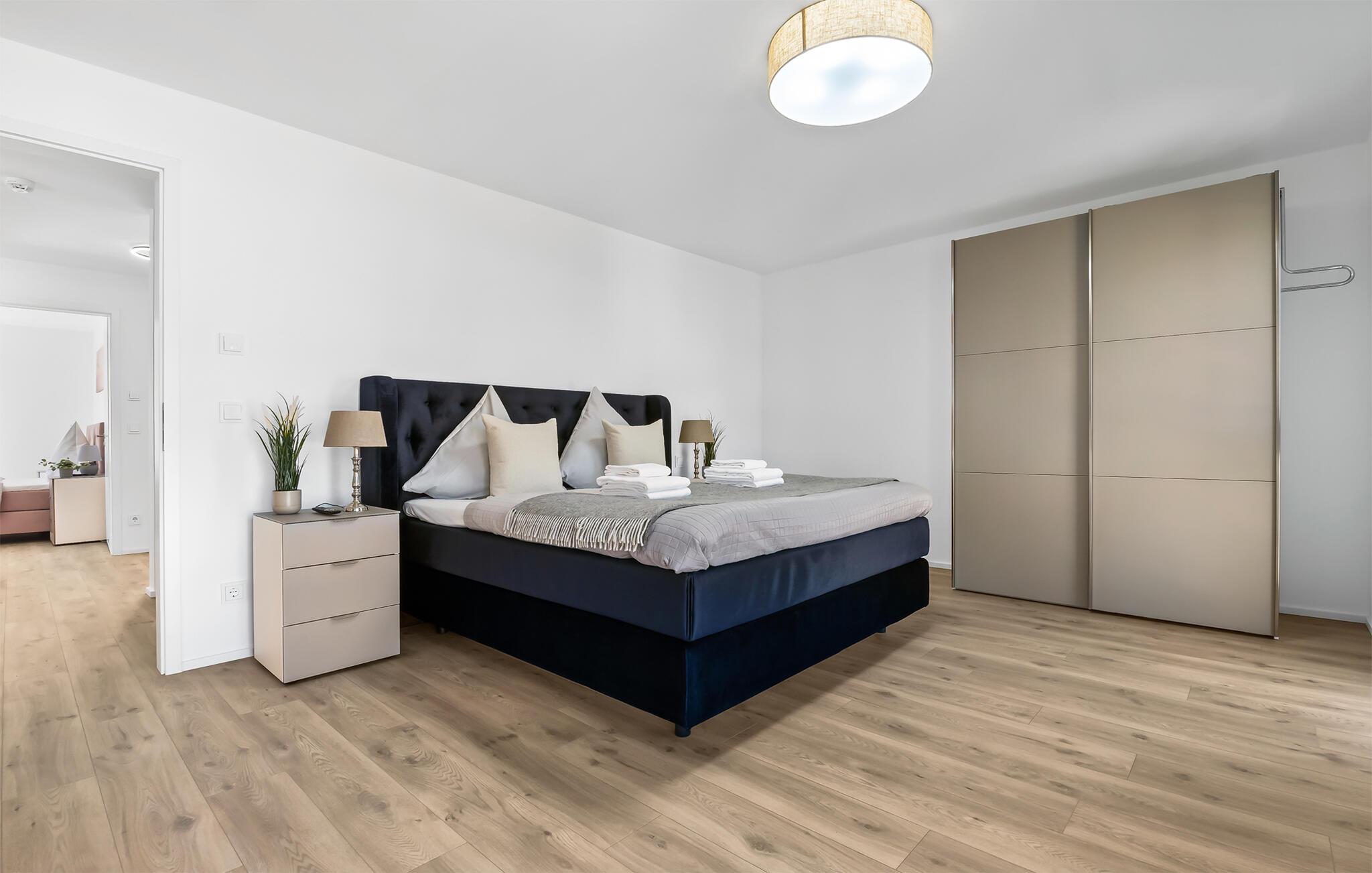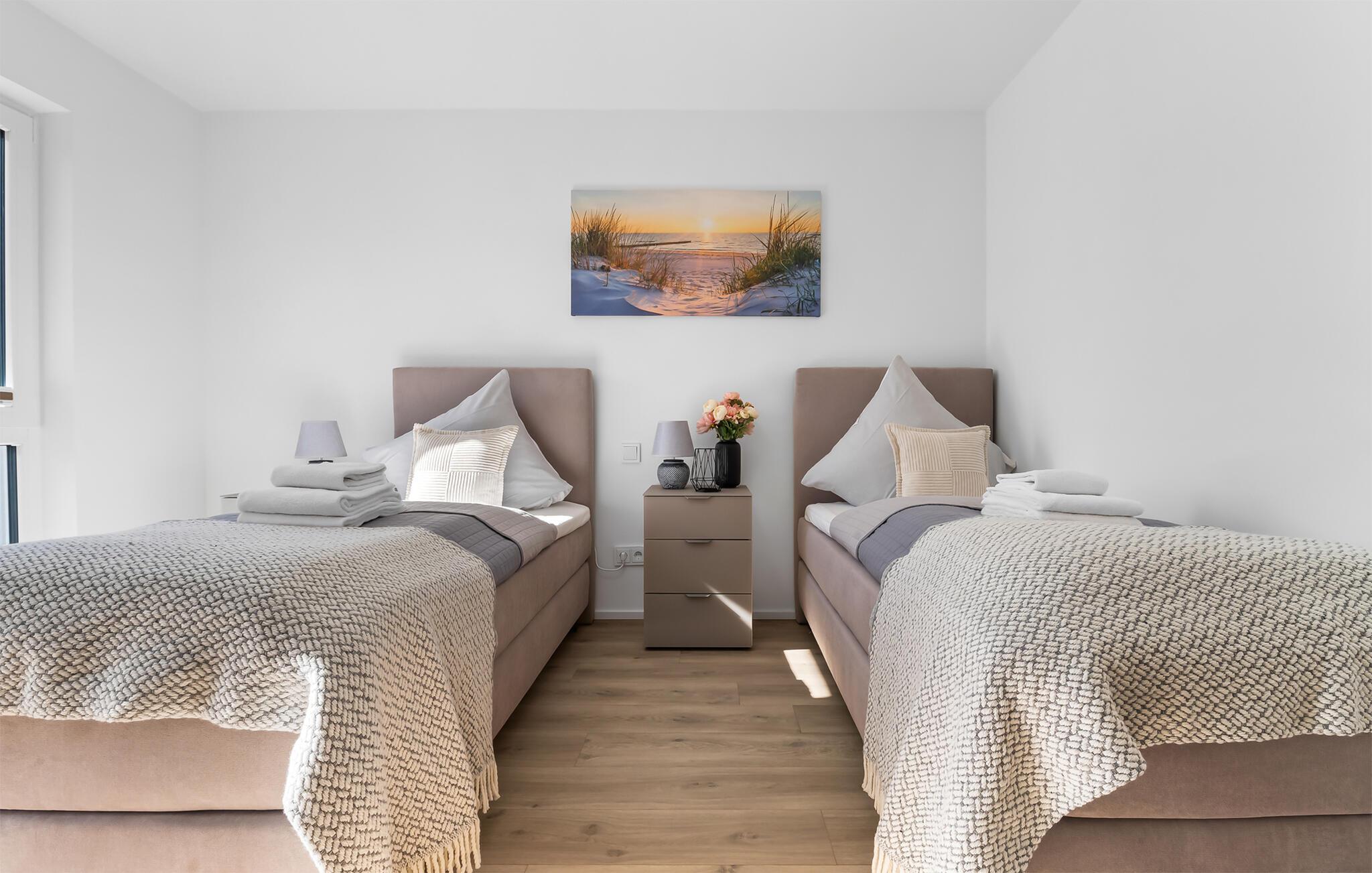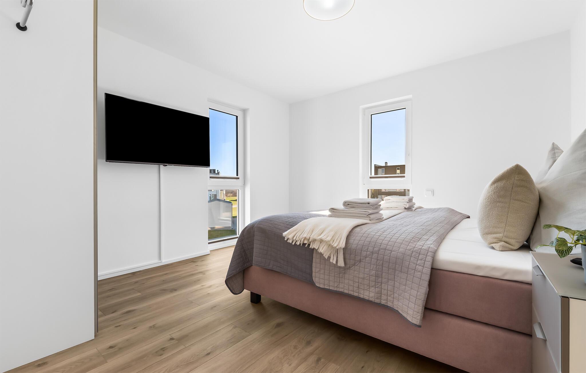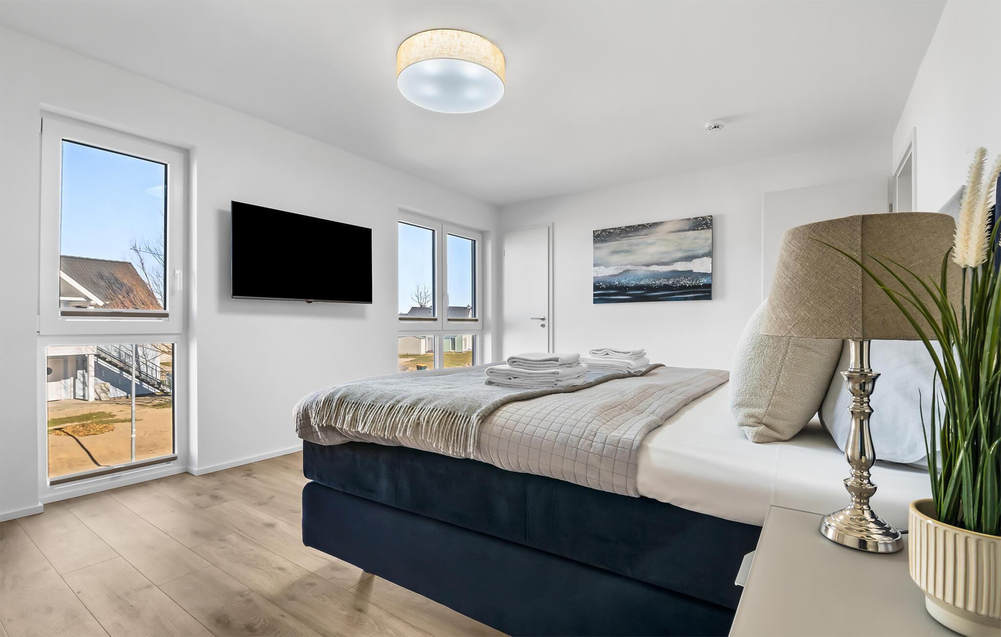 VON MANDERLEY BALTIC VIEW er en stilfuld, maritim og højkvalitets møbleret maisonette ferielejlighed på 1. og 2. sal med en lysbelyst vinduesfront og en stor terrasse, hvorfra I har udsigt til de naturbeskyttede strandenge og Østersøen. Hav. Hyggelig afslapning med BALTIC VIEW. Når I træder ind i ferielejligheden på første sal, begynder I at sætte farten ned fra første øjeblik, fordi I befinder jer direkte i lejlighedens afslapningsområde. Uanset hvilket af de tre stilfuldt indrettede soveværelser I vælger, er I garanteret en afslappende søvn. To af de tre soveværelser er udstyret med komfortable boxspring dobbeltsenge, det andet har to boxspring enkeltsenge. Der er tv i alle soveværelser, så I kan afslutte jeres vellykkede dag med at slappe af i sengen. Der er også et veludstyret badeværelse på denne etage med bruser i gulvniveau og infrarød sauna. Der er også en vaskemaskine der. Vel på anden sal lever ferielejligheden op til sit navn. Her vil I blive forkælet med en gulv-til-loft vinduesfront med den tilstødende terrasse og udsigt over de naturbevarende strandenge til Østersøen. Ren faktor! Opholdsstuen i maritim stil med den hyggelige opholdsstue indbyder til mange timer sammen. Hvis vejret tager en nordlig drejning, vil pejsen skabe en hyggelig atmosfære. Stuen er også udstyret med et fjernsyn. Det integrerede køkken med spiseplads til 6 personer er perfekt udstyret. På den store terrasse med sydvendt orientering og drømmeudsigt kan I arrangere hyggelige grillaftener eller nyde solen på liggestolen. Et andet badeværelse med ekstra toilet, håndvask og badekar byder på plads nok og alternative muligheder til flere personer og afrunder udstyret i denne velværeoase, som sikrer afslapning på ethvert tidspunkt af året. Kunne I tænke jer at rejse med to biler? Det er ikke noget problem, for VON MANDERLEY BALTIC VIEW har to parkeringspladser lige foran huset. I finder også plads nok til cykler eller barnevogn i cykelskuret. Den naturlige sandstrand Weidefelder med kiosk, restaurant, strandstole og forskellige muligheder for vandsport kan nås på få hundrede meter. I umiddelbar nærhed er der også den fantasifuldt designede Adventure Golf minigolfbane og lystbådehavnen i OstseeResort Olpenitz med forskellige indkøbsmuligheder. Resortets beliggenhed direkte mellem mundingen af Slime og Østersøen og tæt på den smukke by Kappeln byder også på en række forskellige udflugtsmuligheder med båd, cykel eller til fods. Vores foretrukne sted: den store terrasse med udsigt over Østersøen over de naturbevarende strandenge. BALTISK UDSIGT. Bemærk: Sommerhuset er stadig ved at blive færdiggjort. Billeder af huset, indretning og indretning blev visualiseret med venlig støtte fra Helma Ferienimmobilien. Feriehuset adskiller sig i indretningsstil. Bemærk venligst: OstseeResort Olpenitz er meget populært, og der bygges fortsat i parken. Ikke desto mindre kan I se frem til en 5-stjernet standard og et førsteklasses ophold. Byggeaktiviteterne kommer ikke til at forstyrre jer på ferien, og derfor gives der ikke yderligere afslag i prisen.